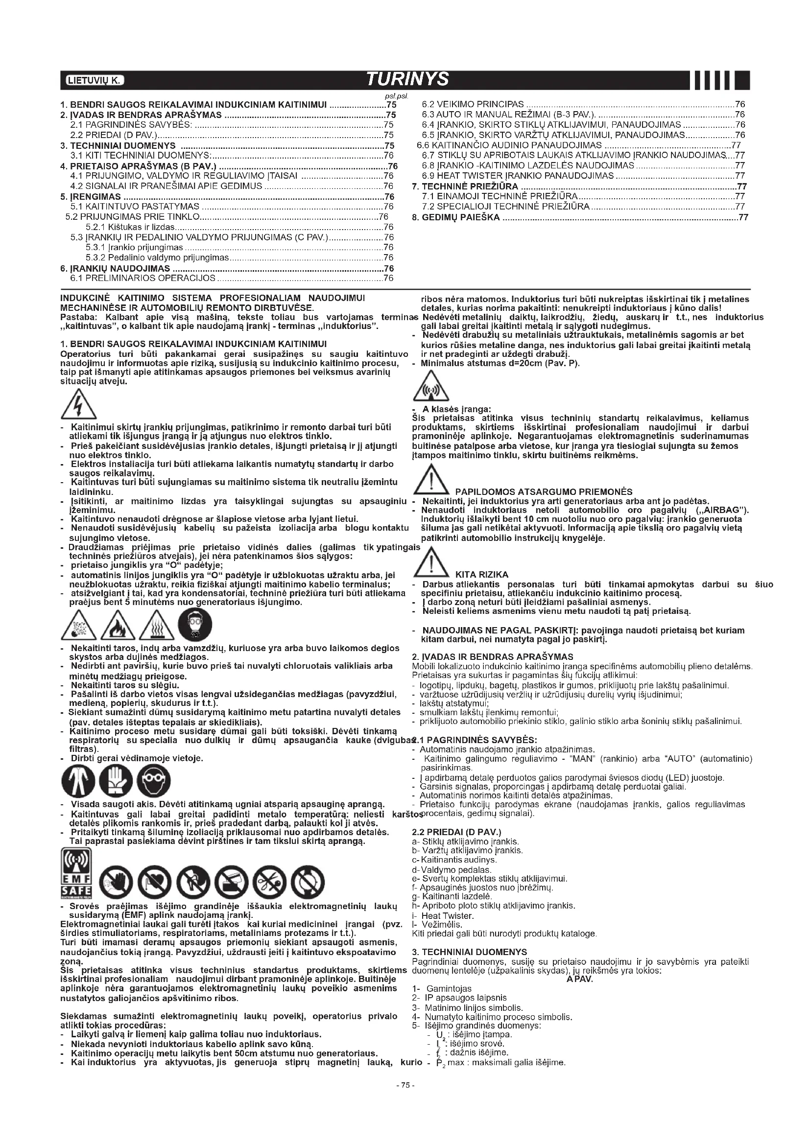 MECHANINĖSEIRAUTOMOBILIŲREMONTODIRBTUVĖSE. Pastaba: Kalbant apie visą mašiną, tekste toliau bus vartojamas terminas ,,kaitintuvas”,okalbanttikapienaudojamąįrankį-terminas,,induktorius”. 1.BENDRISAUGOSREIKALAVIMAIINDUKCINIAMKAITINIMUI Operatorius turi būti pakankamai gerai susipažinęs su saugiu kaitintuvo naudojimuirinformuotasapieriziką,susijusiąsuindukciniokaitinimoprocesu, taippatišmanytiapieatitinkamasapsaugospriemonesbeiveiksmusavarinių situacijųatveju. - Kaitinimuiskirtųįrankiųprijungimas,patikrinimoirremontodarbaituribūti atliekamitikišjungusįrangąirjąatjungusnuoelektrostinklo. - Priešpakeičiantsusidėvėjusiasįrankiodetales,išjungtiprietaisąirjįatjungti nuoelektrostinklo. - Elektrosinstaliacijaturibūtiatliekamalaikantisnumatytųstandartųirdarbo saugosreikalavimų. - Kaitintuvasturibūtisujungiamassumaitinimosistematikneutraliuįžemintu laidininku. - Įsitikinti, ar maitinimo lizdas yra taisyklingai sujungtas su apsauginiu įžeminimu. - Kaitintuvonenaudotidrėgnosearšlapiosevietosearbalyjantlietui. - Nenaudotisusidėvėjusių kabelių supažeista izoliacijaarba blogukontaktu sujungimovietose. -Draudžiamas priėjimas prie prietaiso vidinės dalies (galimas tikypatingais techninėspriežiūrosatvejais),jeinėrapatenkinamosšiossąlygos: - prietaisojungiklisyra“O“padėtyje; - automatinislinijosjungiklisyra“O“padėtyjeiružblokuotasužraktuarba,jei neužblokuotasužraktu,reikiaziškaiatjungtimaitinimokabelioterminalus; - atsižvelgiantįtai,kadyrakondensatoriai,techninėpriežiūraturibūtiatliekama praėjusbent5minutėmsnuogeneratoriausišjungimo. - Nekaitintitaros,indųarbavamzdžių,kuriuoseyraarbabuvolaikomosdegios skystosarbadujinėsmedžiagos. - Nedirbtiantpaviršių,kuriebuvoprieštainuvalytichloruotaisvalikliaisarba minėtųmedžiagųprieigose. - Nekaitintitarossuslėgiu. - Pašalintiišdarbovietosvisaslengvaiužsidegančiasmedžiagas(pavyzdžiui, medieną,popierių,skudurusirt.t.). -Siekiantsumažintidūmųsusidarymąkaitinimometupatartinanuvalytidetales (pav.detalesišteptastepalaisarskiedikliais). - Kaitinimo proceso metu susidarę dūmai gali būti toksiški. Dėvėti tinkamą respiratorių suspecialia nuodulkių ir dūmų apsaugančia kauke(dvigubas ltras). - Dirbtigeraivėdinamojevietoje. - Visadasaugotiakis.Dėvėtiatitinkamąugniaiatspariąapsauginęaprangą. - Kaitintuvas gali labai greitai padidinti metalo temperatūrą: neliesti karštos detalėsplikomisrankomisir,priešpradedantdarbą,palauktikoljiatvės. - Pritaikytitinkamąšiluminęizoliacijąpriklausomainuoapdirbamosdetalės. Taipaprastaipasiekiamadėvintpirštinesirtamtiksluiskirtąaprangą. - Srovės praėjimas išėjimo grandinėje iššaukia elektromagnetinių laukų susidarymą(EMF)aplinknaudojamąįrankį. Elektromagnetiniailaukaigaliturėtiįtakos kaikuriaimedicininei įrangai (pvz. širdiesstimuliatoriams,respiratoriams,metaliniamsprotezamsirt.t.). Turi būti imamasi deramų apsaugos priemonių siekiant apsaugoti asmenis, naudojančiustokiąįrangą.Pavyzdžiui,uždraustiįeitiįkaitintuvoekspoatavimo zoną. Šis prietaisas atitinka visus techninius standartus produktams, skirtiems išskirtinaiprofesionaliam naudojimuidirbantpramoninėjeaplinkoje.Buitinėje aplinkoje nėra garantuojamos elektromagnetinių laukų poveikio asmenims nustatytosgaliojančiosapšvitinimoribos. Siekdamas sumažinti elektromagnetinių laukų poveikį, operatorius privalo atliktitokiasprocedūras: - Laikytigalvąirliemenįkaipgalimatoliaunuoinduktoriaus. - Niekadanevyniotiinduktoriauskabelioaplinksavokūną. - Kaitinimooperacijųmetulaikytisbent50cmatstumunuogeneratoriaus. - Kaiinduktorius yra aktyvuotas,jis generuoja stiprų magnetinį lauką, kurio ribosnėramatomos.Induktoriusturibūtinukreiptasišskirtinaitikįmetalines detales,kuriasnorimapakaitinti:nenukreiptiinduktoriausįkūnodalis! - Nedėvėtimetalinių daiktų,laikrodžių, žiedų, auskarųir t.t.,nes induktorius galilabaigreitaiįkaitintimetaląirsąlygotinudegimus. - Nedėvėtidrabužiųsumetaliniaisužtrauktukais,metalinėmissagomisarbet kuriosrūšiesmetalinedanga,nesinduktoriusgalilabaigreitaiįkaitintimetalą irnetpradegintiaruždegtidrabužį. - Minimalusatstumasd=20cm(Pav.P). - Aklasėsįranga: Šis prietaisas atitinka visus techninių standartų reikalavimus, keliamus produktams, skirtiems išskirtinai profesionaliam naudojimui ir darbui pramoninėje aplinkoje. Negarantuojamas elektromagnetinis suderinamumas buitinėsepatalposearbavietose,kurįrangayratiesiogiaisujungtasužemos įtamposmaitinimotinklu,skirtubuitinėmsreikmėms. PAPILDOMOSATSARGUMOPRIEMONĖS - Nekaitinti,jeiinduktoriusyraartigeneratoriausarbaantjopadėtas. - Nenaudoti induktoriaus netoli automobilio oro pagalvių (,,AIRBAG”). Induktoriųišlaikytibent10cmnuotoliunuooropagalvių:įrankiogeneruota šilumajasgalinetikėtaiaktyvuoti.Informacijąapietiksliąoropagalviųvietą patikrintiautomobilioinstrukcijųknygelėje. KITA RIZIKA - Darbusatliekantis personalas turi būti tinkamaiapmokytas darbui su šiuo speciniuprietaisu,atliekančiuindukciniokaitinimoprocesą. - Įdarbozonąneturibūtiįleidžiamipašaliniaiasmenys. - Neleistikeliemsasmenimsvienumetunaudotitąpatįprietaisą. - NAUDOJIMASNEPAGALPASKIRTĮ:pavojinganaudotiprietaisąbetkuriam kitamdarbui,neinumatytapagaljopaskirtį. 2.ĮVADASIRBENDRASAPRAŠYMAS Mobili lokalizuoto indukcinio kaitinimo įranga specinėms automobilių plieno detalėms. Prietaisas yra sukurtas ir pagamintas šių fukcijų atlikimui: - logotipų, lipdukų, bagetų, plastikos ir gumos, priklijuotų prie lakštų pašalinimui. - varžtuose užrūdijusių veržlių ir užrūdijusių durelių vyrių išjudinimui; - lakštų atstatymui; - smulkiam lakštų įlenkimų remontui; - priklijuoto automobilio priekinio stiklo, galinio stiklo arba šoninių stiklų pašalinimui. 2.1PAGRINDINĖSSAVYBĖS: - Automatinis naudojamo įrankio atpažinimas. - Kaitinimo galingumo reguliavimo - “MAN” (rankinio) arba “AUTO” (automatin