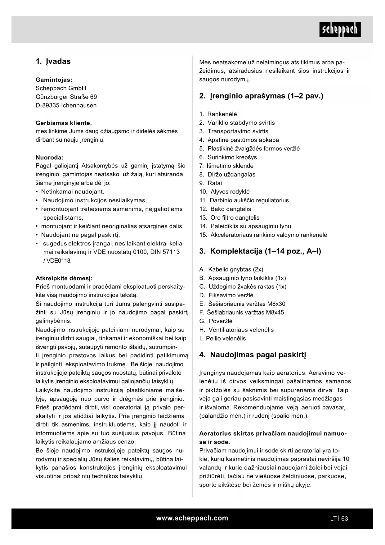 - sugedus elektros įrangai, nesilaikant elektrai kelia- mai reikalavimų ir VDE nuostatų 0100, DIN 57113 / VDE0113. Atkreipkite dėmesį: Prieš montuodami ir pradėdami eksploatuoti perskaity- kite visą naudojimo instrukcijos tekstą. Ši naudojimo instrukcija turi Jums palengvinti susipa- žinti su Jūsų įrenginiu ir jo naudojimo pagal paskirtį galimybėmis. Naudojimo instrukcijoje pateikiami nurodymai, kaip su įrenginiu dirbti saugiai, tinkamai ir ekonomiškai bei kaip išvengti pavojų, sutaupyti remonto išlaidų, sutrumpin- ti įrenginio prastovos laikus bei padidinti patikimumą ir pailginti eksploatavimo trukmę. Be šioje naudojimo instrukcijoje pateiktų saugos nuostatų, būtinai privalote laikytis įrenginio eksploatavimui galiojančių taisyklių. Laikykite naudojimo instrukciją plastikiniame maiše- lyje, apsaugoję nuo purvo ir drėgmės prie įrenginio. Prieš pradėdami dirbti, visi operatoriai ją privalo per- skaityti ir jos atidžiai laikytis. Prie įrenginio leidžiama dirbti tik asmenims, instruktuotiems, kaip jį naudoti ir informuotiems apie su tuo susijusius pavojus. Būtina laikytis reikalaujamo amžiaus cenzo. Be šioje naudojimo instrukcijoje pateiktų saugos nu- rodymų ir specialių Jūsų šalies reikalavimų, būtina lai- kytis panašios konstrukcijos įrenginių eksploatavimui visuotinai pripažintų technikos taisyklių.www.scheppach.com