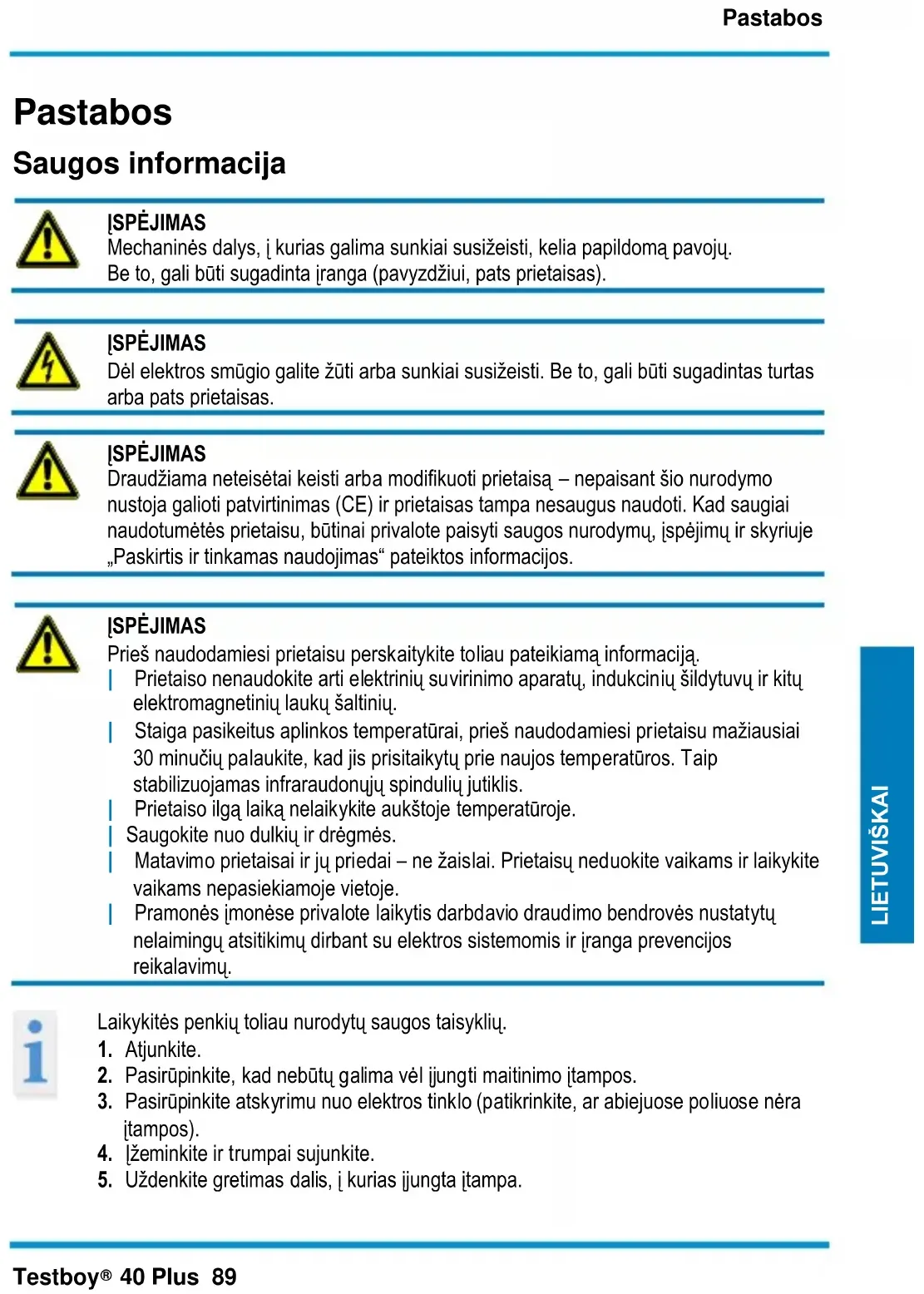 ĮSPĖJIMAS Prieš naudodamiesi prietaisu perskaitykite toliau pateikiamą informaciją. | Prietaiso nenaudokite arti elektrinių suvirinimo aparatų, indukcinių šildytuvų ir kitų elektromagnetinių laukų šaltinių. | Staiga pasikeitus aplinkos temperatūrai, prieš naudodamiesi prietaisu mažiausiai 30 minučių palaukite, kad jis prisitaikytų prie naujos temperatūros. Taip stabilizuojamas infraraudonųjų spindulių jutiklis. | Prietaiso ilgą laiką nelaikykite aukštoje temperatūroje. | Saugokite nuo dulkių ir drėgmės. | Matavimo prietaisai ir jų priedai – ne žaislai. Prietaisų neduokite vaikams ir laikykite vaikams nepasiekiamoje vietoje. | Pramonės įmonėse privalote laikytis darbdavio draudimo bendrovės nustatytų nelaimingų atsitikimų dirbant su elektros sistemomis ir įranga prevencijos reikalavimų.