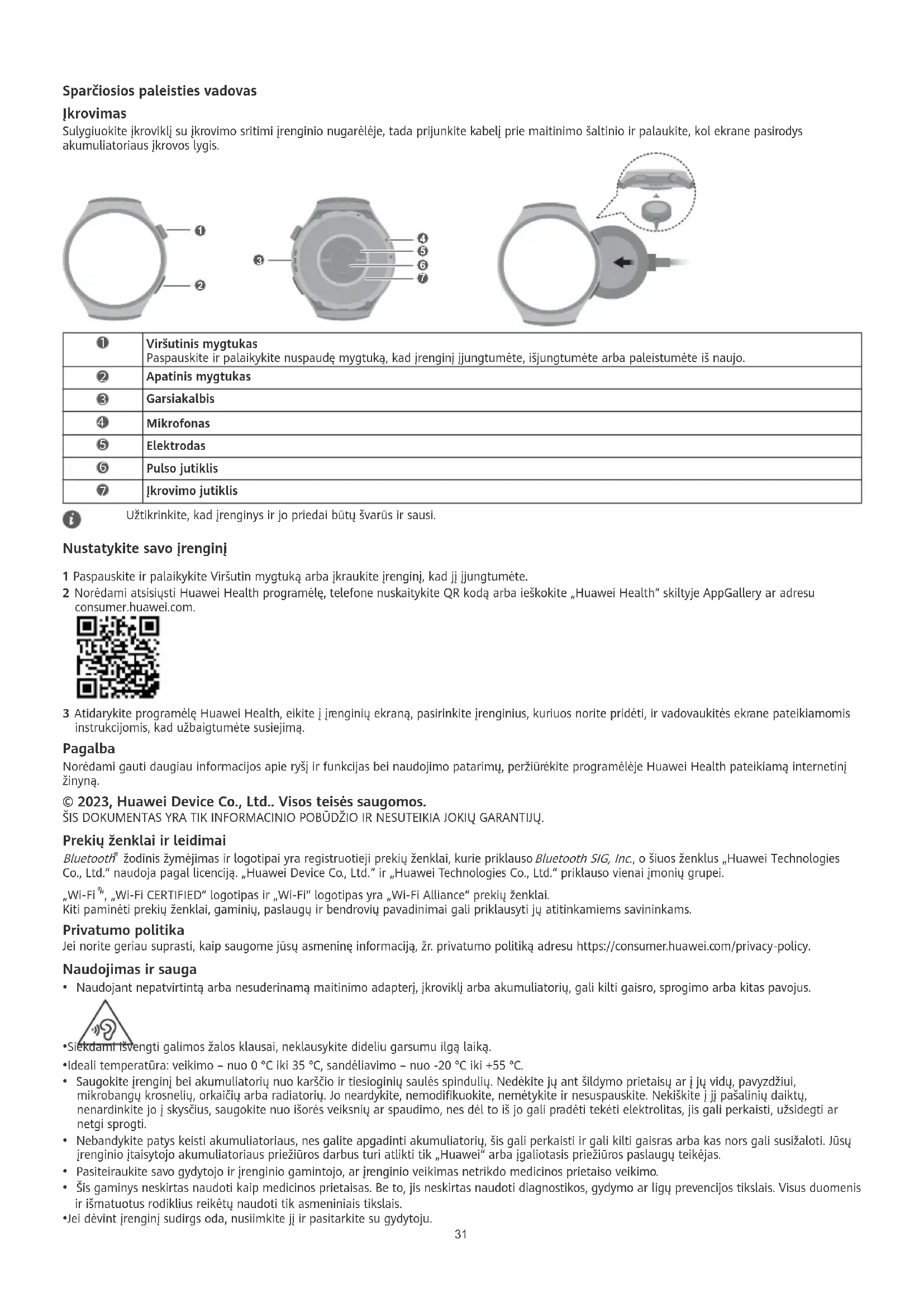 Įkrovimo jutiklis Užtikrinkite, kad įrenginys ir jo priedai būtų švarūs ir sausi. Nustatykite savo įrenginį 1 Paspauskite ir palaikykite Viršutin mygtuką arba įkraukite įrenginį, kad jį įjungtumėte. 2 Norėdami atsisiųsti Huawei Health programėlę, telefone nuskaitykite QR kodą arba ieškokite „Huawei Health“ skiltyje AppGallery ar adresu consumer.huawei.com. 3 Atidarykite programėlę Huawei Health, eikite į įrenginių ekraną, pasirinkite įrenginius, kuriuos norite pridėti, ir vadovaukitės ekrane pateikiamomis instrukcijomis, kad užbaigtumėte susiejimą. Pagalba Norėdami gauti daugiau informacijos apie ryšį ir funkcijas bei naudojimo patarimų, peržiūrėkite programėlėje Huawei Health pateikiamą internetinį žinyną. © 2023, Huawei Device Co., Ltd.. Visos teisės saugomos. ŠIS DOKUMENTAS YRA TIK INFORMACINIO POBŪDŽIO IR NESUTEIKIA JOKIŲ GARANTIJŲ. Prekių ženklai ir leidimai Bluetooth