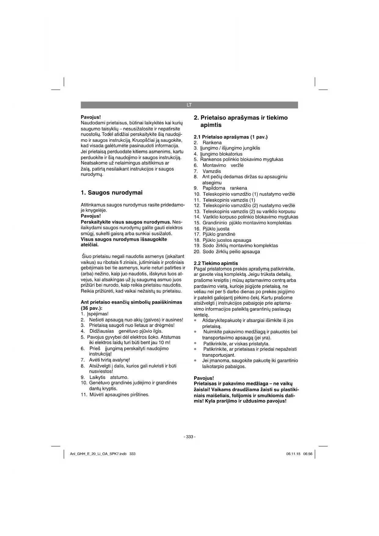 Jei įmanoma, saugokite pakuotę iki garantinio laikotarpio pabaigos. Pavojus! Prietaisas ir pakavimo medžiaga – ne vaikų žaislai! Vaikams draudžiama žaisti su plastiki- niais maišeliais, folijomis ir smulkiomis dali- mis! Kyla prarijimo ir uždusimo pavojus! Anl_GHH_E_20_Li_OA_SPK7.indb 333Anl_GHH_E_20_Li_OA_SPK7.indb 333 06.11.15 06:5606.11.15 06:56LT