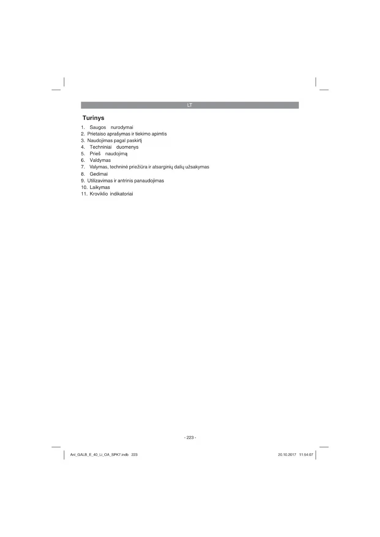 Tik ES šalims Elektros prietaisų neišmeskite kartu su buitinėmis atliekomis! Remiantis ES elektros ir elektronikos atliekų direktyva 2012/19/EB ir jos perkėlimu į nacionalinę teisinę bazę, panaudotus elektros prietaisus reikia surinkti ir perdirbti nekenkiant aplinkai. Perdirbimas - grąžinimo alternatyva: Elektros prietaiso savininkas įpareigotas negrąžinti pasirinktą prietaisą, bet tinkamai jį utilizuoti. Tuo tikslu elektros ir elektronikos atliekos gali būti perduotos atliekų tvarkymu užsiimančioms įmonėms, kurios jas utilizuoja remdamiesi nacionaliniu atliekų perdirbimo pramonės ir atliekų tvarkymo įstatymu. Šis reikalavimas netaikomas elektros prietaisuose panaudotiems priedams ir pagalbinėms priemonėms, kurių sudėtyje nėra elektros dalių. Perspausdinimas ar bet koks visų gaminio dokumentų visas ar dalinis dauginimas leidžiamas tik gavus aiškų iSC GmbH leidimą. Teisę atlikti techninius pakeitimus pasiliekame sau Anl_GALB_E_40_Li_OA_SPK7.indb 229Anl_GALB_E_40_Li_OA_SPK7.indb 229 20.10.2017 11:54:0820.10.2017 11:54:08LT