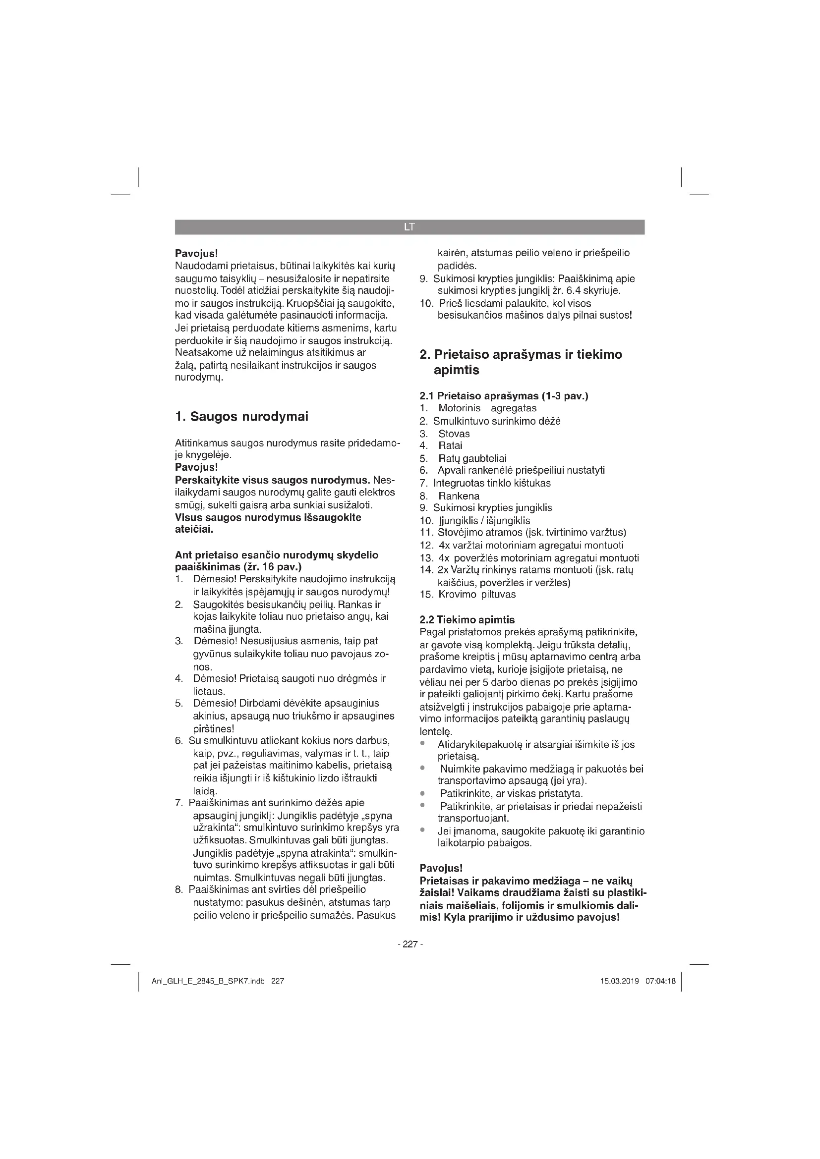 Naudokite grūstuvą (medinį) blokuojantiems daiktams šalinti iš krovimo piltuvo angos arba kablį blokuojantiems daiktams šalinti iš išmetimo angos. Pastaba: Peilio velenas smulkinamą medžiagą suspaudžia, susmulkina ir supjausto. Darant kompostą tai skatina irimo procesą. Anl_GLH_E_2845_B_SPK7.indb 229Anl_GLH_E_2845_B_SPK7.indb 229 15.03.2019 07:04:1815.03.2019 07:04:18LT
