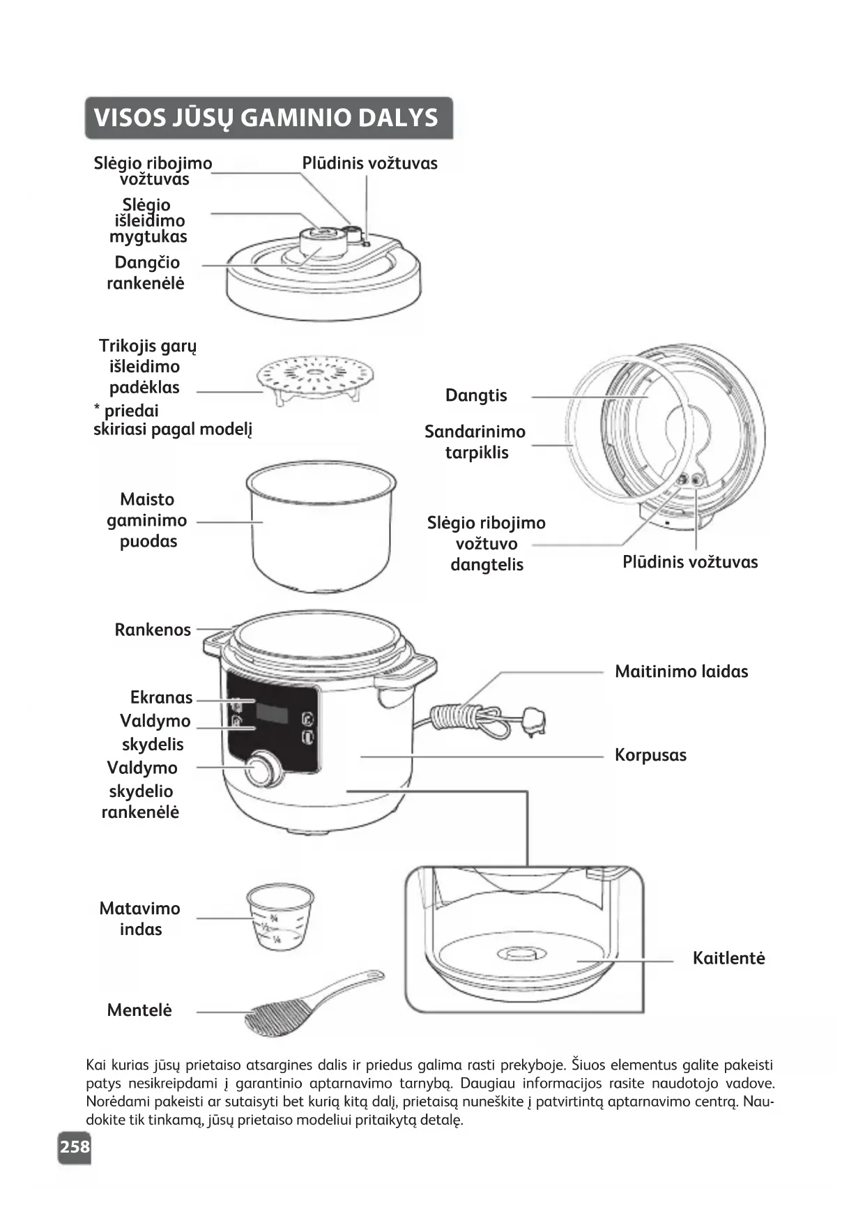 OK258 Valdymo skydelis Maisto gaminimo puodas Trikojis garų išleidimo padėklas Rankenos Ekranas Valdymo skydelio rankenėlė Matavimo indas Mentelė Kaitlentė Maitinimo laidas Korpusas Dangčio rankenėlė Slėgio išleidimo mygtukas Slėgio ribojimo vožtuvas Plūdinis vožtuvas Plūdinis vožtuvas Sandarinimo tarpiklis Slėgio ribojimo vožtuvo dangtelis Dangtis