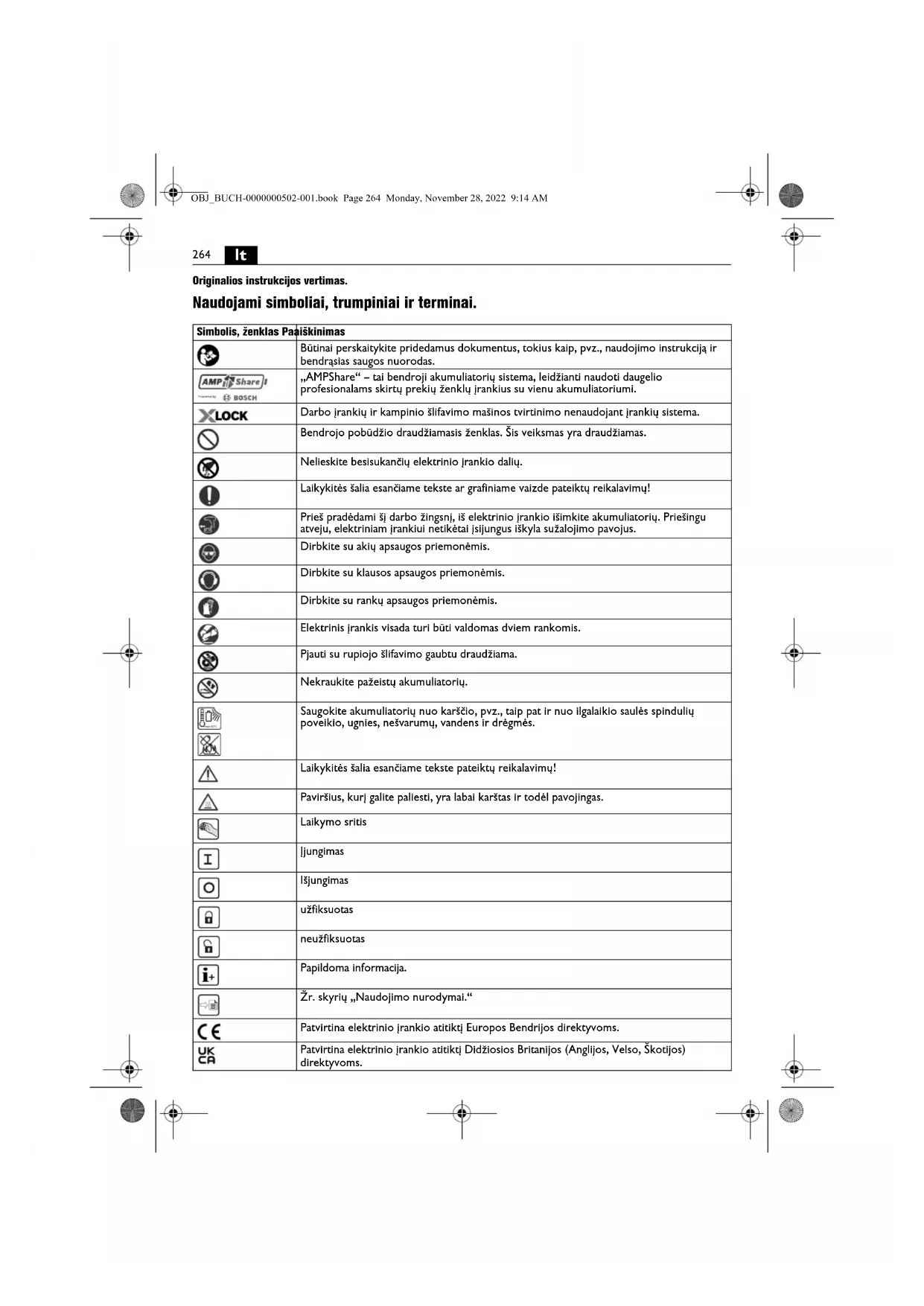 Originalios instrukcijos vertimas. Naudojami simboliai, trumpiniai ir terminai. Simbolis, ženklas Paaiškinimas Būtinai perskaitykite pridedamus dokumentus, tokius kaip, pvz., naudojimo instrukciją ir bendrąsias saugos nuorodas. „AMPShare“ – tai bendroji akumuliatorių sistema, leidžianti naudoti daugelio profesionalams skirtų prekių ženklų įrankius su vienu akumuliatoriumi. Darbo įrankių ir kampinio šlifavimo mašinos tvirtinimo nenaudojant įrankių sistema. Bendrojo pobūdžio draudžiamasis ženklas. Šis veiksmas yra draudžiamas. Nelieskite besisukančių elektrinio įrankio dalių. Laikykitės šalia esančiame tekste ar grafiniame vaizde pateiktų reikalavimų! Prieš pradėdami šį darbo žingsnį, iš elektrinio įrankio išimkite akumuliatorių. Priešingu atveju, elektriniam įrankiui netikėtai įsijungus iškyla sužalojimo pavojus. Dirbkite su akių apsaugos priemonėmis. Dirbkite su klausos apsaugos priemonėmis. Dirbkite su rankų apsaugos priemonėmis. Elektrinis įrankis visada turi būti valdomas dviem rankomis. Pjauti su rupiojo šlifavimo gaubtu draudžiama. Nekraukite pažeistų akumuliatorių. Saugokite akumuliatorių nuo karščio, pvz., taip pat ir nuo ilgalaikio saulės spindulių poveikio, ugnies, nešvarumų, vandens ir drėgmės. Laikykitės šalia esančiame tekste pateiktų reikalavimų! Paviršius, kurį galite paliesti, yra labai karštas ir todėl pavojingas. Laikymo sritis Įjungimas Išjungimas užfiksuotas neužfiksuotas Papildoma informacija. Žr. skyrių „Naudojimo nurodymai.“ Patvirtina elektrinio įrankio atitiktį Europos Bendrijos direktyvoms. Patvirtina elektrinio įrankio atitiktį Didžiosios Britanijos (Anglijos, Velso, Škotijos) direktyvoms. max.50°C OBJ_BUCH-0000000502-001.book Page 264 Monday, November 28, 2022 9:14 AM265