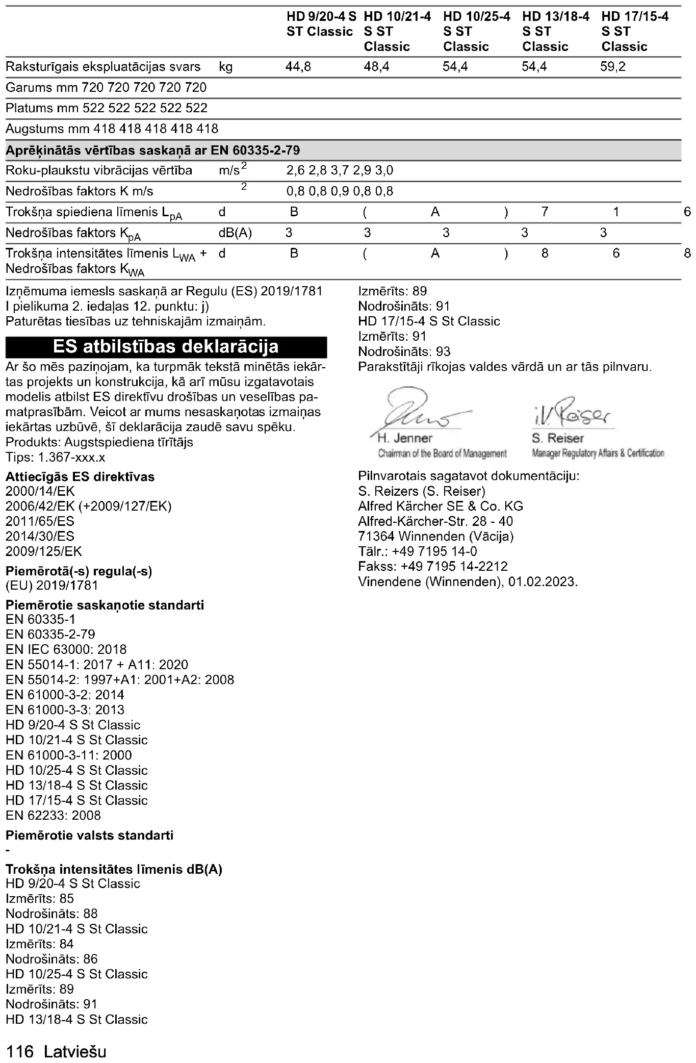 Svertinis garso galios lygis dB(A) HD 9/20-4 S St Classic Išmatuotas: 85 Garantuojamas: 88 HD 10/21-4 S St Classic Išmatuotas: 84 Garantuojamas: 86 HD 10/25-4 S St Classic Išmatuotas: 89 Garantuojamas: 91 HD 13/18-4 S St Classic Išmatuotas: 89 Garantuojamas: 91 HD 17/15-4 S St Classic Išmatuotas: 91 Garantuojamas: 93 Pasirašantys asmenys veikia pagal bendrovės vadovų įgaliojimus. Dokumentacijos tvarkytojas: S. Reiser Alfred Kärcher SE & Co. KG Alfred-Kärcher-Str. 28 - 40 71364 Vinendenas, Vokietija Tel.: +49 7195 14-0 Faks.: +49 7195 14-2212 Vinendenas, 2023 m. vasario 1 d. Alyvos rūšis Variklio aly-