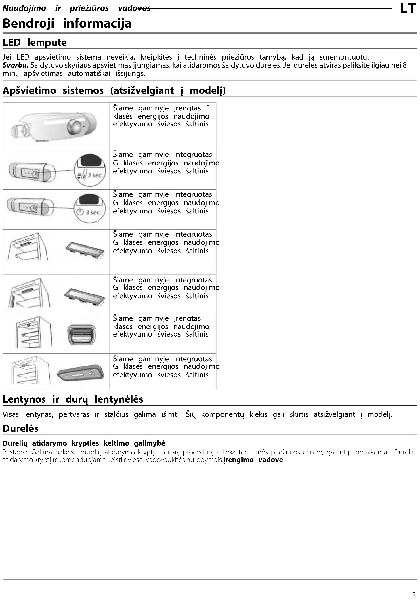 Bendroji informacija LED lemputė Jei LED apšvietimo sistema neveikia, kreipkitės į techninės priežiūros tarnybą, kad ją suremontuotų. Svarbu. Šaldytuvo skyriaus apšvietimas įjungiamas, kai atidaromos šaldytuvo durelės. Jei dureles atviras paliksite ilgiau nei 8 min., apšvietimas automatiškai išsijungs. Apšvietimo sistemos (atsižvelgiant į modelį) Šiame gaminyje įrengtas F klasės energijos naudojimo efektyvumo šviesos šaltinis Šiame gaminyje integruotas G klasės energijos naudojimo efektyvumo šviesos šaltinis Šiame gaminyje integruotas G klasės energijos naudojimo efektyvumo šviesos šaltinis Šiame gaminyje integruotas G klasės energijos naudojimo efektyvumo šviesos šaltinis Šiame gaminyje integruotas G klasės energijos naudojimo efektyvumo šviesos šaltinis Šiame gaminyje įrengtas F klasės energijos naudojimo efektyvumo šviesos šaltinis Šiame gaminyje integruotas G klasės energijos naudojimo efektyvumo šviesos šaltinis Lentynos ir durų lentynėlės Visas lentynas, pertvaras ir stalčius galima išimti. Šių komponentų kiekis gali skirtis atsižvelgiant į modelį. Durelės Durelių atidarymo krypties keitimo galimybė Pastaba: Galima pakeisti durelių atidarymo kryptį. Jei šią procedūrą atlieka techninės priežiūros centre, garantija netaikoma. Durelių atidarymo kryptį rekomenduojama keisti dviese. Vadovaukitės nurodymais Įrengimo vadove.Naudojimo ir priežiūros vadovas