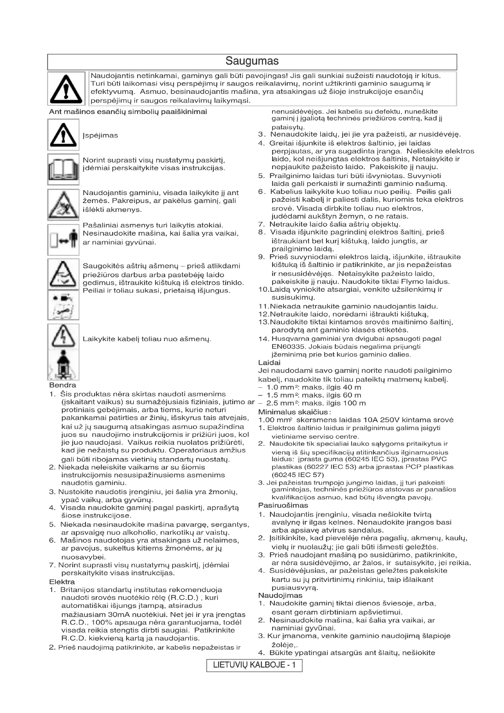 kištuką iš šaltinio ir patikrinkite, ar jis nepažeistas ir nesusidėvėjęs. Netaisykite pažeisto laido, pakeiskite jį nauju. Naudokite tiktai Flymo laidus. 10.Laidą vyniokite atsargiai, venkite užsilenkimų ir susisukimų. 11.Niekada netraukite gaminio naudojantis laidu. 12.Netraukite laido, norėdami ištraukti kištuką, 13.Naudokite tiktai kintamos srovės maitinimo šaltinį, parodytą ant gaminio klasės etiketės.