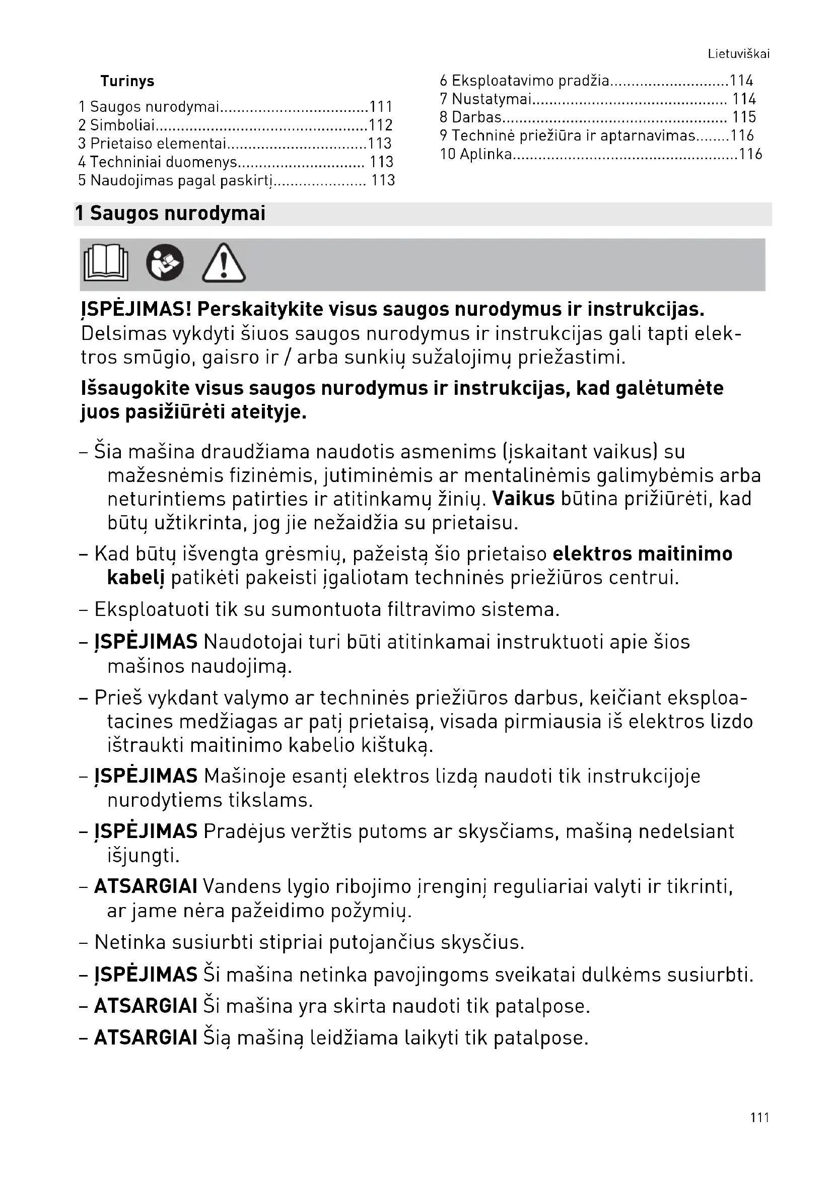 ATSARGIAI Iš siurblio veržiasi putos ir skysčiai ► Prietaisą nedelsiant išjungti ir ištuštinti.