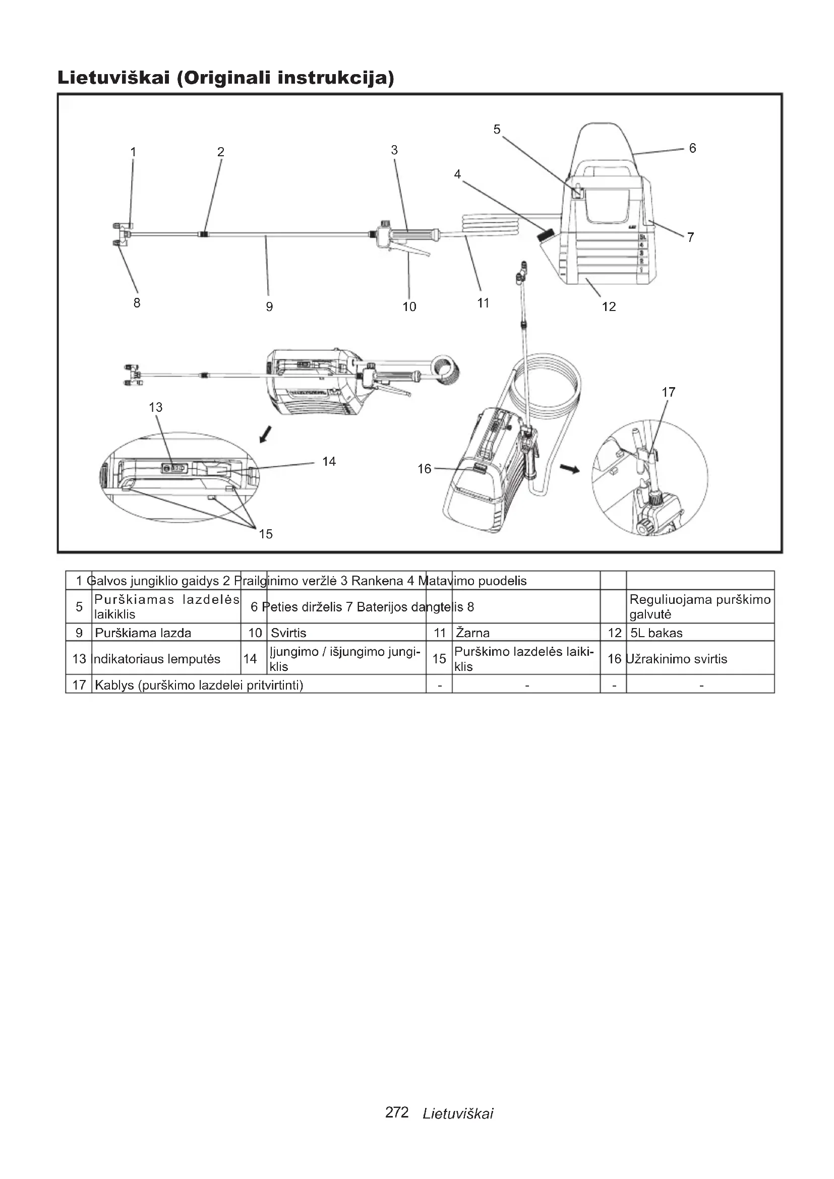 Purškiamas lazdelės laikiklis 6 Peties dirželis 7 Baterijos dangtelis 8 Reguliuojama purškimo galvutė 9 Purškiama lazda 10 Svirtis 11 Žarna 12 5L bakas 13 Indikatoriaus lemputės 14 Įjungimo / išjungimo jungi- klis