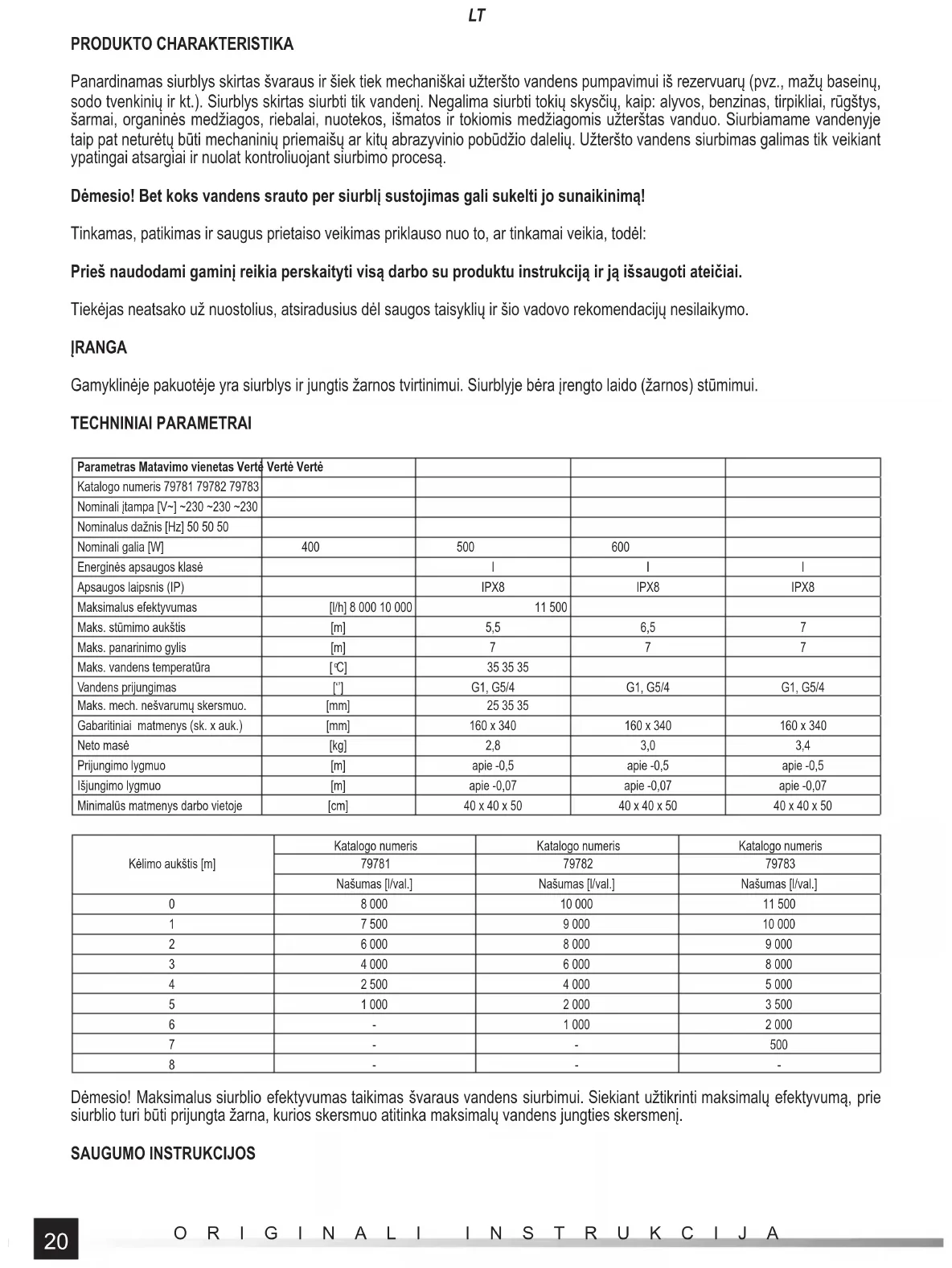 PRODUKTO CHARAKTERISTIKA Panardinamas siurblys skirtas švaraus ir šiek tiek mechaniškai užteršto vandens pumpavimui iš rezervuarų (pvz., mažų baseinų, sodo tvenkinių ir kt.). Siurblys skirtas siurbti tik vandenį. Negalima siurbti tokių skysčių, kaip: alyvos, benzinas, tirpikliai, rūgštys, šarmai, organinės medžiagos, riebalai, nuotekos, išmatos ir tokiomis medžiagomis užterštas vanduo. Siurbiamame vandenyje taip pat neturėtų būti mechaninių priemaišų ar kitų abrazyvinio pobūdžio dalelių. Užteršto vandens siurbimas galimas tik veikiant ypatingai atsargiai ir nuolat kontroliuojant siurbimo procesą. Dėmesio! Bet koks vandens srauto per siurblį sustojimas gali sukelti jo sunaikinimą! Tinkamas, patikimas ir saugus prietaiso veikimas priklauso nuo to, ar tinkamai veikia, todėl: Prieš naudodami gaminį reikia perskaityti visą darbo su produktu instrukciją ir ją išsaugoti ateičiai. Tiekėjas neatsako už nuostolius, atsiradusius dėl saugos taisyklių ir šio vadovo rekomendacijų nesilaikymo. ĮRANGA Gamyklinėje pakuotėje yra siurblys ir jungtis žarnos tvirtinimui. Siurblyje bėra įrengto laido (žarnos) stūmimui. TECHNINIAI PARAMETRAI Parametras Matavimo vienetas Vertė Vertė Vertė Katalogo numeris 79781 79782 79783 Nominali įtampa [V~] ~230 ~230 ~230 Nominalus dažnis [Hz] 50 50 50 Nominali galia [W] 400 500 600 Energinės apsaugos klasė I I I Apsaugos laipsnis (IP) IPX8 IPX8 IPX8 Maksimalus efektyvumas [l/h] 8 000 10 000 11 500 Maks. stūmimo aukštis [m] 5,5 6,5 7 Maks. panarinimo gylis [m] 7 7 7 Maks. vandens temperatūra [