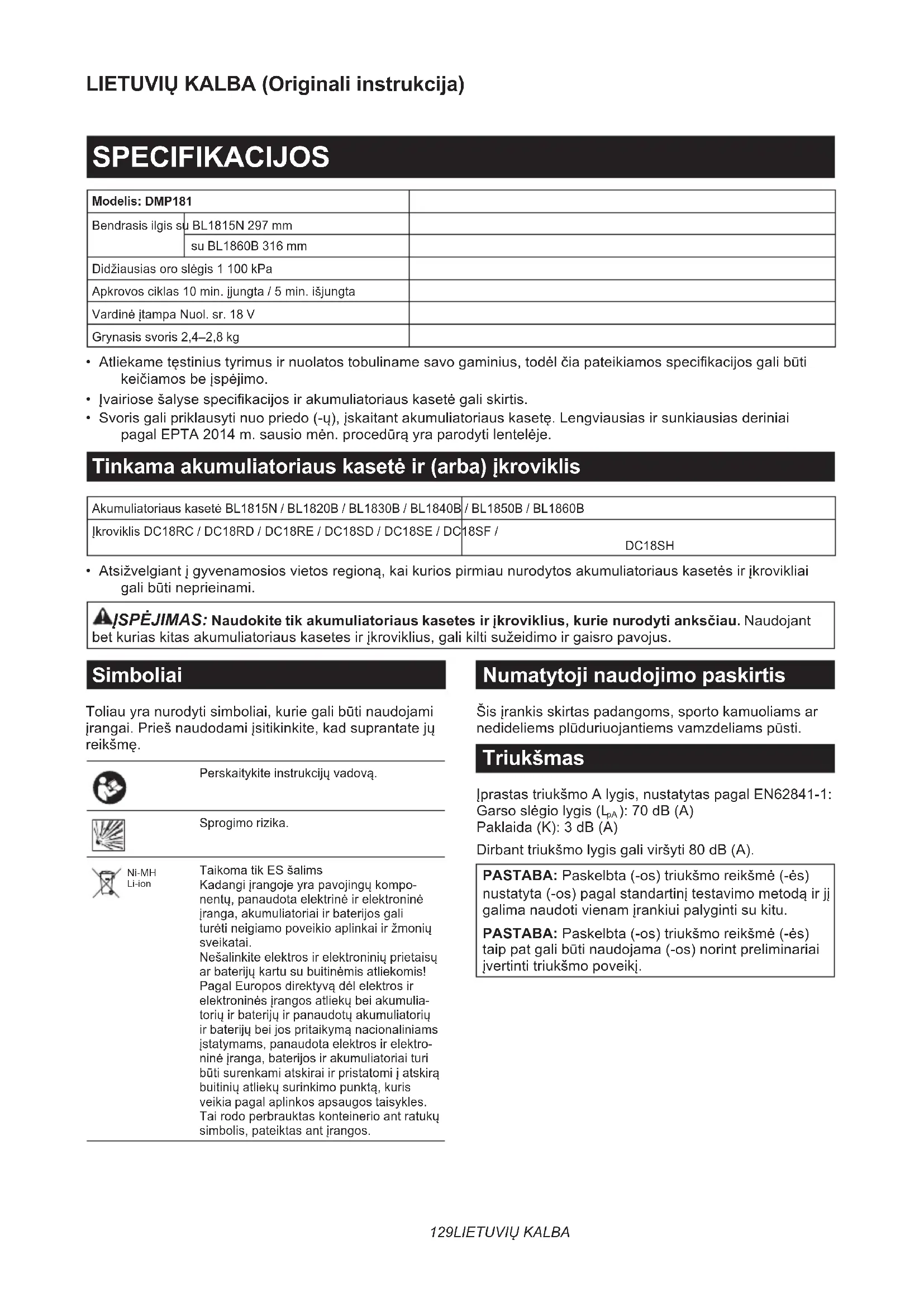 LIETUVIŲ KALBA (Originali instrukcija) SPECIFIKACIJOS Modelis: DMP181 Bendrasis ilgis su BL1815N 297 mm su BL1860B 316 mm Didžiausias oro slėgis 1 100 kPa Apkrovos ciklas 10 min. įjungta / 5 min. išjungta Vardinė įtampa Nuol. sr. 18 V Grynasis svoris 2,4–2,8 kg