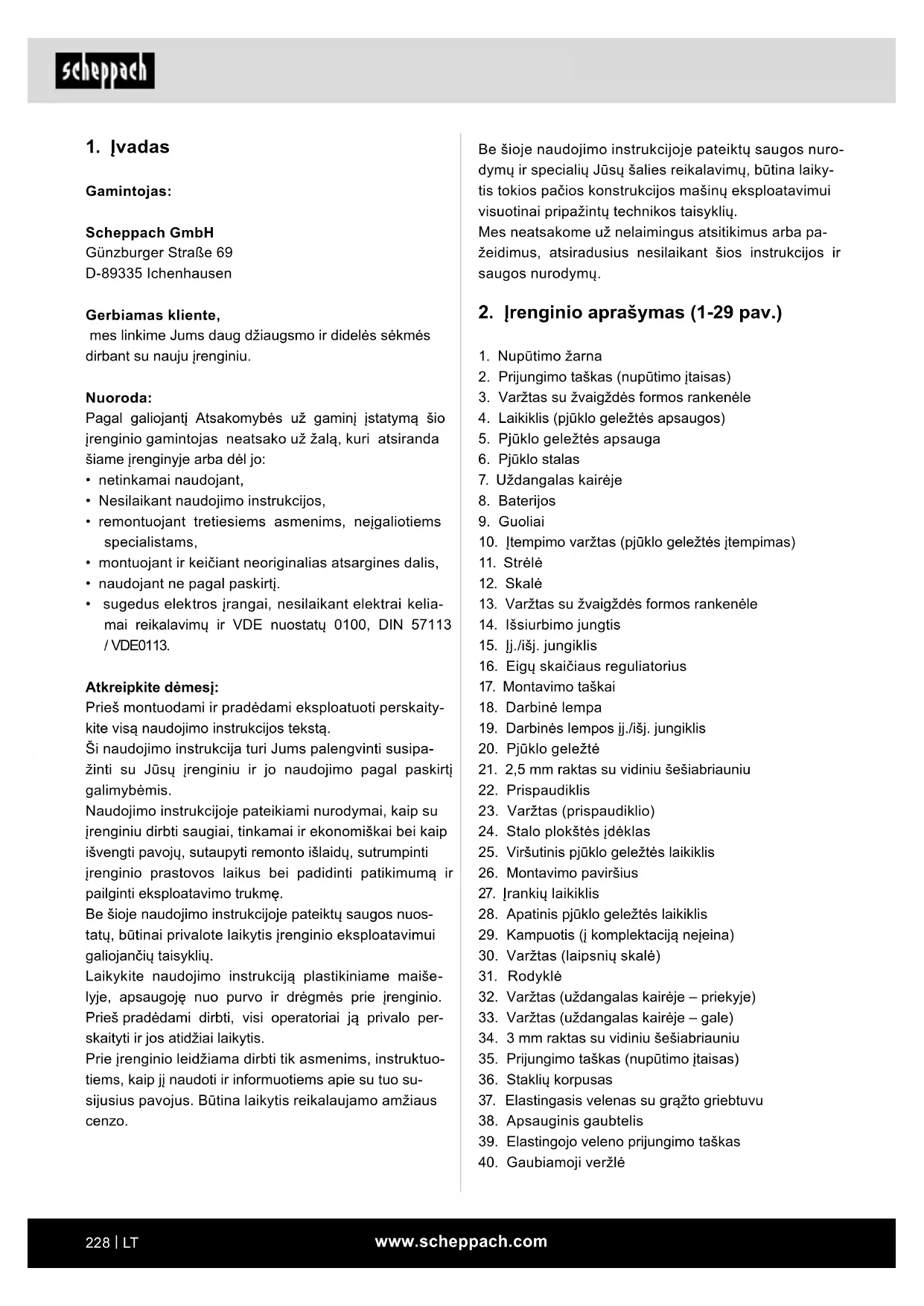 Gamintojas: Scheppach GmbH Günzburger Straße 69 D-89335 Ichenhausen Gerbiamas kliente, mes linkime Jums daug džiaugsmo ir didelės sėkmės dirbant su nauju įrenginiu. Nuoroda: Pagal galiojantį Atsakomybės už gaminį įstatymą šio įrenginio gamintojas neatsako už žalą, kuri atsiranda šiame įrenginyje arba dėl jo: