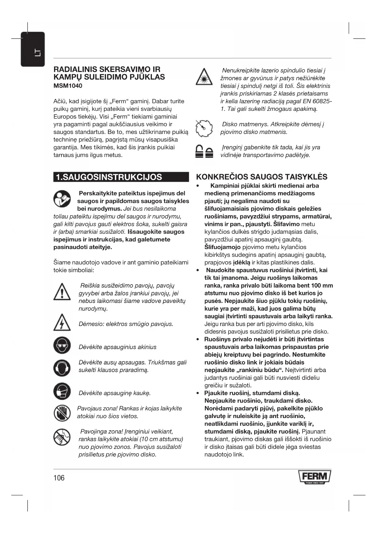 MSM1040 Ačiū, kad įsigijote šį „Ferm“ gaminį. Dabar turite puikų gaminį, kurį pateikia vieni svarbiausių Europos tiekėjų. Visi „Ferm“ tiekiami gaminiai yra pagaminti pagal aukščiausius veikimo ir saugos standartus. Be to, mes užtikriname puikią techninę priežiūrą, pagrįstą mūsų visapusiška garantija. Mes tikimės, kad šis įrankis puikiai tarnaus jums ilgus metus.