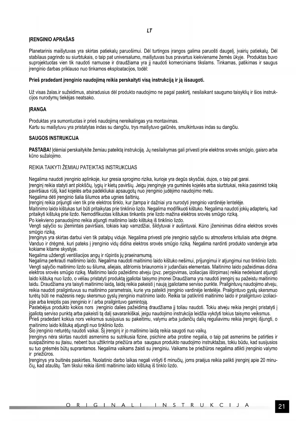 Negalima naudoti įrenginio aplinkoje, kur gresia sprogimo rizika, kurioje yra degūs skysčiai, dujos, o taip pat garai. Įrenginį reikia statyti ant plokšči ų, lygių ir kietų paviršių. Jeigu įrenginyje yra guminės kojelės arba siurbtukai, reikia pasirinkti tokią paviršiaus rūšį, kad kojelės arba padėkliukai apsaugotų nuo įrenginio judėjimo naudojimo metu. Negalima dėti įrenginio šalia šilumos arba ugnies šaltinių. Įrenginį reikia prijungti vien tik prie elektros tinklo, kur įtampa ir dažniai yra nurodyti įrenginio vardinėje lentelėje. Maitinimo laido kištukas turi būti pritaikytas prie tinklinio lizdo. Negalima modifikuoti kištuko. Negalima naudoti jokių adapterių, kad pritaikyti kištuką prie lizdo. Nemodifikuotas kištukas tinkantis prie lizdo mažina elektros srovės smūgio riziką. Po kiekvieno panaudojimo reikia atjungti maitinimo laido kištuką iš tinklinio lizdo. Vengti sąlyčio su įžemintais paviršiais, tokiais kaip vamzdžiai, šildytuvai ir aušintuvai. Kūno įžeminimas didina elektros srovės smūgio riziką. Įrenginys yra skirtas darbui vien tik patalpų viduje. Negalima privesti prie įrenginio sąlyčio su atmosferos krituliais arba drėgme. Vanduo ir drėgmė, kuri pateks į įrenginio vidų didina elektros srovės smūgio riziką. Negalima nardinti produkto vandenyje arba kokiame kitame skystyje. Negalima uždengti ventiliacijos angų ir rūpintis jų praeinamumą. Negalima perkrauti maitinimo laido. Negalima naudoti maitinimo laido kištuko nešimui, prijungimui ir atjungimui nuo tinklinio lizdo. Vengti sąlyčio maitinimo lizdo su šiluma, aliejais, aštriomis briaunomis ir judančiais elementais. Maitinimo laido pažeidimas didina elektros srovės smūgio riziką. Maitinimo laido pažeidimo atveju (pvz. perpjovimas, izoliacijas ištirpimas) reikia nedelsiant atjungti laido kištuką nuo lizdo, o vėliau pristatyti produktą įgaliotai taisymo įmonei Draudžiama yra naudoti įrenginį su pažeistu maitinimo laidu. Draudžiama yra taisyti maitinimo laidą, laidą reikia pakeisti į naują įgaliotame serviso punkte. Prailgintuvų naudojimo atveju, reikia naudoti prailgintuvus su maitinimo parametrais, kurie yra pateikti įrenginio vardinėje lentelėje. Prailgintuvo gyslų skersmuo turėtų būti ne mažesnis negu skersmuo gyslų įrenginio maitinimo laido. Reikia tai patikrinti maitinimo laido ir prailgintuvo izoliaci- joje arba kreiptis pas įrenginio ir / arba prailgintuvo gamintoją. Pastebėjus produkto kokios nors įrenginio dalies pažeidimą draudžiama jį toliau naudoti. Tokiu atveju reikia įrenginį pristatyti į įgaliotą serviso punktą arba pakeisti tą dalį savarankiškai, jeigu naudojimo instrukcija leidžia vykdyti tokius taisymo veiksmus. Prieš pradedant kokius nors veiksmus susijusius su pakeitimu, valymu arba judančių dalių reguliavimu reikia įrenginį išjungti, o maitinimo laido kištuką atjungti nuo tinklinio lizdo. Šio įrenginio neturėtų naudoti vaikai. Šį įrenginį ir jo maitinimo laidą reikia saugoti nuo vaikų. Įrenginys nėra skirtas naudoti asmenims su sutrikusia fizine, psichine arba protine negalia, o taip pat asmenims be patirties ir susipažinimo su įtaisu, nebent bus užtikrinta priežiūra arba saugaus produkto naudojimo instruktažas, tokiu būdu, kad susijusios su tuo grėsmės būtų suprantamos. Negalima vaikams žaisti su įrenginiu. Vaikams be priežiūros negalima atlikti įrenginio valymo ir priežiūros. Įrenginys yra buitinės paskirties. Nuolatinio darbo laikas negali viršyti 6 minučių, joms praėjus reikia palikti įrenginį apie 20 minu- čių, kad atauštų. Tam tikslui reikia išimti maitinimo laido kištuką iš tinklo lizdo.22 ORIGINALI INSTRUKCIJA