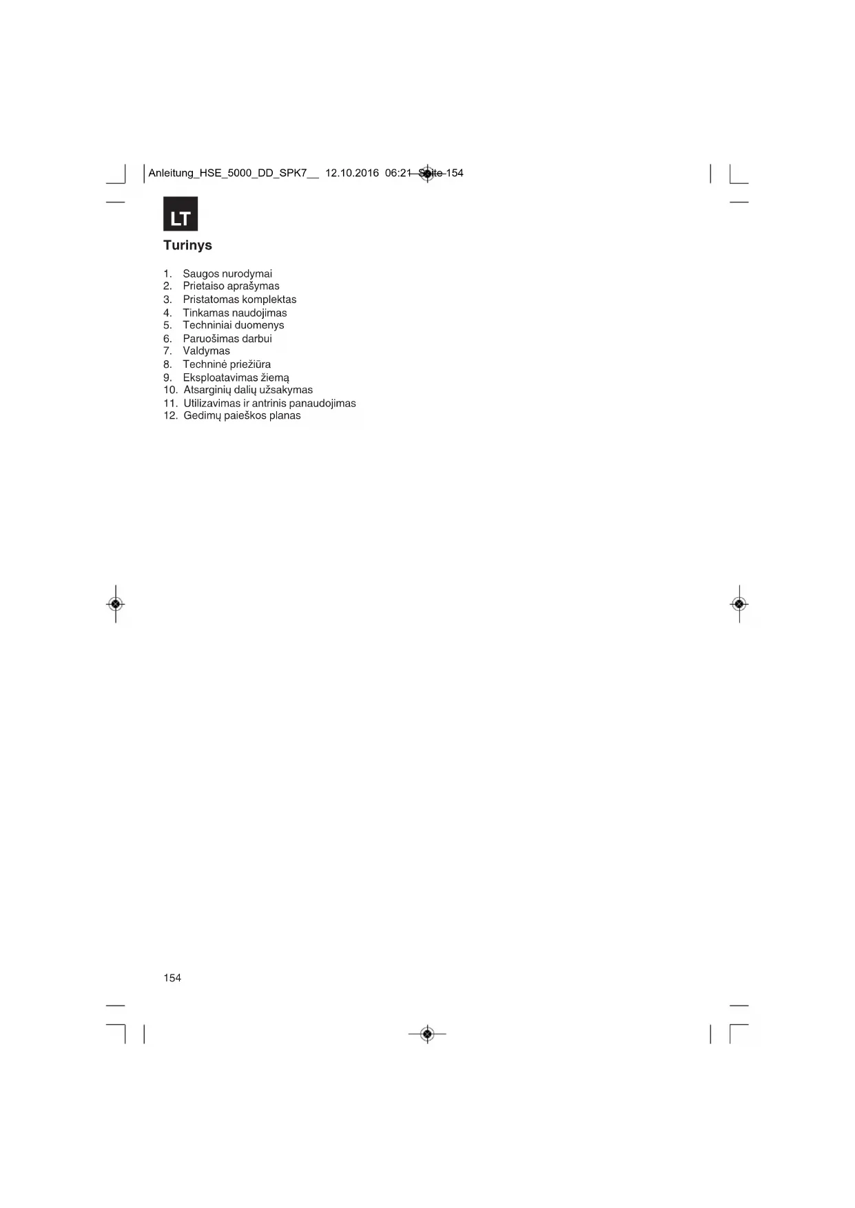 Anleitung_HSE_5000_DD_SPK7__ 12.10.2016 06:21 Seite 154m Dėmesio! Naudodami prietaisus, būtinai laikykitės kai kurių saugumo taisyklių – nesusižalosite ir nepatirsite nuostolių. Todėl atidžiai perskaitykite šią naudojimo instrukciją. Kruopščiai ją saugokite, kad visada galėtumėte pasinaudoti informacija. Perduodami prietaisą kitiems asmenims, kartu perduokite ir naudojimo instrukciją. Mes neatsakome už nelaimingus atsitikimus ar žalą, patirtą nesilaikant šios instrukcijos saugos nurodymų.