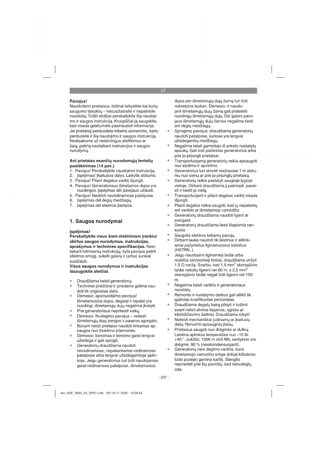 Generatorių varo degimo variklis, kuris išmetamojo vamzdžio srityje (kitoje kištukinio lizdo pusėje) gamina karštį. Stengtis nepriartėti prie šių paviršių, kad nenudegtų oda. Anl_HSE_3500_E5_SPK7.indb 237 24.11.2020 15:39:54LT
