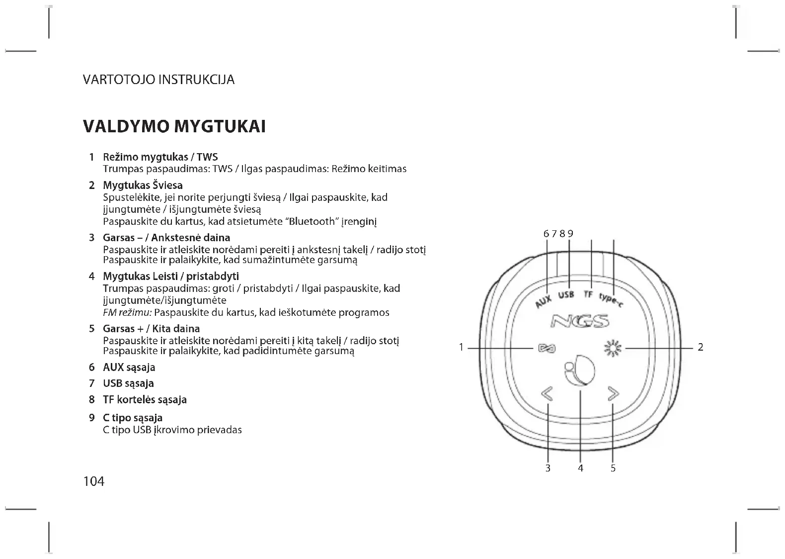 Režimo mygtukas / TWS Trumpas paspaudimas: TWS / Ilgas paspaudimas: Režimo keitimas Mygtukas Šviesa Spustelėkite, jei norite perjungti šviesą / Ilgai paspauskite, kad įjungtumėte / išjungtumėte šviesą Paspauskite du kartus, kad atsietumėte “Bluetooth” įrenginį Garsas – / Ankstesnė daina Paspauskite ir atleiskite norėdami pereiti į ankstesnį takelį / radijo stotį Paspauskite ir palaikykite, kad sumažintumėte garsumą Mygtukas Leisti / pristabdyti Trumpas paspaudimas: groti / pristabdyti / Ilgai paspauskite, kad įjungtumėte/išjungtumėte FM režimu: Paspauskite du kartus, kad ieškotumėte programos Garsas + / Kita daina Paspauskite ir atleiskite norėdami pereiti į kitą takelį / radijo stotį Paspauskite ir palaikykite, kad padidintumėte garsumą AUX sąsaja USB sąsaja TF kortelės sąsaja C tipo sąsaja C tipo USB įkrovimo prievadas