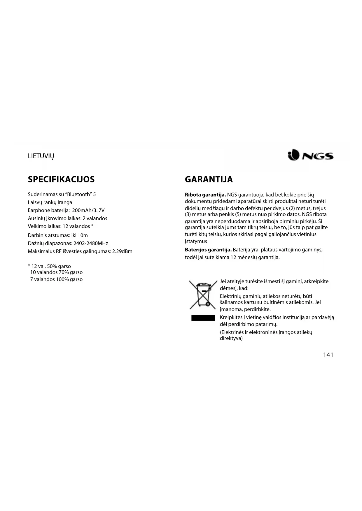 SPECIFIKACIJOS Jei ateityje turėsite išmesti šį gaminį, atkreipkite dėmesį, kad: Elektrinių gaminių atliekos neturėtų būti šalinamos kartu su buitinėmis atliekomis. Jei įmanoma, perdirbkite. Kreipkitės į vietinę valdžios instituciją ar pardavėją dėl perdirbimo patarimų. (Elektrinės ir elektroninės įrangos atliekų direktyva) GARANTIJA Ribota garantija. NGS garantuoja, kad bet kokie prie šių dokumentų pridedami aparatūrai skirti produktai neturi turėti didelių medžiagų ir darbo defektų per dvejus (2) metus, trejus (3) metus arba penkis (5) metus nuo pirkimo datos. NGS ribota garantija yra neperduodama ir apsiriboja pirminiu pirkėju. Ši garantija suteikia jums tam tikrų teisių, be to, jūs taip pat galite turėti kitų teisių, kurios skiriasi pagal galiojančius vietinius įstatymus Baterijos garantija. Baterija yra plataus vartojimo gaminys, todėl jai suteikiama 12 mėnesių garantija. Suderinamas su “Bluetooth” 5 Laisvų rankų įranga Earphone baterija: 200mAh/3. 7V Ausinių įkrovimo laikas: 2 valandos Veikimo laikas: 12 valandos * Darbinis atstumas: iki 10m Dažnių diapazonas: 2402-2480MHz Maksimalus RF išvesties galingumas: 2.29dBm