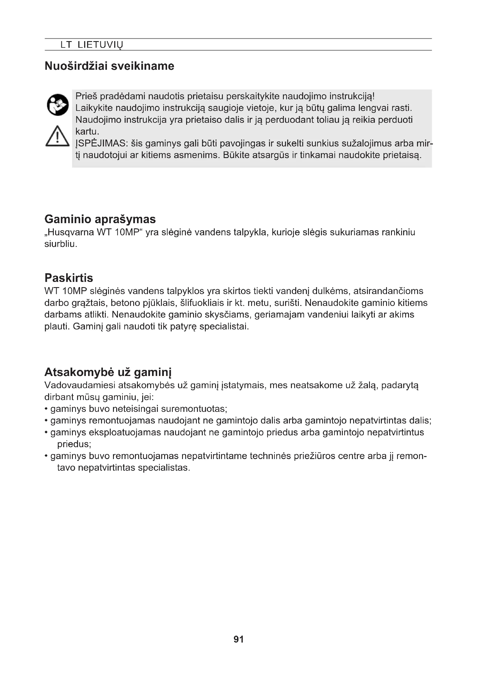 NAUDOJIMO INSTRUKCIJA WT 10MP HUSQVARNA