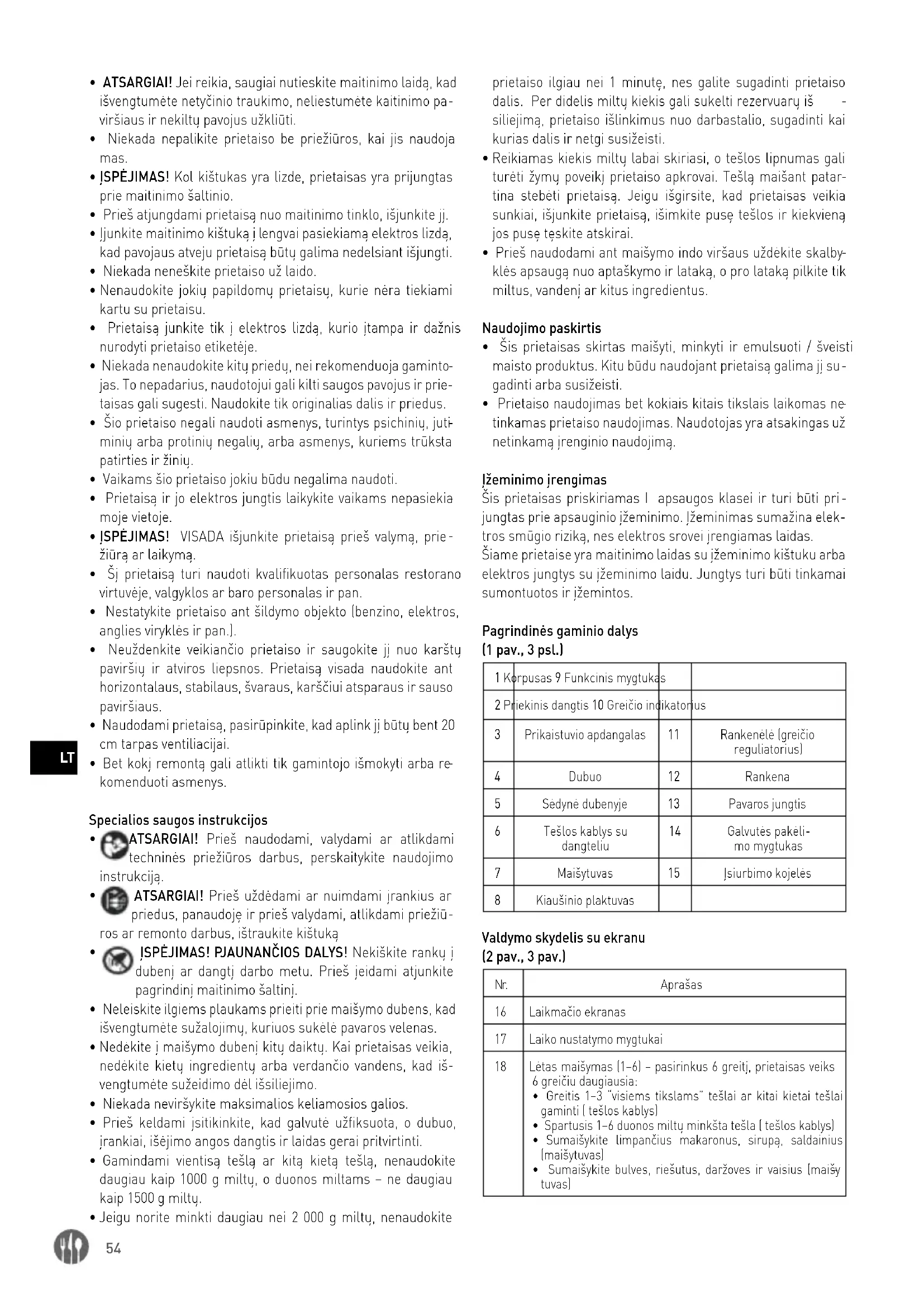 klės apsaugą nuo aptaškymo ir lataką, o pro lataką pilkite tik miltus, vandenį ar kitus ingredientus. Naudojimo paskirtis