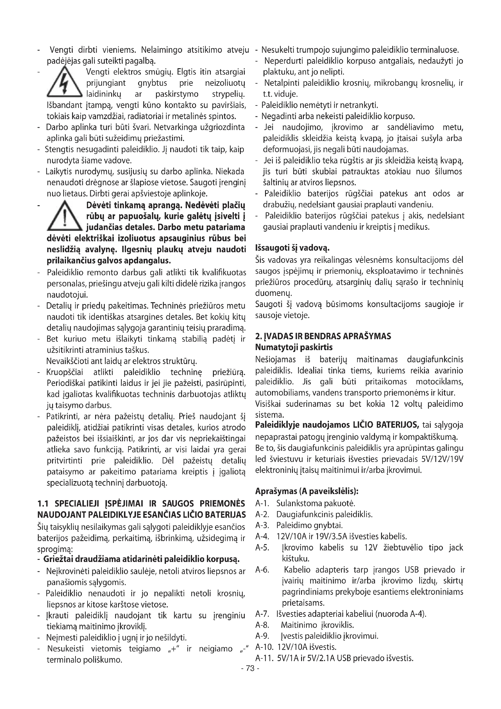 Numatytoji paskirtis Nešiojamas iš baterijų maitinamas daugiafunkcinis paleidiklis. Idealiai tinka tiems, kuriems reikia avarinio paleidiklio. Jis gali būti pritaikomas motociklams, automobiliams, vandens transporto priemonėms ir kitur. Visiškai suderinamas su bet kokia 12 voltų paleidimo sistema. Paleidiklyje naudojamos LIČIO BATERIJOS, tai sąlygoja nepaprastai patogų įrenginio valdymą ir kompaktiškumą. Be to, šis daugiafunkcinis paleidiklis yra aprūpintas galingu led šviestuvu ir keturiais išvesties prievadais 5V/12V/19V elektroninių įtaisų maitinimui ir/arba įkrovimui. Aprašymas (A paveikslėlis): A-1. Sulankstoma pakuotė. A-2. Daugiafunkcinis paleidiklis. A-3. Paleidimo gnybtai. A-4. 12V/10A ir 19V/3.5A išvesties kabelis. A-5. Įkrovimo kabelis su 12V žiebtuvėlio tipo jack kištuku. A-6. Kabelio adapteris tarp įrangos USB prievado ir įvairių maitinimo ir/arba įkrovimo lizdų, skirtų pagrindiniams prekyboje esantiems elektroniniams prietaisams. A-7. Išvesties adapteriai kabeliui (nuoroda A-4). A-8. Maitinimo įkroviklis. A-9. Įvestis paleidiklio įkrovimui. A-10. 12V/10A išvestis. A-11. 5V/1A ir 5V/2.1A USB prievado išvestis.- 74 - A-12. 19V/3.5A išvestis. A-13. LED šviestuvas. A-14. Išvesties lizdas paleidimo gnybtams (nuoroda A-3). A-15. ON/OFF mygtukas įkrovimo lygiui, išvesties prievadams (nuoroda A-11 ir 12) ir led šviestuvui. A-16. Vidinės baterijos įkrovimo lygio signalinė lemputė.