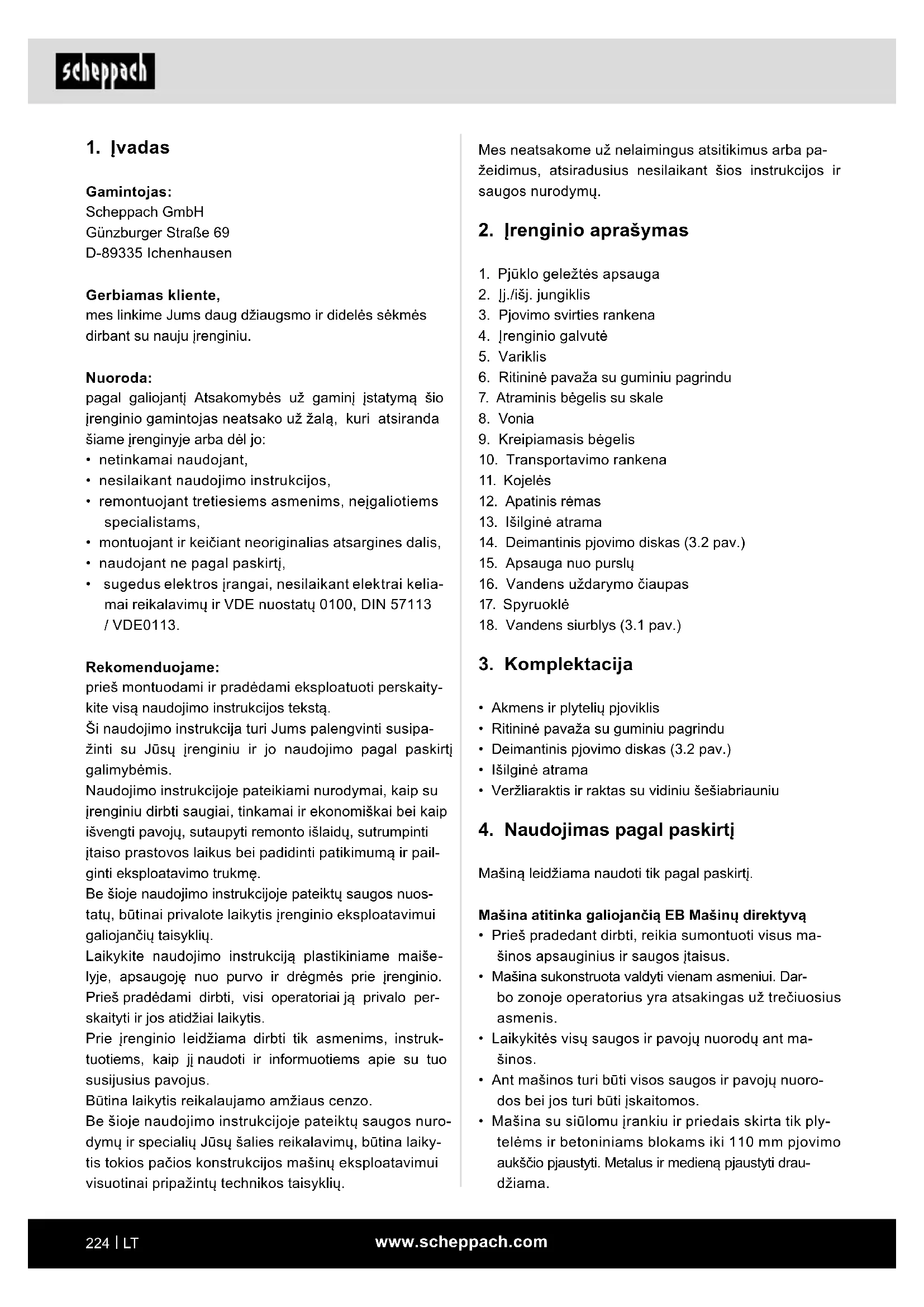 - sugedus elektros įrangai, nesilaikant elektrai kelia- mai reikalavimų ir VDE nuostatų 0100, DIN 57113 / VDE0113. Rekomenduojame: prieš montuodami ir pradėdami eksploatuoti perskaity- kite visą naudojimo instrukcijos tekstą. Ši naudojimo instrukcija turi Jums palengvinti susipa- žinti su Jūsų įrenginiu ir jo naudojimo pagal paskirtį galimybėmis. Naudojimo instrukcijoje pateikiami nurodymai, kaip su įrenginiu dirbti saugiai, tinkamai ir ekonomiškai bei kaip išvengti pavojų, sutaupyti remonto išlaidų, sutrumpinti įtaiso prastovos laikus bei padidinti patikimumą ir pail- ginti eksploatavimo trukmę. Be šioje naudojimo instrukcijoje pateiktų saugos nuos- tatų, būtinai privalote laikytis įrenginio eksploatavimui galiojančių taisyklių. Laikykite naudojimo instrukciją plastikiniame maiše- lyje, apsaugoję nuo purvo ir drėgmės prie įrenginio. Prieš pradėdami dirbti, visi operatoriai ją privalo per- skaityti ir jos atidžiai laikytis. Prie įrenginio leidžiama dirbti tik asmenims, instruk- tuotiems, kaip jį naudoti ir informuotiems apie su tuo susijusius pavojus. Būtina laikytis reikalaujamo amžiaus cenzo. Be šioje naudojimo instrukcijoje pateiktų saugos nuro- dymų ir specialių Jūsų šalies reikalavimų, būtina laiky- tis tokios pačios konstrukcijos mašinų eksploatavimui visuotinai pripažintų technikos taisyklių.www.scheppach.com