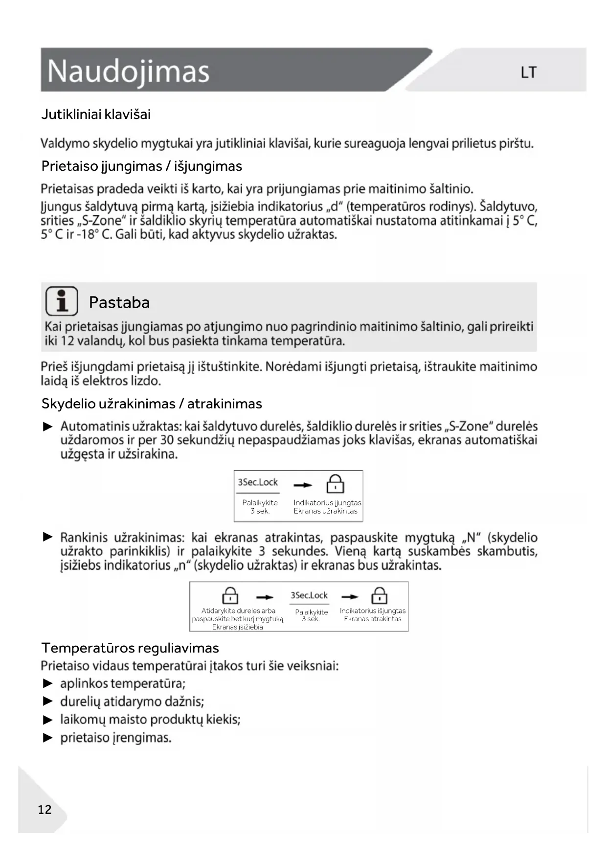 Palaikykite 3 sek. Indikatorius įjungtas Ekranas užrakintas Palaikykite 3 sek. Indikatorius išjungtas Ekranas atrakintas Atidarykite dureles arba paspauskite bet kurį mygtuką Ekranas įsižiebia13 Šaldytuvo temperatūros reguliavimas