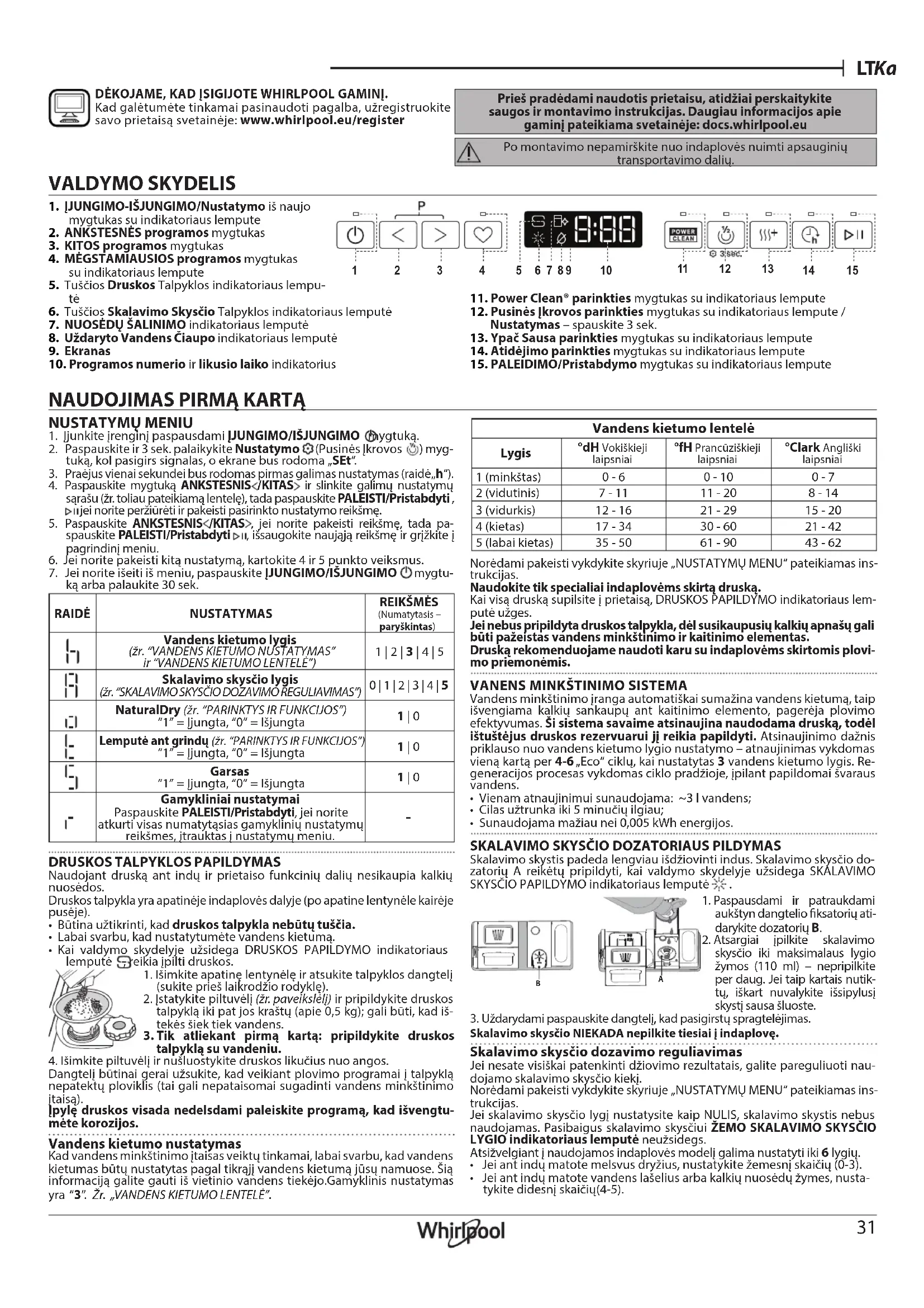 Vandens kietumo lentelė Lygis °dH Vokiškieji laipsniai °fH Prancūziškieji laipsniai °Clark Angliški laipsniai 1 (minkštas) 0 - 6 0 - 10 0 - 7 2 (vidutinis) 7 - 11 11 - 20 8 - 14 3 (vidurkis) 12 - 16 21 - 29 15 - 20 4 (kietas) 17 - 34 30 - 60 21 - 42 5 (labai kietas) 35 - 50 61 - 90 43 - 62 VALDYMO SKYDELIS W11553946 panelW11572189 button RW11572083 button LW11569647 display