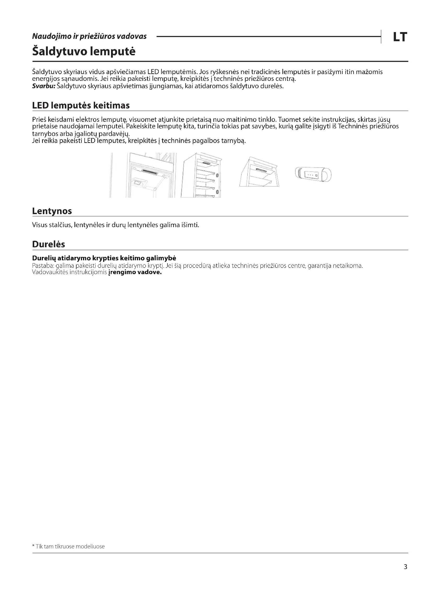 Naudojimo ir priežiūros vadovas Šaldytuvo lemputė Šaldytuvo skyriaus vidus apšviečiamas LED lemputėmis. Jos ryškesnės nei tradicinės lemputės ir pasižymi itin mažomis energijos sąnaudomis. Jei reikia pakeisti lemputę, kreipkitės į techninės priežiūros centrą. Svarbu: Šaldytuvo skyriaus apšvietimas įjungiamas, kai atidaromos šaldytuvo durelės. LED lemputės keitimas Prieš keisdami elektros lemputę, visuomet atjunkite prietaisą nuo maitinimo tinklo. Tuomet sekite instrukcijas, skirtas jūsų prietaise naudojamai lemputei. Pakeiskite lemputę kita, turinčia tokias pat savybes, kurią galite įsigyti iš Techninės priežiūros tarnybos arba įgaliotų pardavėjų. Jei reikia pakeisti LED lemputes, kreipkitės į techninės pagalbos tarnybą. Lentynos Visus stalčius, lentynėles ir durų lentynėles galima išimti. Durelės Durelių atidarymo krypties keitimo galimybė Pastaba: galima pakeisti durelių atidarymo kryptį. Jei šią procedūrą atlieka techninės priežiūros centre, garantija netaikoma. Vadovaukitės instrukcijomis įrengimo vadove.* Tik tam tikruose modeliuose4 Naudojimo ir priežiūros vadovas Kaip naudoti prietaisą Naudojimas pirmą kartą Įrengę, prieš prijungdami prietaisą prie maitinimo, palaukite bent dvi valandas. Prijunkite prietaisą prie elektros tinklo ir jis pradės veikti automatiškai. Tinkamiausios maisto laikymo temperatūros yra iš anksto nustatytos gamykloje. Įjungę prietaisą, turite palaukti 4–6 valandas, kol bus pasiekta tinkama įprastai pripildyto prietaiso laikymo temperatūra. Antibakterinį, nuo kvapų saugantį ltrą įdėkite į ventiliatorių, kaip parodyta ant ltro pakuotės (jei yra). Jei pasigirsta garsinis signalas, vadinasi, buvo suaktyvintas temperatūros signalas: paspauskite mygtuką, kad išjungtumėte garsinį signalą. Šaldytuvo skyrius ir maisto laikymas Šaldytuvo skyrius skirtas šviežiam maistui ir gėrimams laikyti. Šaldytuvo skyrius visiškai atšyla automatiškai. Nuolat pasirodantys vandens lašai vidinėje šaldytuvo skyriaus galinės sienos pusėje yra automatinio atitirpinimo požymis. Atitirpęs vanduo nukreipiamas į angą, paskui teka į talpą, iš kurios išgaruoja. Pastaba: Aplinkos temperatūra, dažnas durų atidarinėjimas ir prietaiso vieta gali turėti įtakos vidinei šių dviejų skyrių temperatūrai. Temperatūrą reguliuokite atsižvelgdami į šiuos veiksnius. Esant labai drėgnoms ir šiltoms sąlygoms, šaldytuvo skyriuose (ypač ant stiklinių lentynų) gali susidaryti kondensacija. Tokiu atveju rekomenduojama uždaryti talpyklas su skysčiais (pvz., perpildytus puodus), suvynioti maistą, turintį didelį vandens kiekį (pvz., daržoves) ir įjungti ventiliatorių, jei jis yra. Visus stalčius, lentynėles ir durų lentynėles galima išimti. Daugiasrautis oro paskirstymas Daugiasrautis oro paskirstymas padeda tolygiai paskirstyti šaltą orą skyriuje ir geriau apsaugoti maistą. Maistą galite laikyti bet kurioje prietaiso lentynėlėje. Atkreipkite dėmesį, kad nebūtų uždengtos oro tiekimo ventiliatorių angos ir oras galėtų laisvai judėti. Kaip laikyti šviežią maistą ir gėrimus Maisto produktus, kurie išskiria daug etileno dujų (obuolius, abrikosus, kriaušes, persikus, avokadus, gas, slyvas, mėlynes, melionus, pupeles) arba yra jautrūs šioms dujoms, pavyzdžiui, vaisiai, daržovės ir salotos, visada reikia laikyti atskirai arba suvynioti, kad juos išlaikytumėte kuo ilgiau; pavyzdžiui, pomidorų nelaikykite kartu su kiviais ar kopūstais. Maisto produktų nelaikykite per arti vienų kitų, kad tarp jų galėtų tinkamai cirkuliuoti oras. Maistui laikyti naudokite perdirbamo plastiko, metalo, aliuminio ir stiklo indelius bei maistinę plėvelę. Jei šaldytuve ketinate laikyti nedidelį maisto produktų kiekį, rekomenduojame naudoti lentynas virš vaisių ir daržovių stalčiaus, nes tai šalčiausia skyriaus vieta. Skysčius ir maisto produktus, kurie gali skleisti stiprius kvapus arba būti jais paveikti, laikykite uždaruose indeliuose arba uždenkite. Kad buteliai neišvirstų, galite pasinaudoti butelių laikikliu (tik tam tikruose modeliuose).