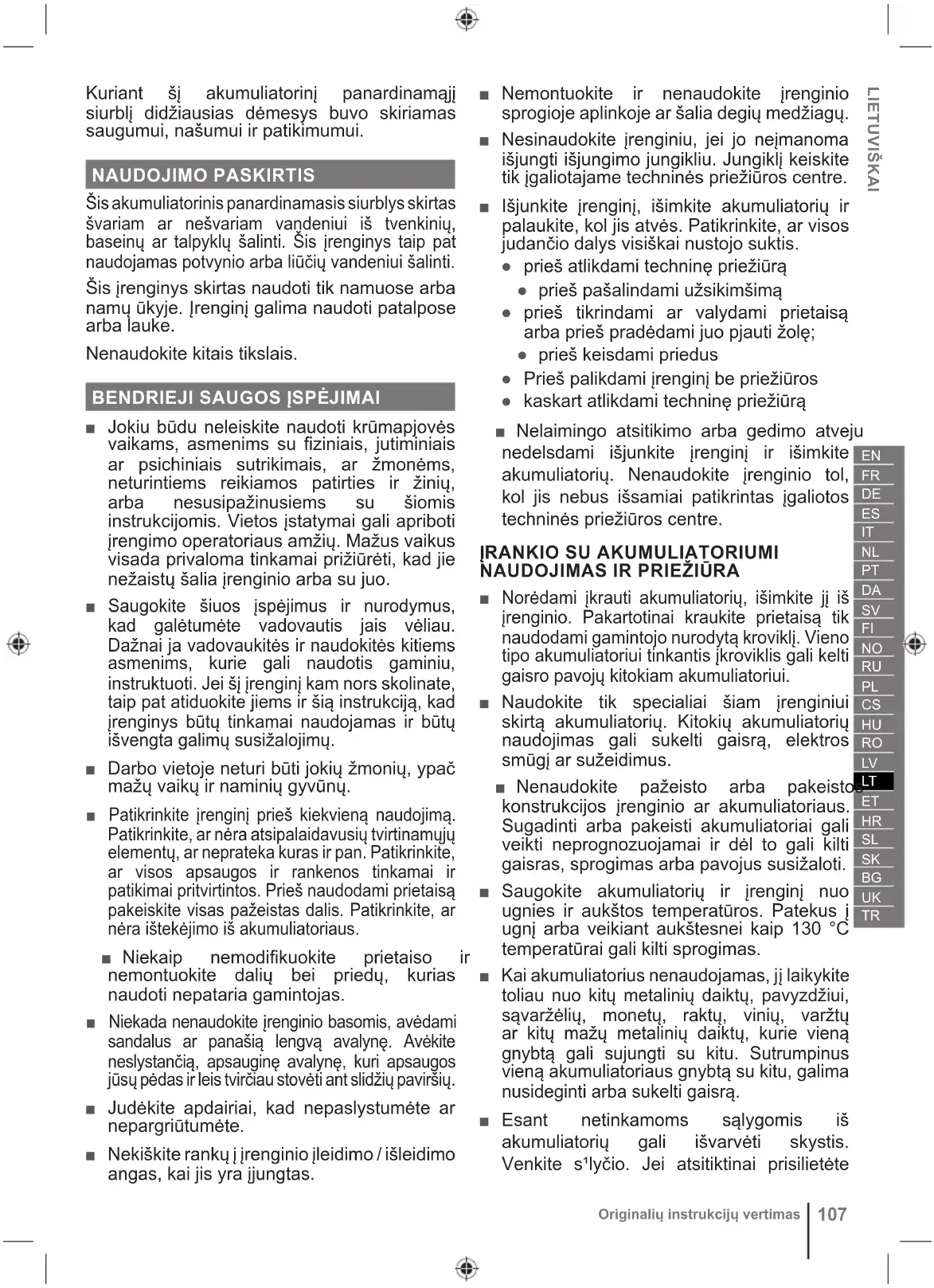 ■ Norėdami įkrauti akumuliatorių, išimkite jį iš įrenginio. Pakartotinai kraukite prietaisą tik naudodami gamintojo nurodytą kroviklį. Vieno tipo akumuliatoriui tinkantis įkroviklis gali kelti gaisro pavojų kitokiam akumuliatoriui. ■ Naudokite tik specialiai šiam įrenginiui skirtą akumuliatorių. Kitokių akumuliatorių naudojimas gali sukelti gaisrą, elektros smūgį ar sužeidimus. ■ Nenaudokite pažeisto arba pakeistos konstrukcijos įrenginio ar akumuliatoriaus. Sugadinti arba pakeisti akumuliatoriai gali veikti neprognozuojamai ir dėl to gali kilti gaisras, sprogimas arba pavojus susižaloti. ■ Saugokite akumuliatorių ir įrenginį nuo ugnies ir aukštos temperatūros. Patekus į ugnį arba veikiant aukštesnei kaip 130 °C temperatūrai gali kilti sprogimas. ■ Kai akumuliatorius nenaudojamas, jį laikykite toliau nuo kitų metalinių daiktų, pavyzdžiui, sąvaržėlių, monetų, raktų, vinių, varžtų ar kitų mažų metalinių daiktų, kurie vieną gnybtą gali sujungti su kitu. Sutrumpinus vieną akumuliatoriaus gnybtą su kitu, galima nusideginti arba sukelti gaisrą. ■ Esant netinkamoms sąlygomis iš akumuliatorių gali išvarvėti skystis. Venkite s¹lyčio. Jei atsitiktinai prisilietėte108 Originalių instrukcijų vertimas - nuplaukite vandeniu. Jei skysčio pateko į akis, nedelsiant kreipkitės į gydytoją. Iš akumuliatoriaus ištekėjęs skystis gali nudeginti ar sukelti sudirginimus. ■ Išimkite seną akumuliatorių iš gaminio ir saugiai jį utilizuokite. AKUMULIATORINIO PANARDINAMOJO