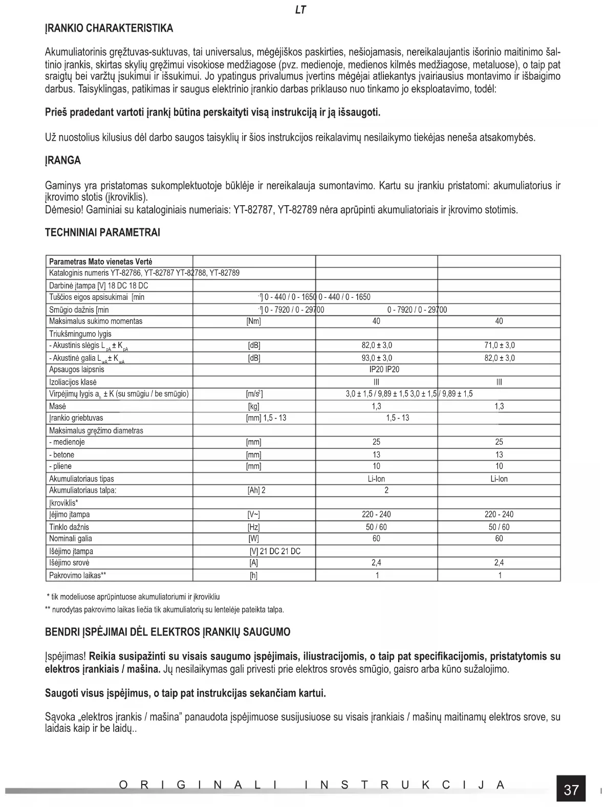 - tik modeliuose aprūpintuose akumuliatoriumi ir įkrovikliu ** nurodytas pakrovimo laikas liečia tik akumuliatorių su lentelėje pateikta talpa. BENDRI ĮSPĖJIMAI DĖL ELEKTROS ĮRANKIŲ SAUGUMO Įspėjimas! Reikia susipažinti su visais saugumo įspėjimais, iliustracijomis, o taip pat specifi kacijomis, pristatytomis su elektros įrankiais / mašina. Jų nesilaikymas gali privesti prie elektros srovės smūgio, gaisro arba kūno sužalojimo. Saugoti visus įspėjimus, o taip pat instrukcijas sekančiam kartui. Sąvoka „elektros įrankis / mašina” panaudota įspėjimuose susijusiuose su visais įrankiais / mašinų maitinamų elektros srove, su laidais kaip ir be laidų..38 ORIGINALI INSTRUKCIJA