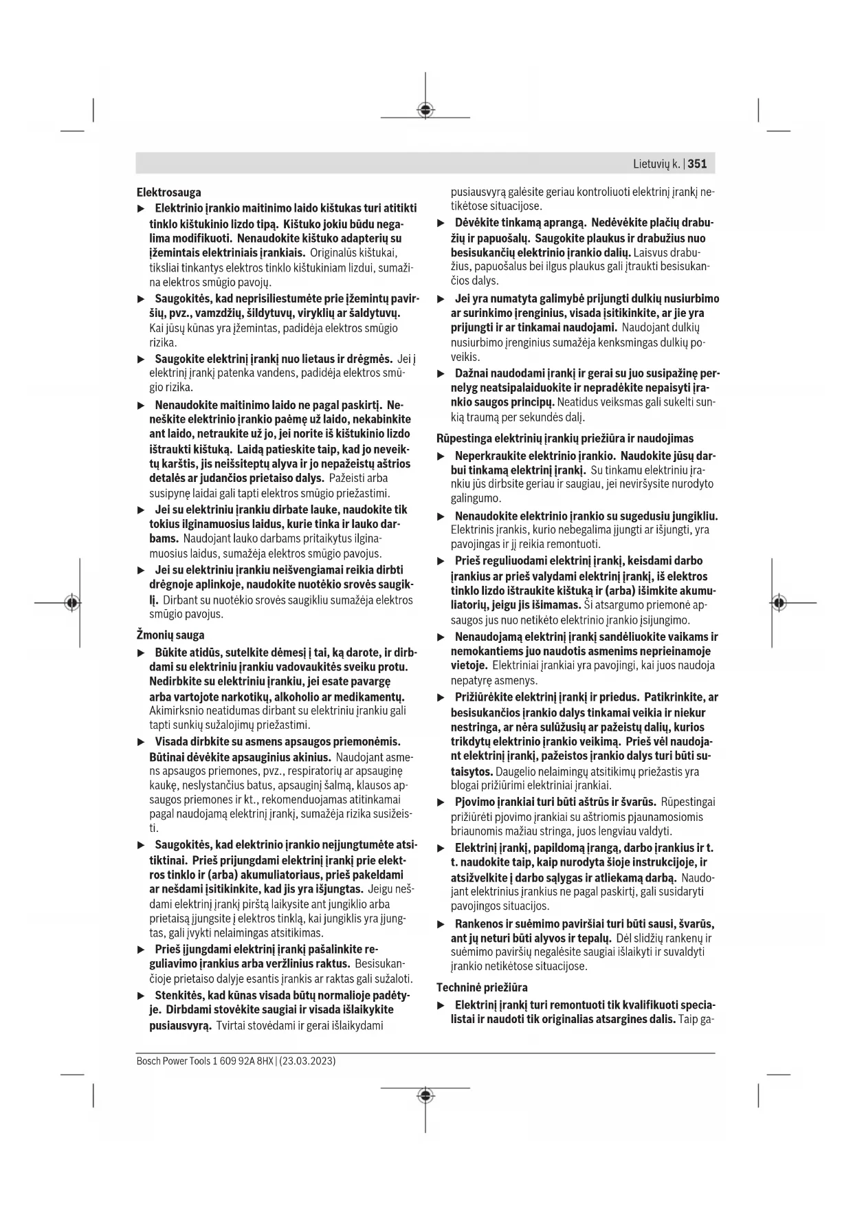 Pirms elektroinstrumenta transportēšanas veiciet šādas darbības: – Atskrūvējiet fiksējošo skrūvi(1), ja tā ir pieskrūvēta. Līdz galam izvelciet uz priekšu darbinstrumenta galvu un tad pieskrūvējiet fiksējošo skrūvi. – Pārliecinieties, ka dziļuma ierobežotājs (39) ir pilnībā pagriezts uz aizmuguri un regulēšanas skrūve (38) kustoties darbinstrumenta galvai, nekam nepieskaras. – Pārvietojiet elektroinstrumentu transporta stāvoklī. – Noņemiet visus piederumus, ko nevar stingri nostiprināt uz elektroinstrumenta. Ja iespējams, transportēšanas laikā ievietojiet rezerves zāģa asmeņus noslēdzamā futrālī. – Pagrieziet rokturi transportēšanai (3) perpendikulāri. – Pārnesiet elektroinstrumentu aiz transportēšanas rokturiem(3) vai satveriet to aiz padziļinājumiem(61) zāģēšanas galda sānos. u Elektroinstrumenta transportēšanas laikā izmantojiet vienīgi transportēšanas ierīces, bet ne aizsargierīces vai apstrādājamā materiāla paliktņus. Bosch Power Tools 1 609 92A 8HX | (23.03.2023)350 | Lietuvių k. Apkalpošana un apkope Apkalpošana un tīrīšana u Pirms elektroinstrumenta apkopes vai apkalpošanas izvelciet tā elektrokabeļa kontaktdakšu no barojošā elektrotīkla kontaktligzdas. u Lai elektroinstruments darbotos droši un bez atteikumiem, regulāri tīriet tā korpusu un ventilācijas atveres. Ja nepieciešams nomainīt instrumenta elektrokabeli, tas jāveic firmas Bosch elektroinstrumentu servisa centrā vai pilnvarotā Bosch elektroinstrumentu remonta darbnīcā, jo tikai tā ir iespējams saglabāt vajadzīgo darba drošības līmeni. Kustīgajam aizsargpārsegam brīvi jāpārvietojas un patstāvīgi jāaizveras. Tāpēc īpaši sekojiet, lai instrumenta virsma kustīgā aizsargpārsega tuvumā vienmēr būtu tīra. Ik reizi pēc pabeigtas darba operācijas attīriet izstrādājumu un tā daļas no putekļiem un skaidām ar saspiesta gaisa strūklu vai otu. Regulāri tīriet slīdrullīti (13). Pasākumi trokšņa samazināšanai Pasākumi, ko var veikt ražotājs: – Pakāpeniska palaišana – Piegāde komplektā ar īpaši izstrādātu zāģa asmeni ar samazinātu trokšņa līmeni Pasākumi, ko var veikt lietotājs: – Veiciet montāžu uz stabilas darba virsmas, kas ļauj samazināt vibrāciju – Izmantojiet īpaši izstrādātus zāģa asmeņus ar samazinātu trokšņa līmeni, – Regulāra tīriet zāģa asmeni un elektroinstrumentu Klientu apkalpošanas dienests un konsultācijas par lietošanu Klientu apkalpošanas dienests atbildēs uz Jūsu jautājumiem par izstrādājumu remontu un apkalpošanu, kā arī par to rezerves daļām. Kopsalikuma attēlus un informāciju par rezerves daļām Jūs varat atrast interneta vietnē: www.bosch-pt.com Bosch konsultantu grupa palīdzēs Jums vislabākajā veidā rast atbildes uz jautājumiem par mūsu izstrādājumiem un to piederumiem. Pieprasot konsultācijas un pasūtot rezerves daļas, noteikti paziņojiet 10zīmju izstrādājuma numuru, kas norādīts uz izstrādājuma marķējuma plāksnītes. Latvijas Republika Robert Bosch SIA Bosch elektroinstrumentu servisa centrs Mūkusalas ielā 97 LV-1004 Rīga Tālr.: 67146262 Telefakss: 67146263 E-pasts: service-pt@lv.bosch.com Papildu klientu apkalpošanas dienesta adreses skatiet šeit: www.bosch-pt.com/serviceaddresses Atbrīvošanās no nolietotajiem izstrādājumiem Nolietotie elektroinstrumenti, to piederumi un iesaiņojuma materiāli jāpakļauj otrreizējai pārstrādei apkārtējai videi nekaitīgā veidā. Neizmetiet elektroinstrumentu sadzīves atkritumu tvertnē! Tikai EK valstīm. Saskaņā ar Eiropas Savienības direktīvu 2012/19/ES par nolietotajām elektriskajām un elektroniskajām ierīcēm un šīs direktīvas atspoguļojumiem nacionālajā likumdošanā, lietošanai nederīgie elektroinstrumenti jāsavāc atsevišķi un jānogādā otrreizējai pārstrādei apkārtējai videi nekaitīgā veidā. Ja elektriskās un elektroniskās ierīces netiek atbilstoši utilizētas, tās var kaitēt videi un cilvēku veselībai iespējamās bīstamo vielu klātbūtnes dēļ. Lietuvių k. Saugos nuorodos Bendrosios darbo su elektriniais įrankiais saugos nuorodos ĮSPĖJIMAS Perskaitykite visus su šiuo elektri- niu įrankiu pateikiamus saugos įspėjimus, instrukcijas, peržiūrėkite iliustracijas ir speci- fikacijas. Jei nepaisysite visų žemiau pateiktų instrukcijų, galite patirti elektros smūgį, sukelti gaisrą ir sunkiai susižaloti arba sužaloti kitus asmenis. Išsaugokite šias saugos nuorodas ir reikalavimus, kad ir ateityje galėtumėte jais pasinaudoti. Toliau pateiktame tekste vartojama sąvoka „Elektrinis įra- nkis“ apibūdina įrankius, maitinamus iš elektros tinklo (su maitinimo laidu), ir akumuliatorinius įrankius (be maitinimo laido). Darbo vietos saugumas u Darbo vieta turi būti švari ir gerai apšviesta. Netvarkin- ga arba blogai apšviesta darbo vieta gali tapti nelaimingų atsitikimų priežastimi. u Nedirbkite su elektriniu įrankiu aplinkoje, kurioje yra degių skysčių, dujų ar dulkių. Elektriniai įrankiai gali kibirkščiuoti, o nuo kibirkščių dulkės arba susikaupę garai gali užsidegti. u Dirbdami su elektriniu įrankiu neleiskite šalia būti vai- kams ir pašaliniams asmenims. Nukreipę dėmesį į kitus asmenis galite nebesuvaldyti prietaiso. 1 609 92A 8HX | (23.03.2023) Bosch Power ToolsLietuvių k. | 351 Elektrosauga u Elektrinio įrankio maitinimo laido kištukas turi atitikti tinklo kištukinio lizdo tipą. Kištuko jokiu būdu nega- lima modifikuoti. Nenaudokite kištuko adapterių su įžemintais elektriniais įrankiais. Originalūs kištukai, tiksliai tinkantys elektros tinklo kištukiniam lizdui, sumaži- na elektros smūgio pavojų. u Saugokitės, kad neprisiliestumėte prie įžemintų pavir- šių, pvz., vamzdžių, šildytuvų, viryklių ar šaldytuvų. Kai jūsų kūnas yra įžemintas, padidėja elektros smūgio rizika. u Saugokite ele