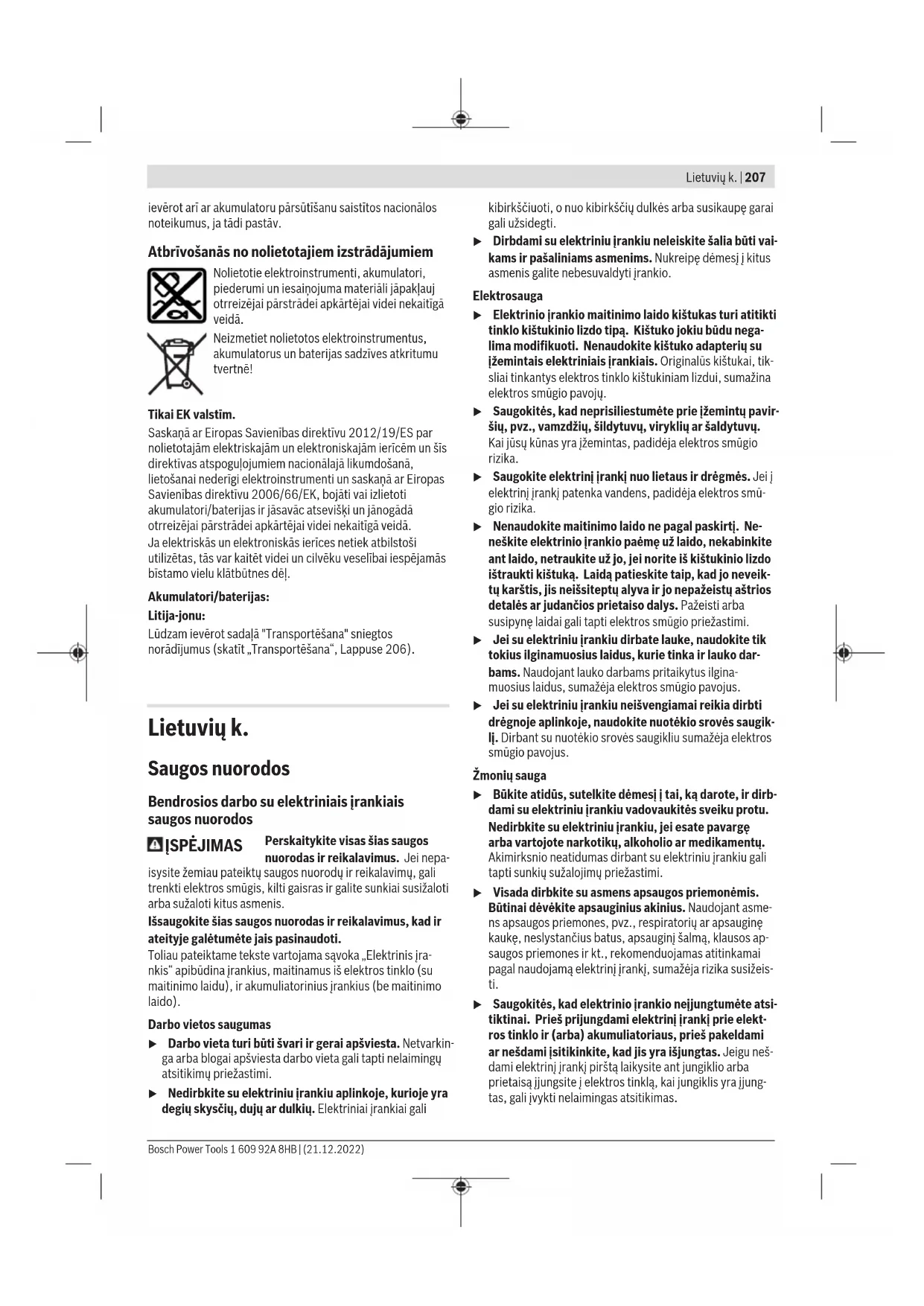 1 balta diode deg pastāvīgi 5000 2 baltās diodes deg pastāvīgi 7500 3 baltās diodes deg pastāvīgi 10000 4 baltās diodes deg pastāvīgi 12500 5 baltās diodes deg pastāvīgi 15000 u Iestiprināmā piederuma pieļaujamajam griešanās ātrumam jābūt ne mazākam par elektroinstrumenta maksimālo norādīto griešanās ātrumu. Piederumi, kas griežas ātrāk, nekā pieļaujams, var salūzt un tikt mesti prom. Bosch Power Tools 1 609 92A 8HB | (21.12.2022)206 | Latviešu LED indikatori (skatīt attēlu B) Sekojoša tabulā ir paskaidroti iespējamie LED indikatori.(2). Krāsa Stāvoklis Nozīme/iemesls Risinājums Balts Pastāvīgi deg (1gab....5gab Apgriezienu skaita iestatījums (skatīt „Apgriezienu skaita regulēšana (skatīt attēluB)“, Lappuse205) Zaļš Pastāvīgi deg (2gab....5gab.) Akumulators ir uzlādēts (skatīt „Akumulatora uzlādes pakāpes indikators“, Lappuse204) Dzeltens Pastāvīgi deg (1gab.) Akumulators ir gandrīz izlādējies (skatīt „Akumulatora uzlādes pakāpes indikators“, Lappuse204) Drīzumā nomainiet vai uzlādējiet akumulatoru Mirgojoša gaisma (5gab.) Ir sasniegta kritiskā temperatūra (motorā, elektroniskajā mezglā, akumulatorā) Darbiniet elektroinstrumentu brīvgaitā un ļaujiet tam atdzist Sarkans Pastāvīgi deg (1gab.) Akumulators ir izlādējies (skatīt „Akumulatora uzlādes pakāpes indikators“, Lappuse204) Nomainiet vai uzlādējiet akumulatoru Mirgojoša gaisma (5gab.) Elektroinstruments ir pārkarsis un izslēdzas Ļaujiet elektroinstrumentam atdzist un tad atkārtoti ieslēdziet to Elektroinstruments ir bloķēts un izslēdzas Novērsiet bloķēšanas iemeslu un atkal ieslēdziet elektroinstrumentu Darbvārspstas fiksators ir bloķēts, un elektroinstruments izslēdzas Deaktivizējiet darbvārpstas fiksatoru un atkal ieslēdziet elektroinstrumentu Elektroniskā gaitas stabilizēšana Elektroniskais gaitas stabilizators uztur gandrīz nemainīgu darbvārpstas griešanās ātrumu, slodzei mainoties no brīvgaitas līdz maksimālajai vērtībai, kas ļauj stabilizēt apstrādes režīmu. Norādījumi darbam Lai panāktu optimālu darba rezultātu, vienmērīgi pārvietojiet balsta plati ar disku turp un atpakaļ, nedaudz piespiežot. Pārāk liels spiediens samazina elektroinstrumenta veiktspēju un paātrina slīpēšanas darbinstrumenta nodilumu. u Uzglabājiet slīpēšanas darbinstrumentus tā, lai tie būtu pasargāti no triecieniem. Apkalpošana un apkope Apkalpošana un tīrīšana u Veicot jebkurus darbus ar elektroinstrumentu (piemēram, apkalpošanu, darbinstrumentu nomaiņu utt.), kā arī pirms tā transportēšanas vai uzglabāšanas vienmēr izņemiet no elektroinstrumenta akumulatoru. Ieslēdzēja nejauša nospiešana var izraisīt savainojumu. u Lai elektroinstruments darbotos droši un bez atteikumiem, regulāri tīriet tā korpusu un ventilācijas atveres. Klientu apkalpošanas dienests un konsultācijas par lietošanu Klientu apkalpošanas dienests atbildēs uz Jūsu jautājumiem par izstrādājumu remontu un apkalpošanu, kā arī par to rezerves daļām. Kopsalikuma attēlus un informāciju par rezerves daļām Jūs varat atrast interneta vietnē: www.bosch-pt.com Bosch konsultantu grupa palīdzēs Jums vislabākajā veidā rast atbildes uz jautājumiem par mūsu izstrādājumiem un to piederumiem. Pieprasot konsultācijas un pasūtot rezerves daļas, noteikti paziņojiet 10zīmju izstrādājuma numuru, kas norādīts uz izstrādājuma marķējuma plāksnītes. Latvijas Republika Robert Bosch SIA Bosch elektroinstrumentu servisa centrs Mūkusalas ielā 97 LV-1004 Rīga Tālr.: 67146262 Telefakss: 67146263 E-pasts: service-pt@lv.bosch.com Papildu klientu apkalpošanas dienesta adreses skatiet šeit: www.bosch-pt.com/serviceaddresses Transportēšana Ieteicamajiem litija jonu akumulatoriem ir piemērojami Bīstamo kravu aprites likuma noteikumi. Lietotājs var transportēt akumulatorus ielu transporta plūsmā bez papildu nosacījumiem. Pārsūtot tos ar trešo personu starpniecību (piemēram, ar gaisa transporta vai citu transporta aģentūru starpniecību), jāievēro īpaši sūtījuma iesaiņošanas un marķēšanas noteikumi. Tāpēc sūtījumu sagatavošanas laikā jāpieaicina bīstamo kravu pārvadāšanas speciālists. Pārsūtiet akumulatoru tikai tad, ja tā korpuss nav bojāts. Aizlīmējiet vaļējos akumulatora kontaktus un iesaiņojiet akumulatoru tā, lai tas iesaiņojumā nepārvietotos. Lūdzam 1 609 92A 8HB | (21.12.2022) Bosch Power ToolsLietuvių k. | 207 ievērot arī ar akumulatoru pārsūtīšanu saistītos nacionālos noteikumus, ja tādi pastāv. Atbrīvošanās no nolietotajiem izstrādājumiem Nolietotie elektroinstrumenti, akumulatori, piederumi un iesaiņojuma materiāli jāpakļauj otrreizējai pārstrādei apkārtējai videi nekaitīgā veidā. Neizmetiet nolietotos elektroinstrumentus, akumulatorus un baterijas sadzīves atkritumu tvertnē! Tikai EK valstīm. Saskaņā ar Eiropas Savienības direktīvu 2012/19/ES par nolietotajām elektriskajām un elektroniskajām ierīcēm un šīs direktīvas atspoguļojumiem nacionālajā likumdošanā, lietošanai nederīgi elektroinstrumenti un saskaņā ar Eiropas Savienības direktīvu 2006/66/EK, bojāti vai izlietoti akumulatori/baterijas ir jāsavāc atsevišķi un jānogādā otrreizējai pārstrādei apkārtējai videi nekaitīgā veidā. Ja elektriskās un elektroniskās ierīces netiek atbilstoši utilizētas, tās var kaitēt videi un cilvēku veselībai iespējamās bīstamo vielu klātbūtnes dēļ. Akumulatori/baterijas: Litija-jonu: Lūdzam ievērot sadaļā "Transportēšana" sniegtos norādījumus (skatīt „Transportēšana“, Lappuse206). Lietuvių k. Saugos nuorodos Bendrosios darbo su elektriniais įrankiais saugos nuorodos ĮSPĖJIMAS Perskaitykite visas šias saugos nuorodas ir reikalavimus. Jei nepa- isysite žemiau pateiktų saugos nuorodų ir reikalavimų, gali trenkti elektros smūgis, kilti g