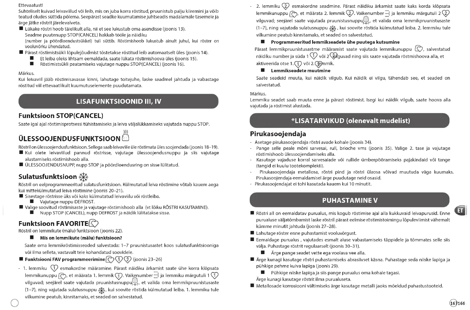 SVARBIOS APSAUGOS PRIEMONĖS: Šis buitinis prietaisas nėra skirtas naudoti naudojant išorinį laikmatį ar atskirą nuotolinio valdymo sistemą. Jūsų prietaisas skirtas buitiniam naudojimui tik namuose, iki 2000m aukštyje. Šis prietaisas skirtas naudoti tik buitinėms reikmėms. Jis nėra skirtas naudoti toliau nurodytoms paskirtims ir garantija nebus taikoma, jei: – jis bus naudojamas parduotuvių, biurų ir kitų darbo vietų virtuvėse; – jis bus naudojamas ūkio namuose; – jį naudos klientai viešbučiuose, moteliuose ir kitose gyvenamojo tipo vietose; – jis bus naudojamas nakvynės ir pusryčių namų aplinkoje. Šis prietaisas neskirtas naudoti asmenims (įskaitant vaikus), kurie turi zinę, jutiminę arba protinę negalią, neturi patirties ir žinių, nebent už jų saugumą atsakingas asmuo juos prižiūri arba išmokė naudotis prietaisu. Vaikus būtina prižiūrėti, kad jie nežaistų su prietaisu. Jei maitinimo laidas yra pažeistas, jį turi pakeisti gamintojas, jo techninės priežiūros specialistas arba panašios kvalikacijos asmenys, kad būtų išvengta pavojaus. Duona gali užsidegti, tad prietaiso negalima naudoti šalia užuolaidų ar kitų degių medžiagų, pvz., apmušalų ar medinių baldų (lentynų ar spintelių), arba po jomis. Naudojamo prietaiso negalima palikti be priežiūros. Vaikai nuo 8 metų ir asmenys, turintys ribotus zinius, jutiminius ar protinius gebėjimus arba neturintys patirties ir pakankamai žinių, prietaisą gali naudoti tik prižiūrimi arba kai jiems suteikiamos saugaus naudojimosi prietaisu instrukcijos, ir tik kai jie supranta galimus pavojus. Vaikams žaisti su prietaisu draudžiama. Vaikai SAUGOS NURODYMAI Keskkonnakaitse ennekõike! See seade sisaldab taaskasutatavaid või ringlussevõetavaid materjale. Utiliseerimiseks viige see kohalikku jäätmejaama. Pakend koosneb ainult keskkonnasõbralikest materjalidest, mis tuleb utiliseerida vastavalt kohalikele jäätmekäitluseeskirjadele. Seadme enda utiliseerimisviiside teavet saate oma piirkonna kohaliku ametiasutuse vastavast osakonnast. UTILISEERIMINE REMONDITEENUS PROBLEEM LAHENDUS Röster ei tööta. Veenduge, et pistik on õigesti pistikupessa ühendatud. Leib jääb seadmesse kinni. Lahutage seade vooluvõrgust ja laske sel jahtuda. Eemaldage leib ettevaatlikult. Olge ettevaatlik, et te ei kahjustaks leiva eemaldamisel kuumutuselemente. Ärge kunagi kasutage leiva eemaldamiseks metallist esemeid. Leib on liiga tume või pole piisavalt pruunistunud. Kontrollige valitud taseme seadet. Kui leib on liiga tume, valige madalam tase, või kui pole piisavalt pruunistunud, siis kõrgem tase. Veenduge, et kinnitatud nupud poleks valitud. Leib hüppab peaaegu kohe välja ega ole röstitud. Veenduge, et hoob on lõpuni alla vajutatud. Kui leib ei püsi endiselt röstris, viige oma seade volitatud teeninduskeskusesse. Röstrist tuleb suitsu. Võimalik, et valitud on liiga kõrge röstimisaste. Vajutage röstimistsükli peatamiseks nuppu CANCEL (STOP) ja lahutage seade vooluvõrgust. Juhe on kahjustatud. Kui seadme juhe on kahjustatud, tuleb see lasta volitatud teeninduskeskuses välja vahetada. Prieš pirmą kartą naudodamiesi prietaisu, atidžiai perskaitykite naudojimo instrukcijas ir neišmeskite jų, kad galėtumėte pasižiūrėti ateityje: Gamintojas neprisiima atsakomybės už naudojimą nesilaikant nurodymų.171170