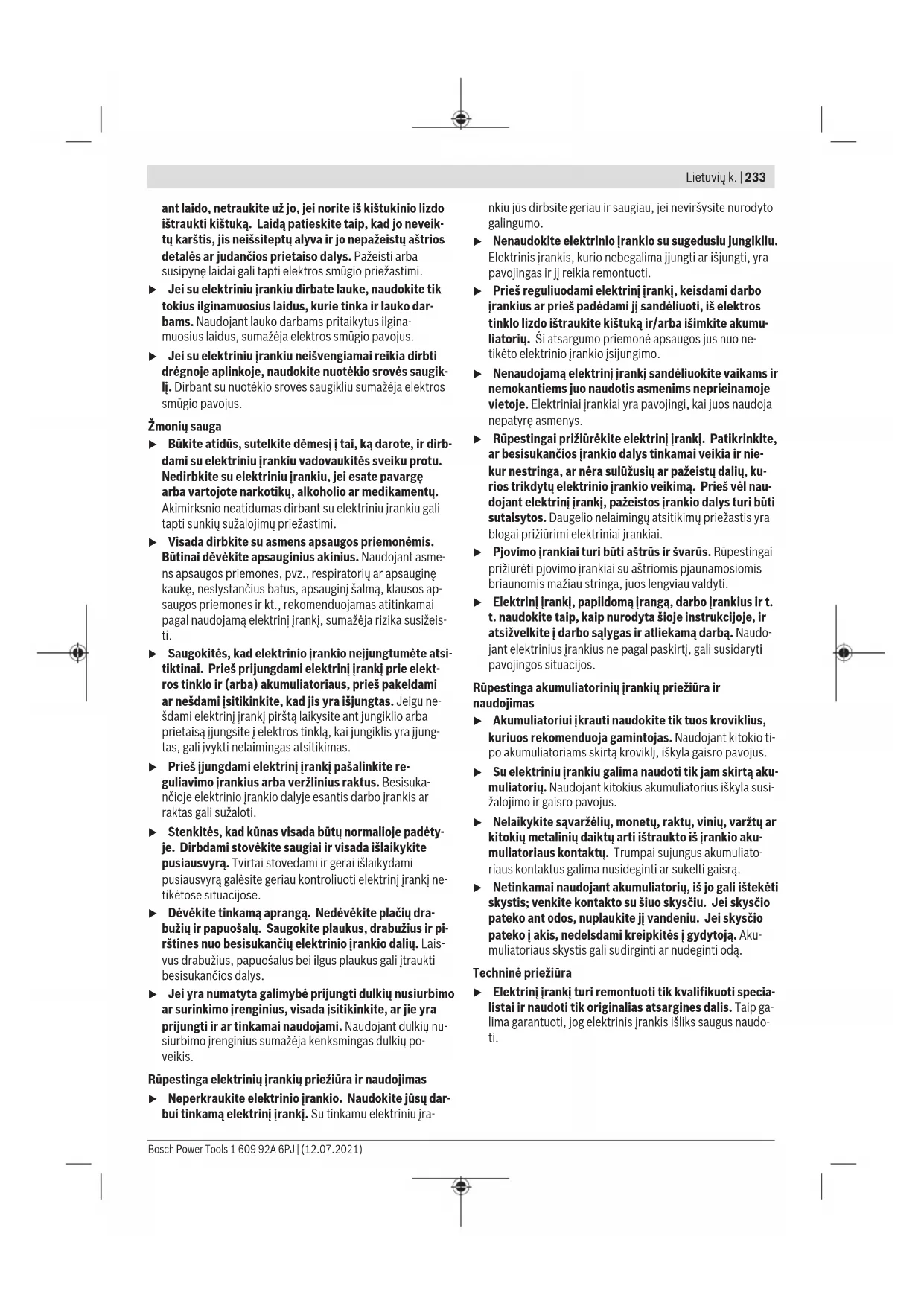 Šioje instrukcijoje pateiktas vibracijos lygis buvo išmatuotas pagal standartizuotą matavimo metodą, ir jį galima naudoti lyginant elektrinius įrankius. Jis taip pat tinka išankstiniam vibracijos poveikio įvertinimui. Nurodytas vibracijos lygis atspindi pagrindinius elektrinio įrankio naudojimo atvejus. Tačiau jeigu elektrinis įrankis nau- dojamas kitokiai paskirčiai, su kitokiais darbo įrankiais arba jeigu jis nepakankamai techniškai prižiūrimas, vibracijos ly- gis gali kisti. Tokiu atveju vibracijos poveikis per visą darbo laikotarpį gali žymiai padidėti. Norint tiksliai įvertinti vibracijos poveikį per tam tikrą darbo laiką, reikia atsižvelgti ir į laiką, per kurį elektrinis įrankis bu- vo išjungtas arba, nors ir veikė, bet nebuvo naudojamas. Tai įvertinus, vibracijos poveikis per visą darbo laiką žymiai su- mažės. Dirbančiajam nuo vibracijos poveikio apsaugoti paskirkite papildomas apsaugos priemones, pvz.: elektrinių ir darbo įrankių techninę priežiūrą, rankų šildymą, darbo eigos orga- nizavimą. 1 609 92A 6PJ | (12.07.2021) Bosch Power ToolsLietuvių k. | 237 Montavimas Akumuliatoriaus įkrovimas u Naudokite tik techninių duomenų skyriuje nurodytus kroviklius. Tik šie krovikliai yra priderinti prie Jūsų elekt- riniame įrankyje naudojamo ličio jonų akumuliatoriaus. Nuoroda: akumuliatorius pristatomas iš dalies įkrautas. Kad akumuliatorius veiktų visa galia, prieš pirmąjį naudojimą aku- muliatorių kroviklyje visiškai įkraukite. Ličio jonų akumuliatorių galima įkrauti bet kada, eksploatavi- mo trukmė dėl to nesutrumpėja. Krovimo proceso nutrauki- mas akumuliatoriui nekenkia. Celių apsaugos sistema „Electronic Cell Protection (ECP)“ saugo ličio jonų akumuliatorių nuo visiškos iškrovos. Kai aku- muliatorius išsikrauna, apsauginis išjungiklis išjungia elektri- nį įrankį, ir darbo įrankis nebesisuka. u Jeigu elektrinis įrankis išsijungė automatiškai, neban- dykite vėl spausti įjungimo-išjungimo jungiklio. Taip galite sugadinti ličio jonų akumuliatorių. Laikykitės pateiktų šalinimo nurodymų. Akumuliatoriaus išėmimas (žr.Apav.) Norėdami išimti akumuliatorių(4), paspauskite atblokavimo klavišus(5)ir išimkite akumuliatorių iš elektrinio įrankio. Traukdami nenaudokite jėgos. Akumuliatoriaus įkrovos būklės indikatorius LED Talpa Šviečia nuolat 3xžali 60 – 100% Šviečia nuolat 2xžali 30 – 60% Dega nuolat 1xžalias 10 – 30% Lėtai mirksi 1xžalias 0 – 10% Apsauginių įtaisų montavimas u Prieš atliekant bet kokius elektrinio įrankio priežiūros darbus (atliekant techninę priežiūrą ar keičiant įrankį ir t. t.), o taip pat elektrinį įrankį transportuojant ir sandėliuojant, būtina iš jo išimti akumuliatorių. Priešingu atveju galite susižeisti, netyčia nuspaudę įjun- gimo-išjungimo jungiklį. Nuoroda: jei dirbant sulūžta šlifavimo diskas arba pažeidžia- mas apsauginio gaubto arba elektrinio įrankio įtvaras, elekt- rinį įrankį reikia nedelsiant nusiųsti į klientų aptarnavimo sky- rių; adresai pateikti skyriuje „Klientų aptarnavimo skyrius ir konsultavimo tarnyba“. Šlifavimui skirtas apsauginis gaubtas u Norėdami šlifuoti, visada naudokite šlifavimui skirtą apsauginį gaubtą(7). Pjovimui skirtas apsauginis gaubtas u Pjaudami su standžiomis šlifavimo priemonėmis, visa- da naudokite pjovimui skirtą apsauginį gaubtą (10). u Pjaudami akmenį, pasirūpinkite pakankamu dulkių nu- siurbimu. Apsauginio gaubto sumontavimas (žr.Bpav.) Pjovimui skirtą apsauginį gaubtą(10) uždėkite ant šlifavimui skirto apsauginio gaubto(7) taip, kad jis gerai užsifiksuotų. Apsauginio gaubto nustatymas (žr.Bpav.) Sukite apsauginį gaubtą į pageidaujamą padėtį ir leiskite jam toje padėtyje užsifiksuoti. Tam papildomo įrankio naudoti nereikia. Šlifavimo įrankių tvirtinimas u Prieš atliekant bet kokius elektrinio įrankio priežiūros darbus (atliekant techninę priežiūrą ar keičiant įrankį ir t. t.), o taip pat elektrinį įrankį transportuojant ir sandėliuojant, būtina iš jo išimti akumuliatorių. Priešingu atveju galite susižeisti, netyčia nuspaudę įjun- gimo-išjungimo jungiklį. u Nelieskite šlifavimo ir pjovimo diskų, kol jie neatvėso. Diskai darbo metu labai įkaista. Nuvalykite šlifavimo suklį(8) ir visas dalis, kurias reikia mon- tuoti. Norėdami užveržti ar atlaisvinti šlifavimo įrankius, stumkite suklio fiksuojamąjį klavišą(2) pirmyn ir tuo pačiu sukite šlifa- vimo įrankį, kad užfiksuotumėte šlifavimo suklį. u Suklio fiksuojamąjį klavišą spauskite tik tada, kai šli- favimo suklys visiškai sustojęs. Priešingu atveju galite pažeisti elektrinį įrankį. Šlifavimo/atpjovimo diskas Atkreipkite dėmesį į šlifavimo įrankių matmenis. Kiaurymės skersmuo turi tiksliai tikti tvirtinamajai jungei. Nenaudokite adapterių ir tvirtinamųjų elementų. Naudojant deimantinį pjovimo diską būtina atkreipti dėmesį į tai, kad ant disko pažymėta sukimosi krypties rodyklė sutap- tų elektrinio prietaiso sukimosi kryptimi (žr. ant reduktoriaus korpuso pažymėtą rodyklę). Montavimo eilės tvarka nurodyta schemoje. Norėdami atlaisvinti šlifavimo/atpjovimo diską, stumkite suklio fiksuojamąjį klavišą(2) pirmyn ir tuo pačiu sukite šlifa- vimo/atpjovimo diską(12), kad užfiksuotumėte šlifavimo suklį(8) (žr.C1pav.). Šešiabriauniu raktu(13) nuimkite tvirtinamąjį varžtą su poveržle(11) ir nuimkite šlifavimo/atpjovimo diską(12) (žr.C2pav.). Norėdami pritvirtinti šlifavimo/atpjovimo diską, prisukite tvirtinamąjį varžtą su poveržle(11). Šešiabriauniu raktu(13) užveržkite varžtą tiek, kad varžto poveržlė lygiai priglustų prie šlifavimo/atpjovimo disko(12) (žr.C3pav.). Tada suklio fiksuojamąjį klavišą(2) vėl pastumkite atgal (žr.C4pav.). u Įstatę šlifavimo įrankį, prieš įjungdami patikrinkite, ar šlifavimo įrankis tinkamai pritvi