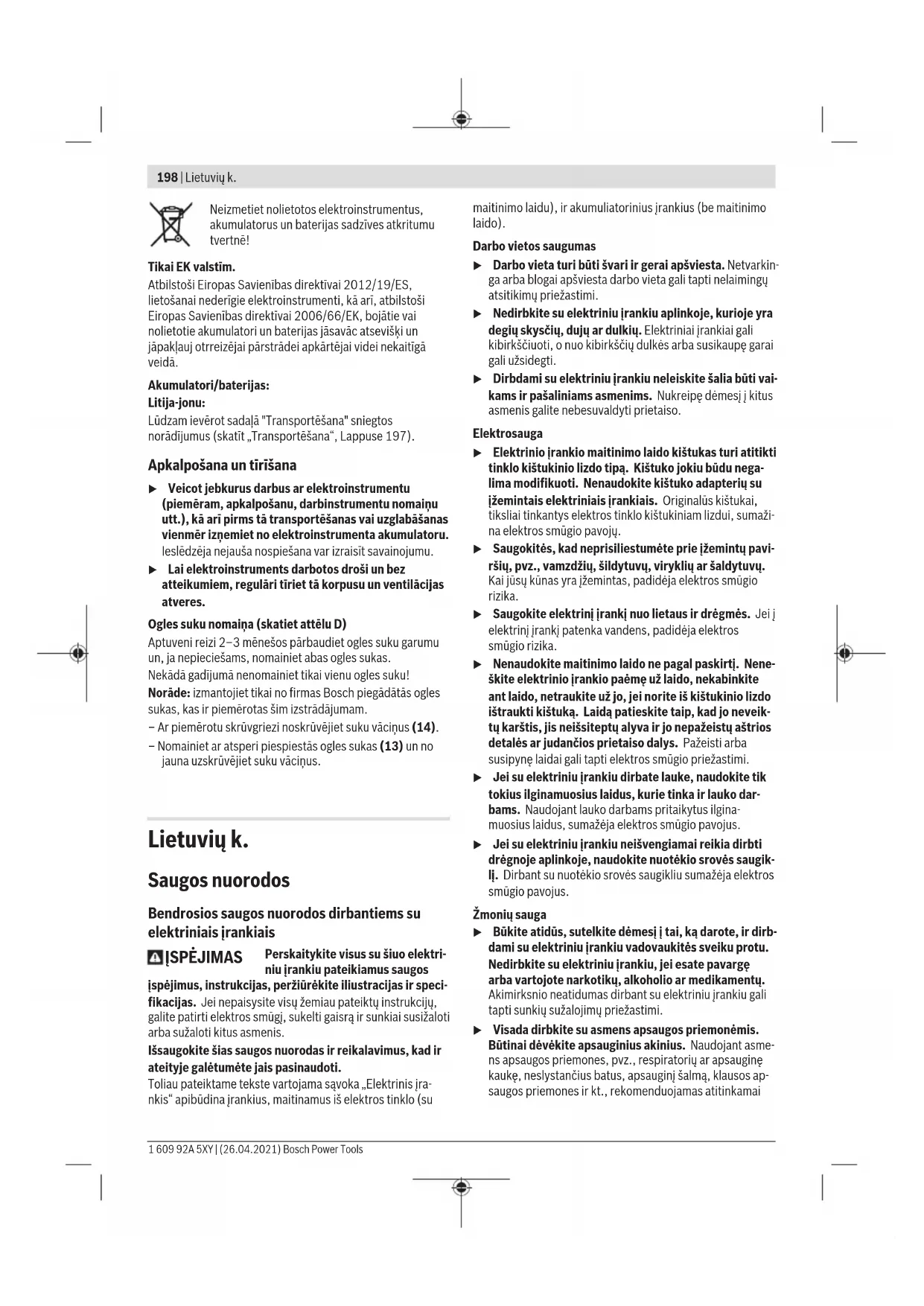 Šioje instrukcijoje pateiktas vibracijos lygis ir triukšmo emisi- ja buvo išmatuoti pagal standartizuotą matavimo metodą, ir juos galima naudoti elektriniams įrankiams palyginti. Jie taip pat skirti vibracijos ir triukšmo emisijai iš anksto įvertinti. Nurodytas vibracijos lygis ir triukšmo emisijos vertė atspindi pagrindinius elektrinio įrankio naudojimo atvejus. Tačiau jei- gu elektrinis įrankis naudojamas kitokiai paskirčiai, su kito- kiais darbo įrankiais arba jeigu jis nepakankamai techniškai prižiūrimas, vibracijos lygis ir triukšmo emisijos vertė gali ki- sti. Tokiu atveju vibracijos ir triukšmo emisija per visą darbo laikotarpį gali žymiai padidėti. Norint tiksliai įvertinti vibracijos ir triukšmo emisiją per tam tikrą darbo laiką, reikia atsižvelgti ir į laiką, per kurį elektrinis įrankis buvo išjungtas arba, nors ir veikė, bet nebuvo naudo- jamas. Tai įvertinus, vibracijos ir triukšmo emisija per visą darbo laiką žymiai sumažės. Dirbančiajam nuo vibracijos poveikio apsaugoti paskirkite papildomas apsaugos priemones, pvz.: elektrinių ir darbo įrankių techninę priežiūrą, rankų šildymą, darbo eigos orga- nizavimą. Montavimas u Prieš atliekant bet kokius elektrinio įrankio priežiūros darbus (atliekant techninę priežiūrą ar keičiant įrankį ir t. t.), o taip pat elektrinį įrankį transportuojant ir sandėliuojant, būtina iš jo išimti akumuliatorių. Priešingu atveju galite susižeisti, netyčia nuspaudę įjun- gimo-išjungimo jungiklį. Akumuliatoriaus įkrovimas u Naudokite tik techninių duomenų skyriuje nurodytus kroviklius. Tik šie krovikliai yra priderinti prie Jūsų elekt- riniame įrankyje naudojamo ličio jonų akumuliatoriaus. Nuoroda: akumuliatorius pristatomas iš dalies įkrautas. Kad akumuliatorius veiktų visa galia, prieš pirmąjį naudojimą aku- muliatorių kroviklyje visiškai įkraukite. Ličio jonų akumuliatorių galima įkrauti bet kada, eksploatavi- mo trukmė dėl to nesutrumpėja. Krovimo proceso nutrauki- mas akumuliatoriui nekenkia. Celių apsaugos sistema „Electronic Cell Protection (ECP)“ saugo ličio jonų akumuliatorių nuo visiškos iškrovos. Kai aku- muliatorius išsikrauna, apsauginis išjungiklis išjungia elektri- nį įrankį, ir darbo įrankis nebesisuka. u Jeigu elektrinis įrankis išsijungė automatiškai, neban- dykite vėl spausti įjungimo-išjungimo jungiklio. Taip galite sugadinti ličio jonų akumuliatorių. Laikykitės pateiktų šalinimo nurodymų. Akumuliatoriaus išėmimas Akumuliatoriuje (3) yra dvi fiksavimo pakopos, kurios saugo, kad netikėtai paspaudus akumuliatoriaus fiksavimo klavišą (4), akumuliatorius neiškristų. Į elektrinį prietaisą įstatytą akumuliatorių tinkamoje padėtyje palaiko spyruoklė. Norėdami išimti akumuliatorių (3), paspauskite atblokavimo klavišą (4) ir išimkite akumuliatorių iš elektrinio įrankio traukdami jį pirmyn. Traukdami nenaudokite jėgos. Akumuliatoriaus įkrovos būklės indikatorius Žali akumuliatoriaus įkrovos būklės indikatoriairodo akumu- liatoriausįkrovos būklę. Dėl saugumo, įkrovos būklę galima pažiūrėti tik tada, kai elektrinis įrankis neveikia. Jei norite, kad būtų parodyta įkrovos būklė, paspauskite įkrovos būklės mygtuką arba . Tai galima ir tada, kai akumuliatorius yra išimtas. Bosch Power Tools 1 609 92A 5XY | (26.04.2021)202 | Lietuvių k. Jei paspaudus mygtuką nešviečia nei vienas šviesadiodis in- dikatorius, vadinasi akumuliatorius yra pažeistas ir jį reikia pakeisti. Akumuliatoriaus tipas GBA 18V... LEDs Talpa Šviečia nuolat 3× žalias 60−100% Šviečia nuolat 2× žalias 30−60% Šviečia nuolat 1× žalias 5−30% Mirksi 1× žalias 0−5% Akumuliatoriaus tipas ProCORE18V... LEDs Talpa Šviečia nuolat 5× žalias 80−100% Šviečia nuolat 4× žalias 60−80% Šviečia nuolat 3× žalias 40−60 % Šviečia nuolat 2× žalias 20−40 % Šviečia nuolat 1× žalias 5−20 % Mirksi 1× žalias 0−5 % Įrankio keitimas (žr. A ir B pav.) u Prieš atliekant bet kokius elektrinio įrankio priežiūros darbus (atliekant techninę priežiūrą ar keičiant įrankį ir t. t.), o taip pat elektrinį įrankį transportuojant ir sandėliuojant, būtina iš jo išimti akumuliatorių. Priešingu atveju galite susižeisti, netyčia nuspaudę įjun- gimo-išjungimo jungiklį. u Įstatydami darbo įrankį stebėkite, kad jis tvirtai įsi- statytų į įrankių įtvarą. Jei darbo įrankis nėra tvirtai įstatytas į įrankių įtvarą, sukimo operacijos metu jis gali atsilaisvinti. Darbo įrankio įstatymas GDR 180-LI: Patraukite užraktinę movą (2) į priekį, stumkite darbo įrankį iki atramos į įrankio laikiklį (1) ir vėl atleiskite užraktinę movą (2), kad darbo įrankis užsifiksuotų. Naudokite tik suktuvo antgalius su rutuliniu fiksatoriumi (9) (DIN 3126-E6.3). Kitokius suktuvo antgalius (11) galite įstatyti, naudodami universalų antgalių laikiklį su rutuliniu fik- satoriumi (10). GDX 180-LI: Užstumkite darbo įrankį (12) ant įrankių įtvaro (1) ketur- briaunio. Dėl sistemos ypatumų įrankių įtvare (1) įstatytas darbo įra- nkis (12) yra šiek tiek laisvas; tai nedaro jokios neigiamos įtakos veikimui ir saugumui. Darbo įrankio išėmimas Patraukite užraktinę movą (2) į priekį ir išimkite darbo įrankį. Naudojimas Veikimo principas Į įrankių įtvarą (1) įstatytam darbo įrankiui sukamasis ir smūginis judesiai perduodami iš elektros variklio per pavarą ir smūginį mechanizmą. Darbo procesą sudaro dvi fazės: sukimas ir užveržimas (smūginis mechanizmas veikia). Smūginis mechanizmas pradeda veikti tada, kai sukamas va- ržtas sutinka pasipriešinimą ir variklis pradedamas veikti pa- pildoma apkrova. Smūginis mechanizmas paverčia variklio jėgą tolygiais sukamaisiais smūgiais. Atlaisvinant varžtus ar veržles, šis procesas vyksta atvirkštine seka. Paruošimas naudoti Akumuliatoriaus įdėjimas Kad elek