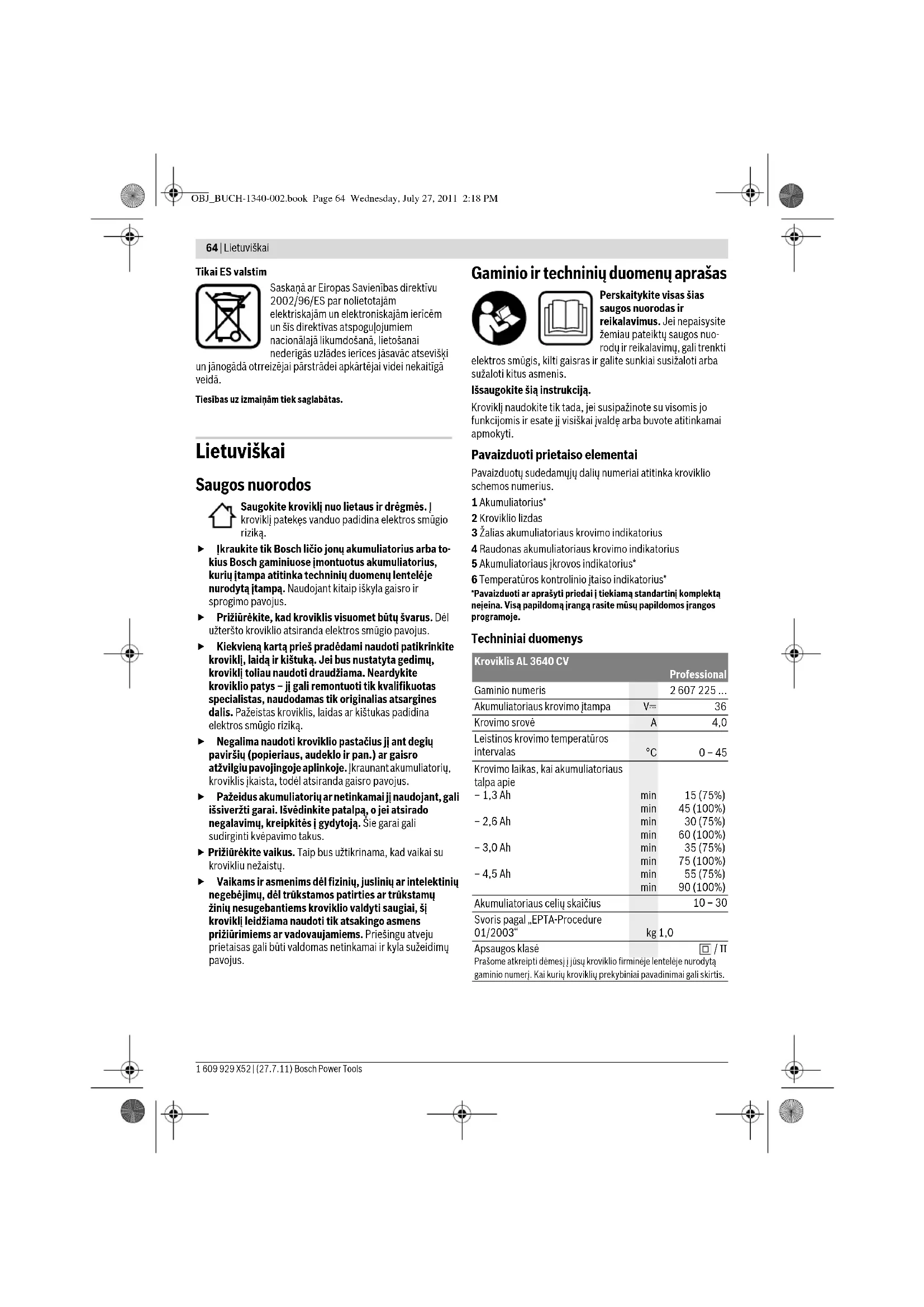 Akumuliatoriaus krovimo įtampa V36 Krovimo srovė A4,0 Leistinos krovimo temperatūros intervalas °C 0 – 45 Krovimo laikas, kai akumuliatoriaus talpa apie – 1,3 Ah – 2,6 Ah – 3,0 Ah – 4,5 Ah min min min min min min min min 15 (75%) 45 (100%) 30 (75%) 60 (100%) 35 (75%) 75 (100%) 55 (75%) 90 (100%) Akumuliatoriaus celių skaičius 10 – 30 Svoris pagal „EPTA-Procedure 01/2003“ kg 1,0 Apsaugos klasė / II Prašome atkreipti dėmesį į jūsų kroviklio firminėje lentelėje nurodytą gaminio numerį. Kai kurių kroviklių prekybiniai pavadinimai gali skirtis. OBJ_BUCH-1340-002.book Page 64 Wednesday, July 27, 2011 2:18 PMLietuviškai | 65 Bosch Power Tools 1 609 929 X52 | (27.7.11) Naudojimas Paruošimas naudoti f Atkreipkite dėmesį į elektros tinklo įtampą! Elektros srovės šaltinio įtampa turi atitikti nurodytąją kroviklio firminėje lentelėje. 230 V įtampai skirti prietaisai gali būti jungiami į 220 V įtampos tinklą. Įkrovimo procesas Akumuliatorius pradedamas krauti, kai kroviklio kištukas įkišamas į kištukinį lizdą ir akumuliatorius 1 įstatomas į kroviklio lizdą 2. Dėl taikomos „intelektualios“ įkrovimo technologijos, kroviklis automatiškai įvertina akumuliatoriaus įkrovos būklę ir priklausomai nuo akumuliatoriaus temperatūros ir įtampos jį įkrauna optimalia krovimo srove. Tai padeda tausoti akumuliatorių, be to, palikus akumuliatorių kroviklyje, jis visada būna visiškai įkrautas. Indikatorių reikšmės Mirksintis žalias akumuliatoriaus krovimo indikatorius 3 Apie greitojo įkrovimo procesą praneša mirksintis žalias akumuliatoriaus krovimo indikatorius 3. Akumuliatorių įkraunant vienas po kito užsidega ir trumpam užgęsta trys žali akumuliatoriaus įkrovos būklės indikatoriai 5. Akumuliatorius yra visiškai įkrautas, kai trys žali indikatoriai dega nuolat. Praėjus apytikriai 5 minutėms po akumuliatoriaus visiško įkrovimo, trys žali indikatoriai vėl užgęsta. Nuoroda: greitojo įkrovimo procesas galimas tik tada, jei akumuliatoriaus temperatūra yra leistinos įkrovimo temperatūros intervale, žr. skyrių „Techniniai duomenys“. Nuolat degantis žalias akumuliatoriaus krovimo indikatorius 3 Nuolat degantis žalias akumuliatoriaus krovimo indikatorius 3 praneša, kad akumuliatorius yra visiškai įkrautas. Taip pat maždaug 2 sekundėms pasigirsta garsinis signalas, kuris garsiniu būdu praneša, kad akumuliatorius visiškai įkrautas. Akumuliatorių galima išimti ir iš karto naudoti. Jei akumuliatorius neįstatytas, degantis akumuliatoriaus krovimo indikatorius 3 praneša, kad kištukas yra įkištas į lizdą, o kroviklis paruoštas naudoti. Nuolat degantis raudonas akumuliatoriaus krovimo indikatorius 4 Nuolat degantis raudonas akumuliatoriaus krovimo indikatorius 4 praneša, kad akumuliatoriaus temperatūra yra už leistinos krovimo temperatūros ribų, žr. skyrių „Techniniai duomenys“. Kai tik pasiekiamas leistinos temperatūros intervalas, kroviklis automatiškai persijungia į greitojo įkrovimo režimą. Jei įstatant akumuliatorių į kroviklį ties juo užsidega raudonas temperatūros kontrolės indikatorius 6, vadinasi akumuliatoriaus temperatūra yra už leistinos krovimo temperatūros ribų (žr. skyrių „Techniniai duomenys“). Akumuliatorius bus kraunamas tik tada, kai temperatūra pasieks leistinas ribas. Mirksintis raudonas akumuliatoriaus krovimo indikatorius 4 Mirksintis raudonas akumuliatoriaus krovimo indikatorius 4 praneša apie įkrovimo proceso sutrikimą, žr. skyrių „Gedimai – priežastys ir pašalinimas“. Gedimai – priežastys ir pašalinimas Darbo patarimai Nuolat veikdamas arba be pertraukos vieną po kito kraudamas kelis akumuliatorius, kroviklis gali įkaisti. Tai yra normalu ir nereiškia kroviklio techninio gedimo. Pastebimas įkrauto akumuliatoriaus veikimo laiko sutrumpėjimas rodo, kad akumuliatorius susidėvėjo ir jį reikia pakeisti. Akumuliatoriaus aušinimas („Active Air Cooling“) Kroviklyje integruotas ventiliatoriaus valdymo įtaisas kontroliuoja įstatyto akumuliatoriaus temperatūrą. Jei akumuliatoriaus temperatūra aukštesnė už 30 °C, ventiliatorius akumuliatorių aušina iki optimalios įkrovimo temperatūros. Įjungtas ventiliatorius skleidžia triukšmą. Jei ventiliatorius neveikia, vadinasi akumuliatoriaus temperatūra yra optimalios įkrovimo temperatūros intervale arba ventiliatorius yra pažeistas. Tokiu atveju, akumuliatoriaus įkrovimo laikas pailgėja. Priežastis Pašalinimas Raudonas akumuliatoriaus krovimo indikatorius 4 mirksi Nevyksta įkrovimo procesas Akumuliatorius neįdėtas (netinkamai įdėtas) Akumuliatorių tinkamai įdėkite į kroviklį Nešvarūs akumuliatoriaus kontaktai Nuvalykite akumuliatoriaus kontaktus (pvz., daug kartų įstatykite ir išimkite akumu- liatorių), jei reikia, akumuliatorių pakeiskite Akumuliatorius pažeistas Akumuliatorių pakeiskite Akumuliatoriaus krovimo indikatorius 3 ar 4 nedega Neįkištas (netinkamai įkištas) kroviklio kištukas Kištuką tinkamai įkiškite į kištukinį lizdą Pažeistas kištukinis lizdas, maitinimo laidas arba kroviklis Patikrinkite maitinimo įtampą, jei reikia, dėl kroviklio patikrinimo kreipkitės į Bosch elektrinių įrankių remonto dirbtuves OBJ_BUCH-1340-002.book Page 65 Wednesday, July 27, 2011 2:18 PM66 | Lietuviškai 1 609 929 X52 | (27.7.11) Bosch Power Tools Priežiūra ir servisas Priežiūra ir valymas Jei nepaisant kruopščios gamybos ir patikrinimo kroviklis sugestų, jo remontas turi būti atliekamas įgaliotose Bosch elektrinių įrankių remonto dirbtuvėse. Siunčiant užklausimą ar užsakant atsargines dalis prašome būtinai nurodyti kroviklio dešimtženklį numerį, esantį firminėje lentelėje. Klientų aptarnavimo skyrius ir klientų konsultavimo tarnyba Klientų aptarnavimo skyriuje gausite atsakymus į klausimus, susijusius su jūsų gaminio remontu, technine priežiūra bei atsarginėmis dalimis. Detalius brė