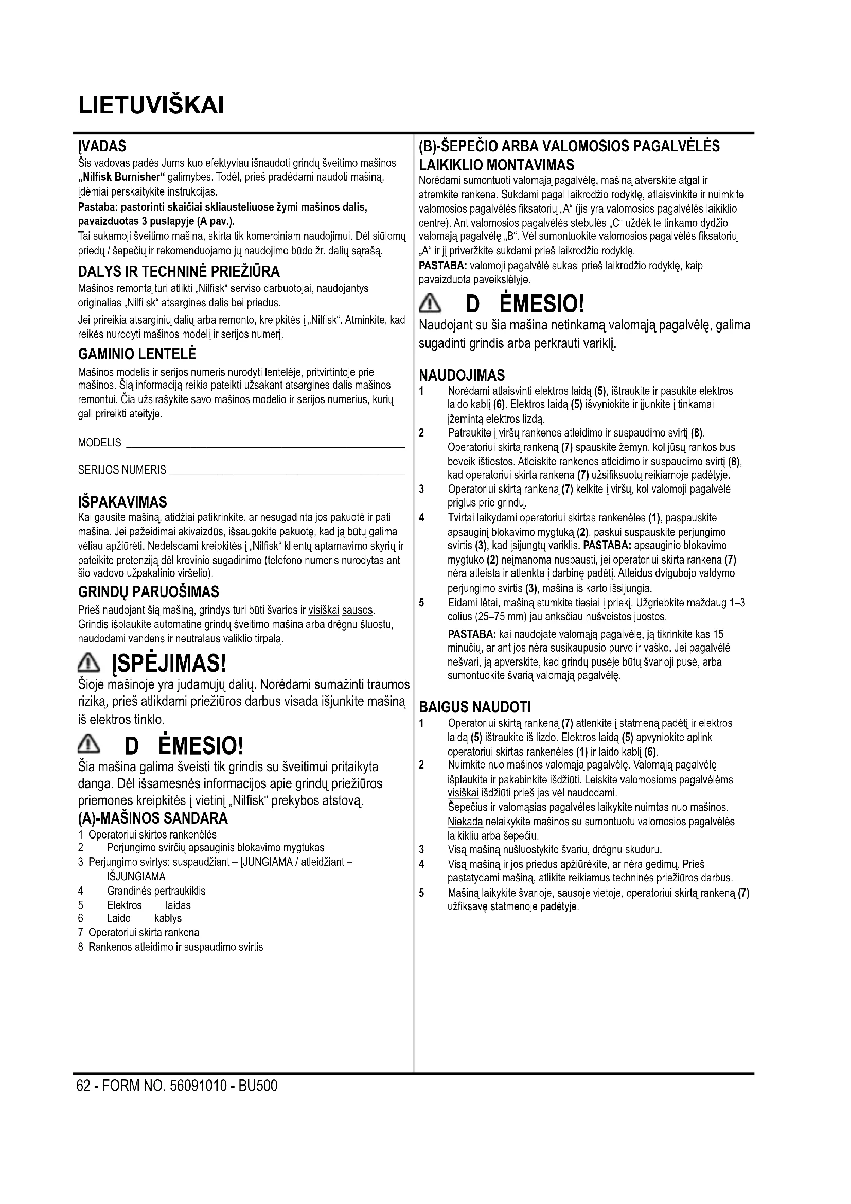 1 Operatoriui skirtos rankenėlės 2 Perjungimo svirčių apsauginis blokavimo mygtukas 3 Perjungimo svirtys: suspaudžiant – ĮJUNGIAMA / atleidžiant – IŠJUNGIAMA 4 Grandinės pertraukiklis 5 Elektros laidas 6 Laido kablys 7 Operatoriui skirta rankena 8 Rankenos atleidimo ir suspaudimo svirtis (B)-ŠEPEČIO ARBA VALOMOSIOS PAGALVĖLĖS LAIKIKLIO MONTAVIMAS Norėdami sumontuoti valomąją pagalvėlę, mašiną atverskite atgal ir atremkite rankena. Sukdami pagal laikrodžio rodyklę, atlaisvinkite ir nuimkite valomosios pagalvėlės fi ksatorių „A“ (jis yra valomosios pagalvėlės laikiklio centre). Ant valomosios pagalvėlės stebulės „C“ uždėkite tinkamo dydžio valomąją pagalvėlę „B“. Vėl sumontuokite valomosios pagalvėlės fi ksatorių „A“ ir jį priveržkite sukdami prieš laikrodžio rodyklę. PASTABA: valomoji pagalvėlė sukasi prieš laikrodžio rodyklę, kaip pavaizduota paveikslėlyje. DĖMESIO! Naudojant su šia mašina netinkamą valomąją pagalvėlę, galima sugadinti grindis arba perkrauti variklį. NAUDOJIMAS 1 Norėdami atlaisvinti elektros laidą (5), ištraukite ir pasukite elektros laido kablį (6). Elektros laidą (5) išvyniokite ir įjunkite į tinkamai įžemintą elektros lizdą. 2 Patraukite į viršų rankenos atleidimo ir suspaudimo svirtį (8). Operatoriui skirtą rankeną (7) spauskite žemyn, kol jūsų rankos bus beveik ištiestos. Atleiskite rankenos atleidimo ir suspaudimo svirtį (8), kad operatoriui skirta rankena (7) užsifi ksuotų reikiamoje padėtyje. 3 Operatoriui skirtą rankeną (7) kelkite į viršų, kol valomoji pagalvėlė priglus prie grindų. 4 Tvirtai laikydami operatoriui skirtas rankenėles (1), paspauskite apsauginį blokavimo mygtuką (2), paskui suspauskite perjungimo svirtis (3), kad įsijungtų variklis. PASTABA: apsauginio blokavimo mygtuko (2) neįmanoma nuspausti, jei operatoriui skirta rankena (7) nėra atleista ir atlenkta į darbinę padėtį. Atleidus dvigubojo valdymo perjungimo svirtis (3), mašina iš karto išsijungia. 5 Eidami lėtai, mašiną stumkite tiesiai į priekį. Užgriebkite maždaug 1–3 colius (25–75 mm) jau anksčiau nušveistos juostos. PASTABA: kai naudojate valomąją pagalvėlę, ją tikrinkite kas 15 minučių, ar ant jos nėra susikaupusio purvo ir vaško. Jei pagalvėlė nešvari, ją apverskite, kad grindų pusėje būtų švarioji pusė, arba sumontuokite švarią valomąją pagalvėlę. BAIGUS NAUDOTI 1 Operatoriui skirtą rankeną (7) atlenkite į statmeną padėtį ir elektros laidą (5) ištraukite iš lizdo. Elektros laidą (5) apvyniokite aplink operatoriui skirtas rankenėles (1) ir laido kablį (6). 2 Nuimkite nuo mašinos valomąją pagalvėlę. Valomąją pagalvėlę išplaukite ir pakabinkite išdžiūti. Leiskite valomosioms pagalvėlėms visiškai išdžiūti prieš jas vėl naudodami. Šepečius ir valomąsias pagalvėles laikykite nuimtas nuo mašinos. Niekada nelaikykite mašinos su sumontuotu valomosios pagalvėlės laikikliu arba šepečiu. 3 Visą mašiną nušluostykite švariu, drėgnu skuduru. 4 Visą mašiną ir jos priedus apžiūrėkite, ar nėra gedimų. Prieš pastatydami mašiną, atlikite reikiamus techninės priežiūros darbus. 5 Mašiną laikykite švarioje, sausoje vietoje, operatoriui skirtą rankeną (7) užfi ksavę statmenoje padėtyje.FORM NO. 56091010 - BU500 - 63
