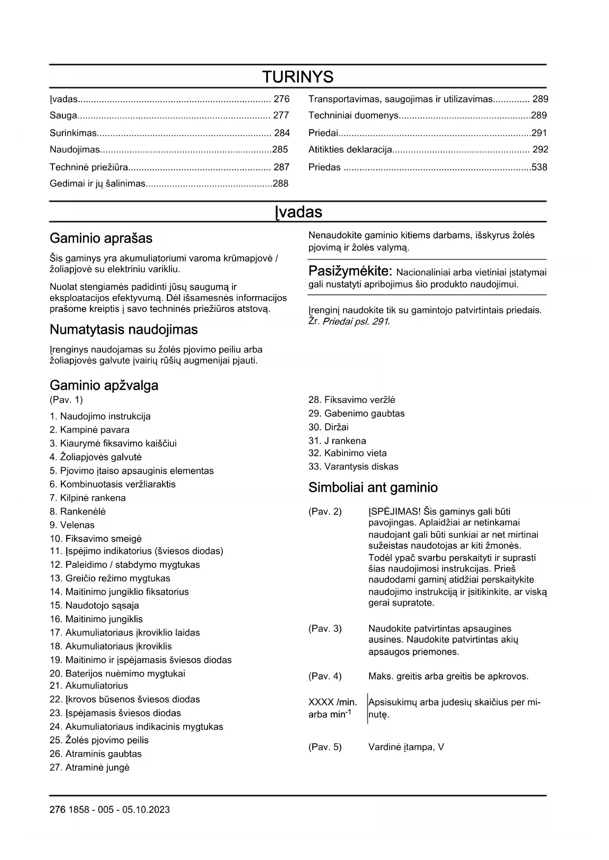 Apsisukimų arba judesių skaičius per mi- nutę. (Pav. 5) Vardinė įtampa, V 276 1858 - 005 - 05.10.2023(Pav. 6) Nuolatinė srovė. (Pav. 7) Šis gaminys atitinka taikomas EB direktyvas. (Pav. 8) Šis gaminys atitinka taikytinų JK reglamentų nuostatas. (Pav. 9) Naudokite patvirtintas apsaugines pirštines. (Pav. 10) Avėkite patvarius, neslystančius batus. (Pav. 11) Saugokitės peilio atmetimo. (Pav. 12) Ant produkto ar ant jo pakuotės pateikti simboliai rodo, kad šio gaminio negalima išmesti kartu su buitinėmis atliekomis. Šį produktą reikia atiduoti į tinkamą perdirbimo įstaigą. (Pav. 13) Įtaisas gali stipriai išsviesti objektus, kurie gali atšokti atgal. ir sunkiai sužaloti akis, jeigu nenaudojate rekomenduojamos saugos įrangos. (Pav. 14) Prieš atlikdami techninę apžiūrą atjunkite akumuliatorių. (Pav. 15) Įrenginys apsaugotas nuo vandens purslų. (Pav. 16) Jokia kūno dalimi nesilieskite prie įkaitusių paviršių. (Pav. 17) Triukšmo emisijos į aplinką ženklinimas atitinka ES ir JK direktyvas bei reglamentus ir Naujojo Pietų Velso įstatymą „2017m. aplinkos apsaugos (triukšmo kontrolės) reglamentas“. Gaminio garantuotasis garso galios lygis nurodytas Techniniai duomenys psl. 289