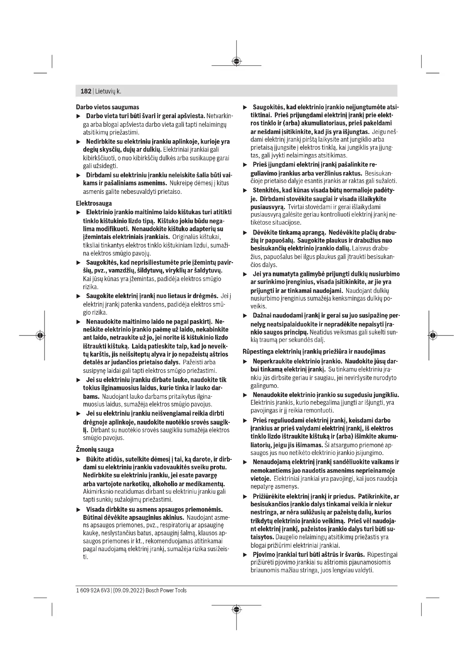 6mm 2–20 8mm 10–40 10mm 20–60 12mm 30–80 – Iestatiet triecienspēku uz augstāko pakāpi. – Ielieciet piemērotu skavu joslu(14). – Papīra skavotāja/starplikas(13) izciļņus secīgi ieklikšķiniet papīra skavotāja(11) ierobos uz elektroinstrumenta. Ņemiet vērā, ka tikai ierobs1 ir paredzēts papīra skavošanai. – Ielieciet papīra lapu kaudzi papīra skavotājā/ starplikā(13) un novietojiet triecienizvadu virs papīra skavojamās vietas. – Stingri spiediet elektroinstrumentu uz leju, līdz triecienizvads(1) ir pilnībā iespiests. – Saglabājiet vertikālu spiedienu un nospiediet palaidēju(2). – Kad skava ir pilnībā iestiprināta, atlaidiet palaidēju(2) un noceliet triecienizvadu(1) no papīra lapu kaudzes. Skavojiet ar vienādu attālu līdz materiāla malai (skatīt attēlu C1C2) Norāde: Starplikai (13) ir jāieklikšķina skavotājā ar vienādiem attālumiem ierobos (10) uz elektroinstrumenta. Ierobi 2–7(10) Attālums Ierobs 2 1cm Ierobs 3 3cm Ierobs 4 5cm Ierobs 5 7cm Ierobs 6 9cm Ierobs 7 11cm – Ielieciet piemērotu skavu joslu(14) vai naglu joslu(15). – Papīra skavotāja/starplikas(13) izciļņus secīgi ieklikšķiniet ierobā(10) uz elektroinstrumenta, kas nodrošina piemērotu attālumu līdz materiāla malai. Ņemiet vērā, ka ierobs1 nav piemērots skavošanai ar vienādu attālumu. – Spiediet papīra skavotāja/starplikas(13) elastīgo apakšmalu elektroinstrumenta virzienā līdz tā ieguļas vietā. – Vadiet elektroinstrumentu līdzeni pāri darba materiālam, līdz darba materiāla mala atduras pret papīra skavotāja/ starplikas(13) priekšējo malu.. – Stingri spiediet elektroinstrumentu uz leju, līdz triecienizvads(1) ir pilnībā iespiests. 1 609 92A 6V3 | (09.09.2022) Bosch Power ToolsLietuvių k. | 181 – Saglabājiet vertikālu spiedienu un nospiediet palaidēju(2). – Kad skava/nagla ir pilnībā iestiprināta, atlaidiet palaidēju(2) un pastumiet triecienizvadu(1) gar darba materiāla malu. – Novietojiet nākamo skavu vai nākamo naglu. Apkalpošana un apkope Apkalpošana un tīrīšana u Veicot jebkurus darbus ar elektroinstrumentu (piemēram, apkalpošanu, darbinstrumentu nomaiņu utt.), kā arī pirms tā transportēšanas vai uzglabāšanas vienmēr izņemiet no elektroinstrumenta akumulatoru. Ieslēdzēja nejauša nospiešana var izraisīt savainojumu. u Lai elektroinstruments darbotos droši un bez atteikumiem, regulāri tīriet tā korpusu un ventilācijas atveres. Klientu apkalpošanas dienests un konsultācijas par lietošanu Klientu apkalpošanas dienests atbildēs uz Jūsu jautājumiem par izstrādājumu remontu un apkalpošanu, kā arī par to rezerves daļām. Kopsalikuma attēlus un informāciju par rezerves daļām Jūs varat atrast interneta vietnē: www.bosch-pt.com Bosch konsultantu grupa palīdzēs Jums vislabākajā veidā rast atbildes uz jautājumiem par mūsu izstrādājumiem un to piederumiem. Pieprasot konsultācijas un pasūtot rezerves daļas, noteikti paziņojiet 10zīmju izstrādājuma numuru, kas norādīts uz izstrādājuma marķējuma plāksnītes. Latvijas Republika Robert Bosch SIA Bosch elektroinstrumentu servisa centrs Mūkusalas ielā 97 LV-1004 Rīga Tālr.: 67146262 Telefakss: 67146263 E-pasts: service-pt@lv.bosch.com Papildu klientu apkalpošanas dienesta adreses skatiet šeit: www.bosch-pt.com/serviceaddresses Transportēšana Ieteicamajiem litija jonu akumulatoriem ir piemērojami Bīstamo kravu aprites likuma noteikumi. Lietotājs var transportēt akumulatorus ielu transporta plūsmā bez papildu nosacījumiem. Pārsūtot tos ar trešo personu starpniecību (piemēram, ar gaisa transporta vai citu transporta aģentūru starpniecību), jāievēro īpaši sūtījuma iesaiņošanas un marķēšanas noteikumi. Tāpēc sūtījumu sagatavošanas laikā jāpieaicina bīstamo kravu pārvadāšanas speciālists. Pārsūtiet akumulatoru tikai tad, ja tā korpuss nav bojāts. Aizlīmējiet vaļējos akumulatora kontaktus un iesaiņojiet akumulatoru tā, lai tas iesaiņojumā nepārvietotos. Lūdzam ievērot arī ar akumulatoru pārsūtīšanu saistītos nacionālos noteikumus, ja tādi pastāv. Atbrīvošanās no nolietotajiem izstrādājumiem Nolietotie elektroinstrumenti, akumulatori, piederumi un iesaiņojuma materiāli jāpakļauj otrreizējai pārstrādei apkārtējai videi nekaitīgā veidā. Neizmetiet nolietotos elektroinstrumentus, akumulatorus un baterijas sadzīves atkritumu tvertnē! Tikai EK valstīm. Saskaņā ar Eiropas Savienības direktīvu 2012/19/ES par nolietotajām elektriskajām un elektroniskajām ierīcēm un šīs direktīvas atspoguļojumiem nacionālajā likumdošanā, lietošanai nederīgi elektroinstrumenti un saskaņā ar Eiropas Savienības direktīvu 2006/66/EK, bojāti vai izlietoti akumulatori/baterijas ir jāsavāc atsevišķi un jānogādā otrreizējai pārstrādei apkārtējai videi nekaitīgā veidā. Ja elektriskās un elektroniskās ierīces netiek atbilstoši utilizētas, tās var kaitēt videi un cilvēku veselībai iespējamās bīstamo vielu klātbūtnes dēļ. Akumulatori/baterijas: Litija-jonu: Lūdzam ievērot sadaļā "Transportēšana" sniegtos norādījumus (skatīt „Transportēšana“, Lappuse181). Lietuvių k. Saugos nuorodos Bendrosios saugos nuorodos dirbantiems su elektriniais įrankiais ĮSPĖJIMAS Perskaitykite visus su šiuo elektri- niu įrankiu pateikiamus saugos įspėjimus, instrukcijas, peržiūrėkite iliustracijas ir speci- fikacijas. Jei nepaisysite visų žemiau pateiktų instrukcijų, galite patirti elektros smūgį, sukelti gaisrą ir sunkiai susižaloti arba sužaloti kitus asmenis. Išsaugokite šias saugos nuorodas ir reikalavimus, kad ir ateityje galėtumėte jais pasinaudoti. Toliau pateiktame tekste vartojama sąvoka „Elektrinis įra- nkis“ apibūdina įrankius, maitinamus iš elektros tinklo (su maitinimo laidu), ir akumuliatorinius įrankius (be maitinimo laido). Bosch Power Tools 1 609 92A 