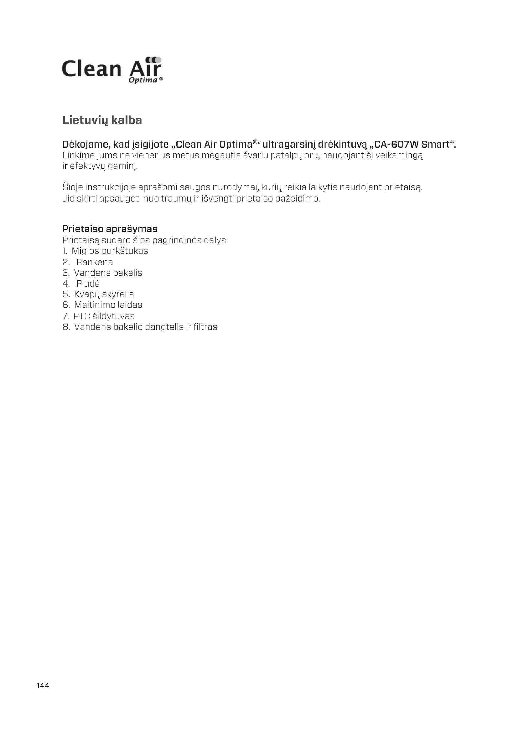 CA-607W Smart / Ekranas144 Lietuvių kalba Dėkojame, kad įsigijote „Clean Air Optima®“ ultragarsinį drėkintuvą „CA-607W Smart“. Linkime jums ne vienerius metus mėgautis švariu patalpų oru, naudojant šį veiksmingą ir efektyvų gaminį. Šioje instrukcijoje aprašomi saugos nurodymai, kurių reikia laikytis naudojant prietaisą. Jie skirti apsaugoti nuo traumų ir išvengti prietaiso pažeidimo. Prietaiso aprašymas Prietaisą sudaro šios pagrindinės dalys: