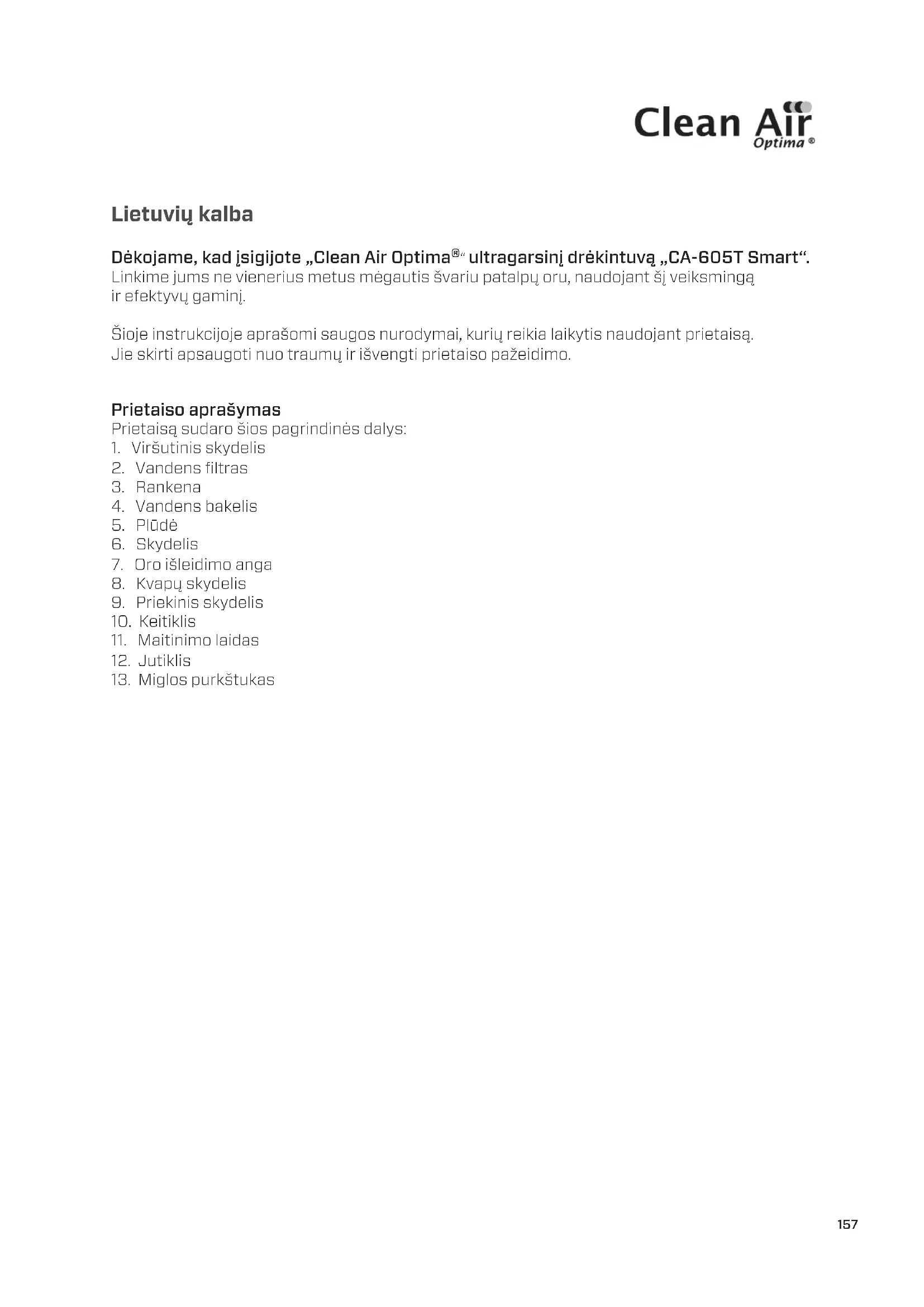 CA-605T Smart / Ekranas157 Lietuvių kalba Dėkojame, kad įsigijote „Clean Air Optima®“ ultragarsinį drėkintuvą „CA-605T Smart“. Linkime jums ne vienerius metus mėgautis švariu patalpų oru, naudojant šį veiksmingą ir efektyvų gaminį. Šioje instrukcijoje aprašomi saugos nurodymai, kurių reikia laikytis naudojant prietaisą. Jie skirti apsaugoti nuo traumų ir išvengti prietaiso pažeidimo. Prietaiso aprašymas Prietaisą sudaro šios pagrindinės dalys: