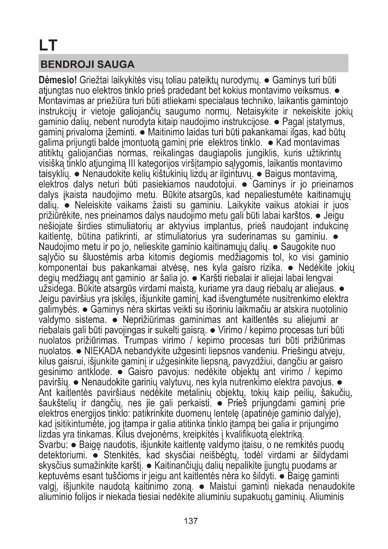 Infokood Kirjeldus Võimalik põhjus Lahendus Nupud lülituvad liiga kõrge temperatuuri tõttu välja. Elektrooniliste osade sisetemperatuur on liiga kõrge. Oodake enne uuesti kasutama hakkamist, et pliit jahtuks. Ebasobiv anum. Magnetilised omadused halvenevad. Eemaldage anum. Kasutajaliidese ja induktsioonimooduli ühendumisprobleemid. Moodulil puudub elektrivool; toitejuhe pole korralikult ühendatud või on defektne Eemaldage pliit võrgust ja kontrollige ühendust. Kõikide muude veateavituste korral Helistage teenindusse ja teatage veakood. TEHNILISED ANDMED Kõrgus (cm) Pikkus (cm) Sügavus (cm) 22,3 83 51,5 Tootega mitte kaasas olevad komponendid Saate alla laadida ohutusjuhised, kasutusjuhendi, tehnilised ja elektriühendust puudutavad andmed mitmel moel. Külastage veebisaiti docs. bauknecht.eu Kasutage QR-koodi Lisaks võite võtta ühendust müügijärgse teenindusega (garantiidokumendis tood telefoninumbril). Teeninduskeskusesse pöördudes tuleb teil teatada toote identifitseerimiskoodid. 136LT BENDROJI SAUGA Dėmesio! Griežtai laikykitės visų toliau pateiktų nurodymų. ● Gaminys turi būti atjungtas nuo elektros tinklo prieš pradedant bet kokius montavimo veiksmus. ● Montavimas ar priežiūra turi būti atliekami specialaus techniko, laikantis gamintojo instrukcijų ir vietoje galiojančių saugumo normų. Netaisykite ir nekeiskite jokių gaminio dalių, nebent nurodyta kitaip naudojimo instrukcijose. ● Pagal įstatymus, gaminį privaloma įžeminti. ● Maitinimo laidas turi būti pakankamai ilgas, kad būtų galima prijungti balde įmontuotą gaminį prie elektros tinklo. ● Kad montavimas atitiktų galiojančias normas, reikalingas daugiapolis jungiklis, kuris užtikrintų visišką tinklo atjungimą III kategorijos viršįtampio sąlygomis, laikantis montavimo taisyklių. ● Nenaudokite kelių kištukinių lizdų ar ilgintuvų. ● Baigus montavimą, elektros dalys neturi būti pasiekiamos naudotojui. ● Gaminys ir jo prieinamos dalys įkaista naudojimo metu. Būkite atsargūs, kad nepaliestumėte kaitinamųjų dalių. ● Neleiskite vaikams žaisti su gaminiu. Laikykite vaikus atokiai ir juos prižiūrėkite, nes prieinamos dalys naudojimo metu gali būti labai karštos. ● Jeigu nešiojate širdies stimuliatorių ar aktyvius implantus, prieš naudojant indukcinę kaitlentę, būtina patikrinti, ar stimuliatorius yra suderinamas su gaminiu. ● Naudojimo metu ir po jo, nelieskite gaminio kaitinamųjų dalių. ● Saugokite nuo sąlyčio su šluostėmis arba kitomis degiomis medžiagomis tol, ko visi gaminio komponentai bus pakankamai atvėsę, nes kyla gaisro rizika. ● Nedėkite jokių degių medžiagų ant gaminio ar šalia jo. ● Karšti riebalai ir aliejai labai lengvai užsidega. Būkite atsargūs virdami maistą, kuriame yra daug riebalų ar aliejaus. ● Jeigu paviršius yra įskilęs, išjunkite gaminį, kad išvengtumėte nusitrenkimo elektra galimybės. ● Gaminys nėra skirtas veikti su išoriniu laikmačiu ar atskira nuotolinio valdymo sistema. ● Neprižiūrimas gaminimas ant kaitlentės su aliejumi ar riebalais gali būti pavojingas ir sukelti gaisrą. ● Virimo / kepimo procesas turi būti nuolatos prižiūrimas. Trumpas virimo / kepimo procesas turi būti prižiūrimas nuolatos. ● NIEKADA nebandykite užgesinti liepsnos vandeniu. Priešingu atveju, kilus gaisrui, išjunkite gaminį ir užgesinkite liepsną, pavyzdžiui, dangčiu ar gaisro gesinimo antklode. ● Gaisro pavojus: nedėkite objektų ant virimo / kepimo paviršių. ● Nenaudokite garinių valytuvų, nes kyla nutrenkimo elektra pavojus. ● Ant kaitlentės paviršiaus nedėkite metalinių objektų, tokių kaip peilių, šakučių, šaukštelių ir dangčių, nes jie gali perkaisti. ● Prieš prijungdami gaminį prie elektros energijos tinklo: patikrinkite duomenų lentelę (apatinėje gaminio dalyje), kad įsitikintumėte, jog įtampa ir galia atitinka tinklo įtampą bei galia ir prijungimo lizdas yra tinkamas. Kilus dvejonėms, kreipkitės į kvalifikuotą elektriką. Svarbu: ● Baigę naudotis, išjunkite kaitlentę valdymo įtaisu, o ne remkitės puodų detektoriumi. ● Stenkitės, kad skysčiai neišbėgtų, todėl virdami ar šildydami skysčius sumažinkite karštį. ● Kaitinančiųjų dalių nepalikite įjungtų puodams ar keptuvėms esant tuščioms ir jeigu ant kaitlentės nėra ko šildyti. ● Baigę gaminti valgį, išjunkite naudotą kaitinimo zoną. ● Maistui gaminti niekada nenaudokite aliuminio folijos ir niekada tiesiai nedėkite aliuminiu supakuotų gaminių. Aliuminis 137prilips ir nepataisomai sugadins jūsų gaminį. ● Niekada nešildykite skardinių su maistu prieš tai jų neatidarę: jos gali sprogti! Šis perspėjimas taikomas ir visų kitų rūšių kaitlentėms. ● Padidintos galios naudojimas, pavyzdžiui, „Booster“ funkcija, nėra pritaikyta kai kurių skysčių, tokių kaip kepimo aliejus, šildymui. Per didelis karštis gali būti pavojingas. Tokiais atvejais, patariame naudoti mažesnę galią. ● Indai turi būti uždėti tiesiogiai kaitlentės centre. Jokiais būdais nedėkite kokių nors objektų tarp puodo ar keptuvės ir kaitlentės paviršiaus. ● Esant per aukštai temperatūrai, gaminys automatiškai sumažina kaitinimo zonų galios lygį. ● Prieš pradėdami bet kokius valymo arba priežiūros darbus, atjunkite gaminį nuo elektros energijos tinklo, ištraukdami kištuką arba atjungdami bendrą gyvenamosios patalpos maitinimo jungiklį. ● Visų montavimo ir priežiūros darbų metu mūvėkite darbines pirštines. ● Gaminį gali naudoti ne mažesni nei 8 metų vaikai ir fizinę, jutiminę arba protinę negalią turintys asmenys arba asmenys, neturintys patirties arba reikalingų žinių, jei jie yra prižiūrimi arba jei jiems buvo pateiktos instrukcijos apie saugų gaminio naudojimą ir su juo susijusius pavojus. ● Vaikai turi būti prižiūrimi, kad nežaistų su gaminiu. ● Draudžiama atlikti prie
