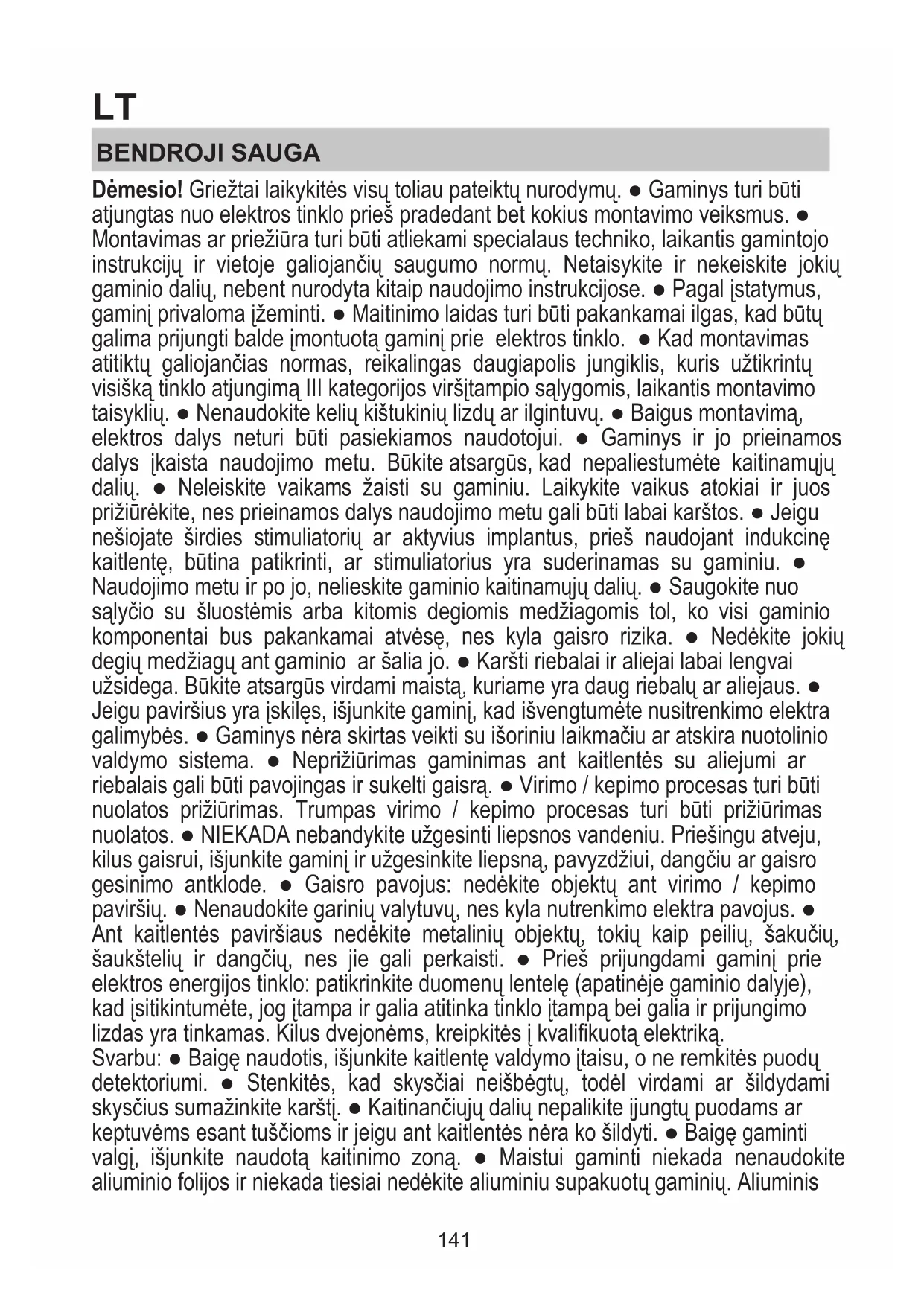 Infokood Kirjeldus Võimalik põhjus Lahendus Nupud lülituvad liiga kõrge temperatuuri tõttu välja. Elektrooniliste osade sisetemperatuur on liiga kõrge. Oodake enne uuesti kasutama hakkamist, et pliit jahtuks. Ebasobiv anum. Magnetilised omadused halvenevad. Eemaldage anum. Kasutajaliidese ja induktsioonimooduli ühendumisprobleemid. Moodulil puudub elektrivool; toitejuhe pole korralikult ühendatud või on defektne Eemaldage pliit võrgust ja kontrollige ühendust. Kõikide muude veateavituste korral Helistage teenindusse ja teatage veakood. 139TEHNILISED ANDMED Kõrgus (cm) Pikkus (cm) Sügavus (cm) 25 65 51,5 Tootega mitte kaasas olevad komponendid Saate alla laadida ohutusjuhised, kasutusjuhendi, tehnilised ja elektriühendust puudutavad andmed mitmel moel. Külastage veebisaiti docs. bauknecht.eu Kasutage QR-koodi Lisaks võite võtta ühendust müügijärgse teenindusega (garantiidokumendis tood telefoninumbril). Teeninduskeskusesse pöördudes tuleb teil teatada toote identifitseerimiskoodid. 140LT BENDROJI SAUGA Dėmesio! Griežtai laikykitės visų toliau pateiktų nurodymų. ● Gaminys turi būti atjungtas nuo elektros tinklo prieš pradedant bet kokius montavimo veiksmus. ● Montavimas ar priežiūra turi būti atliekami specialaus techniko, laikantis gamintojo instrukcijų ir vietoje galiojančių saugumo normų. Netaisykite ir nekeiskite jokių gaminio dalių, nebent nurodyta kitaip naudojimo instrukcijose. ● Pagal įstatymus, gaminį privaloma įžeminti. ● Maitinimo laidas turi būti pakankamai ilgas, kad būtų galima prijungti balde įmontuotą gaminį prie elektros tinklo. ● Kad montavimas atitiktų galiojančias normas, reikalingas daugiapolis jungiklis, kuris užtikrintų visišką tinklo atjungimą III kategorijos viršįtampio sąlygomis, laikantis montavimo taisyklių. ● Nenaudokite kelių kištukinių lizdų ar ilgintuvų. ● Baigus montavimą, elektros dalys neturi būti pasiekiamos naudotojui. ● Gaminys ir jo prieinamos dalys įkaista naudojimo metu. Būkite atsargūs, kad nepaliestumėte kaitinamųjų dalių. ● Neleiskite vaikams žaisti su gaminiu. Laikykite vaikus atokiai ir juos prižiūrėkite, nes prieinamos dalys naudojimo metu gali būti labai karštos. ● Jeigu nešiojate širdies stimuliatorių ar aktyvius implantus, prieš naudojant indukcinę kaitlentę, būtina patikrinti, ar stimuliatorius yra suderinamas su gaminiu. ● Naudojimo metu ir po jo, nelieskite gaminio kaitinamųjų dalių. ● Saugokite nuo sąlyčio su šluostėmis arba kitomis degiomis medžiagomis tol, ko visi gaminio komponentai bus pakankamai atvėsę, nes kyla gaisro rizika. ● Nedėkite jokių degių medžiagų ant gaminio ar šalia jo. ● Karšti riebalai ir aliejai labai lengvai užsidega. Būkite atsargūs virdami maistą, kuriame yra daug riebalų ar aliejaus. ● Jeigu paviršius yra įskilęs, išjunkite gaminį, kad išvengtumėte nusitrenkimo elektra galimybės. ● Gaminys nėra skirtas veikti su išoriniu laikmačiu ar atskira nuotolinio valdymo sistema. ● Neprižiūrimas gaminimas ant kaitlentės su aliejumi ar riebalais gali būti pavojingas ir sukelti gaisrą. ● Virimo / kepimo procesas turi būti nuolatos prižiūrimas. Trumpas virimo / kepimo procesas turi būti prižiūrimas nuolatos. ● NIEKADA nebandykite užgesinti liepsnos vandeniu. Priešingu atveju, kilus gaisrui, išjunkite gaminį ir užgesinkite liepsną, pavyzdžiui, dangčiu ar gaisro gesinimo antklode. ● Gaisro pavojus: nedėkite objektų ant virimo / kepimo paviršių. ● Nenaudokite garinių valytuvų, nes kyla nutrenkimo elektra pavojus. ● Ant kaitlentės paviršiaus nedėkite metalinių objektų, tokių kaip peilių, šakučių, šaukštelių ir dangčių, nes jie gali perkaisti. ● Prieš prijungdami gaminį prie elektros energijos tinklo: patikrinkite duomenų lentelę (apatinėje gaminio dalyje), kad įsitikintumėte, jog įtampa ir galia atitinka tinklo įtampą bei galia ir prijungimo lizdas yra tinkamas. Kilus dvejonėms, kreipkitės į kvalifikuotą elektriką. Svarbu: ● Baigę naudotis, išjunkite kaitlentę valdymo įtaisu, o ne remkitės puodų detektoriumi. ● Stenkitės, kad skysčiai neišbėgtų, todėl virdami ar šildydami skysčius sumažinkite karštį. ● Kaitinančiųjų dalių nepalikite įjungtų puodams ar keptuvėms esant tuščioms ir jeigu ant kaitlentės nėra ko šildyti. ● Baigę gaminti valgį, išjunkite naudotą kaitinimo zoną. ● Maistui gaminti niekada nenaudokite aliuminio folijos ir niekada tiesiai nedėkite aliuminiu supakuotų gaminių. Aliuminis 141prilips ir nepataisomai sugadins jūsų gaminį. ● Niekada nešildykite skardinių su maistu prieš tai jų neatidarę: jos gali sprogti! Šis perspėjimas taikomas ir visų kitų rūšių kaitlentėms. ● Padidintos galios naudojimas, pavyzdžiui, „Booster“ funkcija, nėra pritaikyta kai kurių skysčių, tokių kaip kepimo aliejus, šildymui. Per didelis karštis gali būti pavojingas. Tokiais atvejais, patariame naudoti mažesnę galią. ● Indai turi būti uždėti tiesiogiai kaitlentės centre. Jokiais būdais nedėkite kokių nors objektų tarp puodo ar keptuvės ir kaitlentės paviršiaus. ● Esant per aukštai temperatūrai, gaminys automatiškai sumažina kaitinimo zonų galios lygį. ● Prieš pradėdami bet kokius valymo arba priežiūros darbus, atjunkite gaminį nuo elektros energijos tinklo, ištraukdami kištuką arba atjungdami bendrą gyvenamosios patalpos maitinimo jungiklį. ● Visų montavimo ir priežiūros darbų metu mūvėkite darbines pirštines. ● Gaminį gali naudoti ne mažesni nei 8 metų vaikai ir fizinę, jutiminę arba protinę negalią turintys asmenys arba asmenys, neturintys patirties arba reikalingų žinių, jei jie yra prižiūrimi arba jei jiems buvo pateiktos instrukcijos apie saugų gaminio naudojimą ir su juo susijusius pavojus. ● Vaikai turi būti prižiūrimi, kad nežaistų su gaminiu. ● Draudžiama atlikti pri