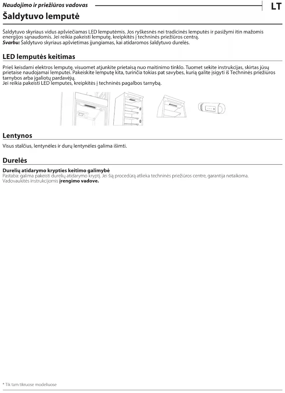 Naudojimo ir priežiūros vadovas Šaldytuvo lemputė Šaldytuvo skyriaus vidus apšviečiamas LED lemputėmis. Jos ryškesnės nei tradicinės lemputės ir pasižymi itin mažomis energijos sąnaudomis. Jei reikia pakeisti lemputę, kreipkitės į techninės priežiūros centrą. Svarbu: Šaldytuvo skyriaus apšvietimas įjungiamas, kai atidaromos šaldytuvo durelės. LED lemputės keitimas Prieš keisdami elektros lemputę, visuomet atjunkite prietaisą nuo maitinimo tinklo. Tuomet sekite instrukcijas, skirtas jūsų prietaise naudojamai lemputei. Pakeiskite lemputę kita, turinčia tokias pat savybes, kurią galite įsigyti iš Techninės priežiūros tarnybos arba įgaliotų pardavėjų. Jei reikia pakeisti LED lemputes, kreipkitės į techninės pagalbos tarnybą. Lentynos Visus stalčius, lentynėles ir durų lentynėles galima išimti. Durelės Durelių atidarymo krypties keitimo galimybė Pastaba: galima pakeisti durelių atidarymo kryptį. Jei šią procedūrą atlieka techninės priežiūros centre, garantija netaikoma. Vadovaukitės instrukcijomis įrengimo vadove.* Tik tam tikruose modeliuose4 Naudojimo ir priežiūros vadovas Kaip naudoti prietaisą Naudojimas pirmą kartą Įrengę, prieš prijungdami prietaisą prie maitinimo, palaukite bent dvi valandas. Prijunkite prietaisą prie elektros tinklo ir jis pradės veikti automatiškai. Tinkamiausios maisto laikymo temperatūros yra iš anksto nustatytos gamykloje. Įjungę prietaisą, turite palaukti 4–6 valandas, kol bus pasiekta tinkama įprastai pripildyto prietaiso laikymo temperatūra. Antibakterinį, nuo kvapų saugantį ltrą įdėkite į ventiliatorių, kaip parodyta ant ltro pakuotės (jei yra). Jei pasigirsta garsinis signalas, vadinasi, buvo suaktyvintas temperatūros signalas: paspauskite mygtuką, kad išjungtumėte garsinį signalą. Šaldytuvo skyrius ir maisto laikymas Šaldytuvo skyrius skirtas šviežiam maistui ir gėrimams laikyti. Šaldytuvo skyrius visiškai atšyla automatiškai. Nuolat pasirodantys vandens lašai vidinėje šaldytuvo skyriaus galinės sienos pusėje yra automatinio atitirpinimo požymis. Atitirpęs vanduo nukreipiamas į angą, paskui teka į talpą, iš kurios išgaruoja. Pastaba: Aplinkos temperatūra, dažnas durų atidarinėjimas ir prietaiso vieta gali turėti įtakos vidinei šių dviejų skyrių temperatūrai. Temperatūrą reguliuokite atsižvelgdami į šiuos veiksnius. Esant labai drėgnoms ir šiltoms sąlygoms, šaldytuvo skyriuose (ypač ant stiklinių lentynų) gali susidaryti kondensacija. Tokiu atveju rekomenduojama uždaryti talpyklas su skysčiais (pvz., perpildytus puodus), suvynioti maistą, turintį didelį vandens kiekį (pvz., daržoves) ir įjungti ventiliatorių, jei jis yra. Visus stalčius, lentynėles ir durų lentynėles galima išimti. Daugiasrautis oro paskirstymas Daugiasrautis oro paskirstymas padeda tolygiai paskirstyti šaltą orą skyriuje ir geriau apsaugoti maistą. Maistą galite laikyti bet kurioje prietaiso lentynėlėje. Atkreipkite dėmesį, kad nebūtų uždengtos oro tiekimo ventiliatorių angos ir oras galėtų laisvai judėti. Kaip laikyti šviežią maistą ir gėrimus Maisto produktus, kurie išskiria daug etileno dujų (obuolius, abrikosus, kriaušes, persikus, avokadus, gas, slyvas, mėlynes, melionus, pupeles) arba yra jautrūs šioms dujoms, pavyzdžiui, vaisiai, daržovės ir salotos, visada reikia laikyti atskirai arba suvynioti, kad juos išlaikytumėte kuo ilgiau; pavyzdžiui, pomidorų nelaikykite kartu su kiviais ar kopūstais. Maisto produktų nelaikykite per arti vienų kitų, kad tarp jų galėtų tinkamai cirkuliuoti oras. Maistui laikyti naudokite perdirbamo plastiko, metalo, aliuminio ir stiklo indelius bei maistinę plėvelę. Jei šaldytuve ketinate laikyti nedidelį maisto produktų kiekį, rekomenduojame naudoti lentynas virš vaisių ir daržovių stalčiaus, nes tai šalčiausia skyriaus vieta. Skysčius ir maisto produktus, kurie gali skleisti stiprius kvapus arba būti jais paveikti, laikykite uždaruose indeliuose arba uždenkite. Kad buteliai neišvirstų, galite pasinaudoti butelių laikikliu (tik tam tikruose modeliuose).
