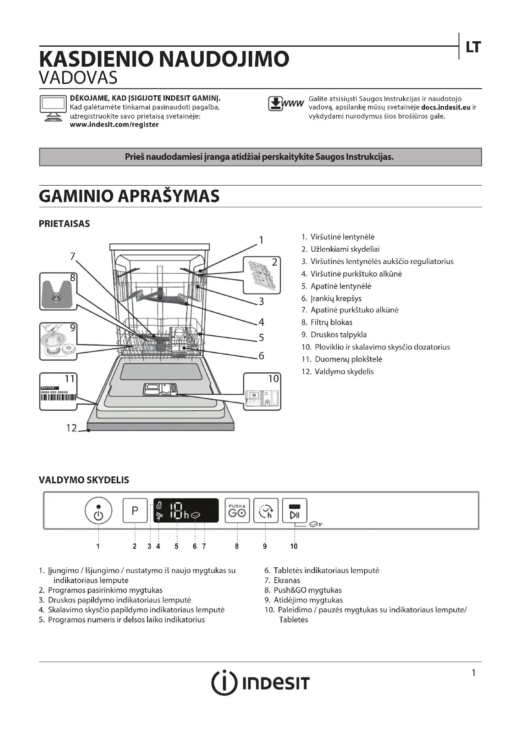 VALDYMO SKYDELISDĖKOJAME, KAD ĮSIGIJOTE INDESIT GAMINĮ. Kad galėtumėte tinkamai pasinaudoti pagalba,užregistruokite savo prietaisą svetainėje:www.indesit.com/registerGalite atsisiųsti Saugos Instrukcijas ir naudotojo vadovą, apsilankę mūsų svetainėje docs.indesit.eu vykdydami nurodymus šios brošiūros gale.1. Viršutinė lentynėlė2. Užlenkiami skydeliai3. Viršutinės lentynėlės aukščio reguliatorius4. Viršutinė purkštuko alkūnė5. Apatinė lentynėlė6. Įrankių krepšys7. Apatinė purkštuko alkūnė8. Filtrų blokas9. Druskos talpykla10. Ploviklio ir skalavimo skysčio dozatorius11. Duomenų plokštelė12. Valdymo skydelis0000 000 00000 Service: