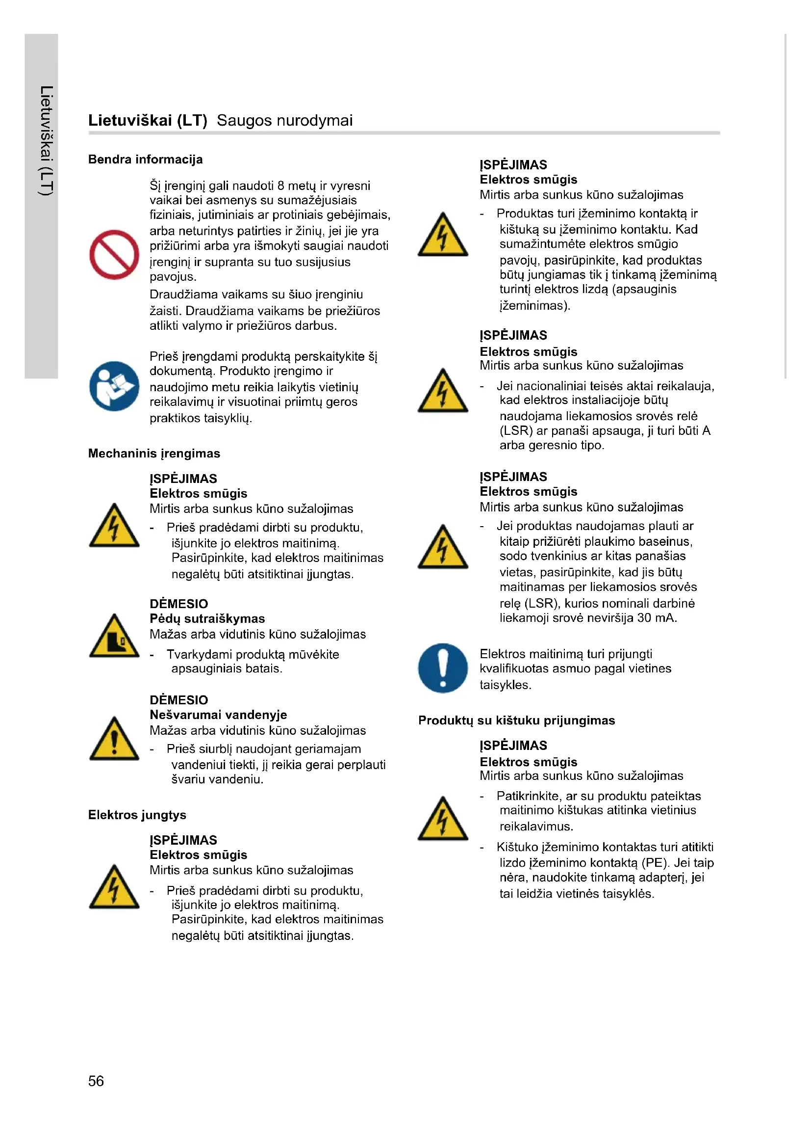 - Operating manual EAC 4 JP and JP Booster Table of contentsLietuviškai (LT) Saugos nurodymai Bendra informacija Šį įrenginį gali naudoti 8 metų ir vyresni vaikai bei asmenys su sumažėjusiais fiziniais, jutiminiais ar protiniais gebėjimais, arba neturintys patirties ir žinių, jei jie yra prižiūrimi arba yra išmokyti saugiai naudoti įrenginį ir supranta su tuo susijusius pavojus. Draudžiama vaikams su šiuo įrenginiu žaisti. Draudžiama vaikams be priežiūros atlikti valymo ir priežiūros darbus. Prieš įrengdami produktą perskaitykite šį dokumentą. Produkto įrengimo ir naudojimo metu reikia laikytis vietinių reikalavimų ir visuotinai priimtų geros praktikos taisyklių. Mechaninis įrengimas ĮSPĖJIMAS Elektros smūgis Mirtis arba sunkus kūno sužalojimas ‐ Prieš pradėdami dirbti su produktu, išjunkite jo elektros maitinimą. Pasirūpinkite, kad elektros maitinimas negalėtų būti atsitiktinai įjungtas. DĖMESIO Pėdų sutraiškymas Mažas arba vidutinis kūno sužalojimas ‐ Tvarkydami produktą mūvėkite apsauginiais batais. DĖMESIO Nešvarumai vandenyje Mažas arba vidutinis kūno sužalojimas ‐ Prieš siurblį naudojant geriamajam vandeniui tiekti, jį reikia gerai perplauti švariu vandeniu. Elektros jungtys ĮSPĖJIMAS Elektros smūgis Mirtis arba sunkus kūno sužalojimas ‐ Prieš pradėdami dirbti su produktu, išjunkite jo elektros maitinimą. Pasirūpinkite, kad elektros maitinimas negalėtų būti atsitiktinai įjungtas. ĮSPĖJIMAS Elektros smūgis Mirtis arba sunkus kūno sužalojimas ‐ Produktas turi įžeminimo kontaktą ir kištuką su įžeminimo kontaktu. Kad sumažintumėte elektros smūgio pavojų, pasirūpinkite, kad produktas būtų jungiamas tik į tinkamą įžeminimą turintį elektros lizdą (apsauginis įžeminimas). ĮSPĖJIMAS Elektros smūgis Mirtis arba sunkus kūno sužalojimas ‐ Jei nacionaliniai teisės aktai reikalauja, kad elektros instaliacijoje būtų naudojama liekamosios srovės relė (LSR) ar panaši apsauga, ji turi būti A arba geresnio tipo. ĮSPĖJIMAS Elektros smūgis Mirtis arba sunkus kūno sužalojimas ‐ Jei produktas naudojamas plauti ar kitaip prižiūrėti plaukimo baseinus, sodo tvenkinius ar kitas panašias vietas, pasirūpinkite, kad jis būtų maitinamas per liekamosios srovės relę (LSR), kurios nominali darbinė liekamoji srovė neviršija 30 mA. Elektros maitinimą turi prijungti kvalifikuotas asmuo pagal vietines taisykles. Produktų su kištuku prijungimas ĮSPĖJIMAS Elektros smūgis Mirtis arba sunkus kūno sužalojimas ‐ Patikrinkite, ar su produktu pateiktas maitinimo kištukas atitinka vietinius reikalavimus. ‐ Kištuko įžeminimo kontaktas turi atitikti lizdo įžeminimo kontaktą (PE). Jei taip nėra, naudokite tinkamą adapterį, jei tai leidžia vietinės taisyklės. p. 138