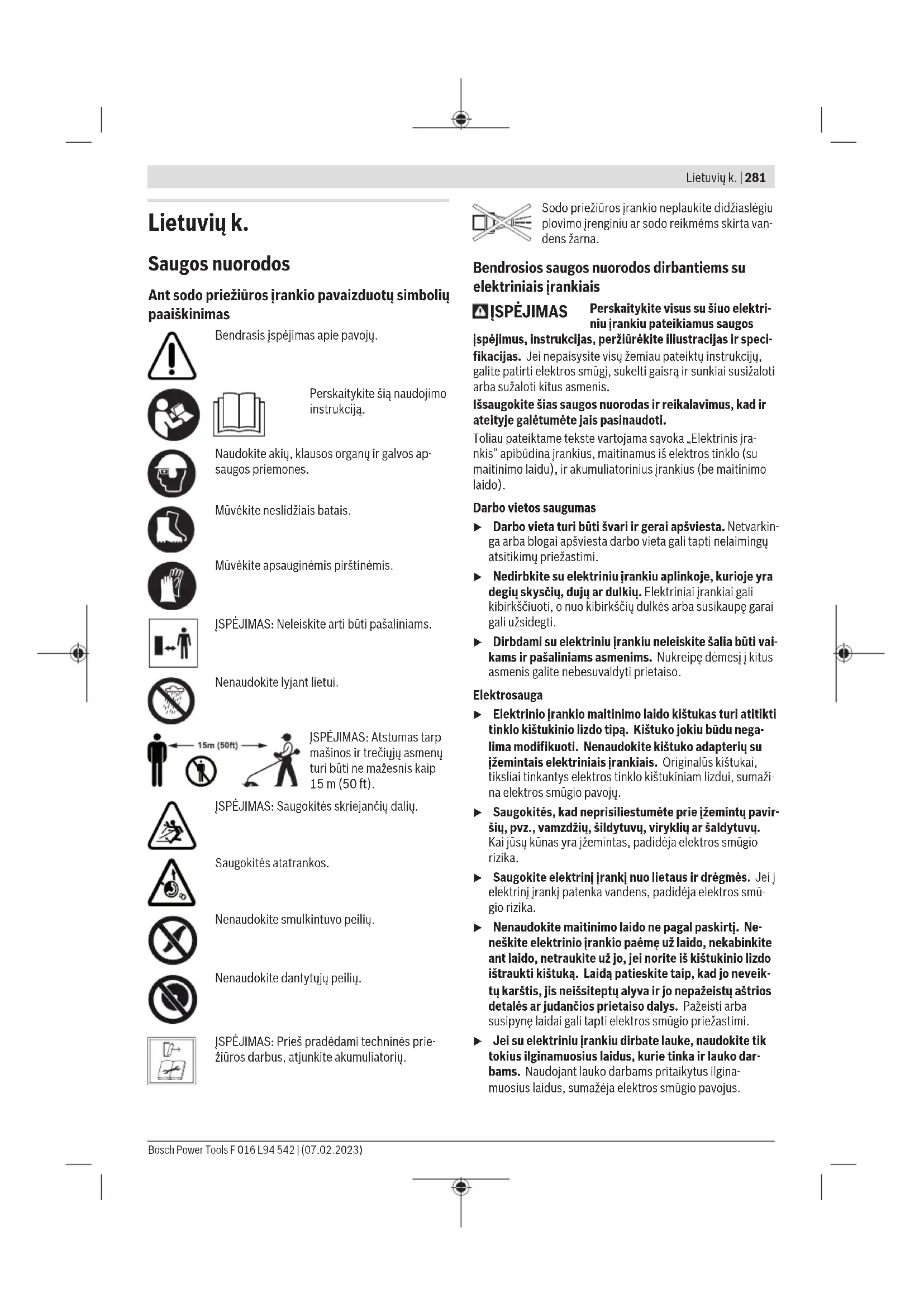 Naudokite pasiūlytą pjaunamąją vielutę Stipri vibracija Nutrūkusi pjaunamoji vielutė žr.pav. J F 016 L94 542 | (07.02.2023) Bosch Power ToolsLietuvių k. | 289 Simptomas Galima priežastis Šalinimas Pjovimo galvutės arba peilio disbalansas Pašalinkite galimus nešvarumus iš pjovimo galvu- tės. Patikrinkite pjovimo galvutę (žr. pav. M) ir ža- los atveju kreipkitės į Bosch klientų aptarnavimo skyrių Netinkamai įmontuota ritė / ašmenys Tinkamai įstatykite visas dalis (žr. pav. M) Netinkamai sumontuotas apsauginis diskas Tinkamai sumontuokite apsauginį gaubtą Atsilaisvinusi peilio montavimo veržlė Priveržkite peilio montavimo veržlę (20 Nm) (žr. pav. M) Užstrigimo šalinimo (Anti-Tangle) funkcija nepašalina blokavimo Elektrinis įrankis naudojamas netinkamai Tinkamai naudokite elektrinį įrankį ir kelis kartus iš eilės jį įjunkite ir išjunkite. Blokavimas per stiprus, ir sistema negali jo paša- linti automatiškai ir be rankinės pagalbos. Išimkite akumuliatorių ir rankiniu būdu pašalinkite blokavimą. Priežiūra ir servisas Techninė priežiūra, valymas ir sandėliavimas u Prieš pradėdami bet kokius sodo priežiūros įrankio tvarkymo darbus (pvz., techninės priežiūros, įrankio keitimo ar kt.), o taip pat norėdami transportuoti ar padėti sandėliuoti, iš sodo priežiūros įrankio išimkite akumuliatorių. Netyčia įjungus įjungimo-išjungimo jun- giklį iškyla susižalojimo pavojus. u Kad galėtumėte gerai ir saugiai dirbti, pasirūpinkite, kad gaminys ir jo ventiliacinės angos būtų švarūs. Prieš sandėliavimą nuvalykite ir atlikite gaminio priežiūros darbus. Ant sodo priežiūros įrankio nedėkite jokių daiktų. Gaminio niekada neapipurkškite vandeniu. Gaminio niekada nepanardinkite į vandenį. Gaminį laikykite saugioje, sausoje ir vaikams neprieinamoje vietoje. Ant gaminio nedėkite jokių kitų daiktų. Nepalikite gaminio ant žemės. Už jo galite užkliūti. Užtikrinkite, kad būtų tinkamai priveržtos visos veržlės, sraigtai ir varžtai, kad gaminys būtų saugus naudoti. Patikrinkite gaminį ir dėl saugumo pakeiskite susidėvėjusias ir pažeistas dalis. Įsitikinkite, kad keičiamos dalys yra Bosch pagamintos ar leistos naudoti. Gaminį draudžiama modifikuoti, bet kokia modifikacija gali sąlygoti sužalojimus. Pjovimo disko galandimas ir balansavimas Tinkamam pjovimo disko gandimui ir balansavimui reikia daug praktikos. Bosch rekomenduoja naudoti leidžiamą at- sarginį pjovimo diską. Atsarginį pjovimo diską galite įsigyti patvirtintame techninės priežiūros centre. Krūmapjovės transportavimas Transportuodami arba padėdami gaminį, ant peilio visada uždėkite tinkamą apsaugą. Krūmapjovę neškite viena ranka, gerai subalansavę už koto, pjovimo galvute į galą. Prieš transportavimą įtvirtinkite krūmapjovę, kad nevirstų ir nebūtų perstumta. Klientų aptarnavimo skyrius ir konsultavimo tarnyba Klientų aptarnavimo skyriuje gausite atsakymus į klausimus, susijusius su jūsų gaminio remontu, technine priežiūra bei at- sarginėmis dalimis. Detalius brėžinius ir informacijos apie at- sargines dalis rasite interneto puslapyje: www.bosch-pt.com Bosch konsultavimo tarnybos specialistai mielai pakonsul- tuos Jus apie gaminius ir jų papildomą įrangą. Ieškant informacijos ir užsakant atsargines dalis prašome bū- tinai nurodyti dešimtženklį gaminio numerį, esantį firminėje lentelėje. Lietuva Bosch įrankių servisas Informacijos tarnyba: (037) 713350 ļrankių remontas: (037) 713352 Faksas: (037) 713354 El. paštas: service-pt@lv.bosch.com Kitus techninės priežiūros skyriaus adresus rasite čia: www.bosch-pt.com/serviceaddresses Transportavimas Rekomenduojamų ličio jonų akumuliatorių gabenimui taiko- mos pavojingų krovinių gabenimą reglamentuojančių įstaty- mų nuostatos. Naudotojui akumuliatorius gabenti keliais lei- džiama be jokių apribojimų. Jei siunčiant pasitelkiami tretieji asmenys (pvz., oro transpo- rtas, ekspedijavimo įmonė), būtina atsižvelgti į pakuotei ir ženklinimui taikomus ypatingus reikalavimus. Būtina, kad rengiant siuntą dalyvautų pavojingų krovinių gabenimo spe- cialistas. Siųskite tik tokius akumuliatorius, kurių nepažeistas kor- pusas. Apklijuokite kontaktus ir supakuokite akumuliatorių taip, kad jis pakuotėje nejudėtų. Taip pat laikykitės ir esamų papildomų nacionalinių taisyklių. Bosch Power Tools F 016 L94 542 | (07.02.2023)290 | Lietuvių k. Šalinimas Gaminiai, akumuliatoriai, papildoma įranga ir pakuotės turi būti ekologiškai utilizuojami. Gaminių, akumuliatorių / baterijų nemeskite į buitinių atliekų konteinerius! Tik ES šalims: Pagal Europos direktyvą 2012/19/ES, naudoti nebetinkami gaminiai ir, pagal Europos direktyvą 2006/66/EB, pažeisti ir išeikvoti akumuliatoriai / baterijos turi būti surenkami atski- rai ir perdirbami aplinkai nekenksmingu būdu. Netinkamai pašalintos elektros ir elektroninės įrangos atlie- kos dėl galimų pavojingų medžiagų gali turėti žalingą poveikį aplinkai ir žmonių sveikatai. Akumuliatoriai ir baterijos: Ličio jonų: prašome laikytis transportavimo skyriuje pateiktų nuorodų (žr. „Transportavimas“, Puslapis289). F 016 L94 542 | (07.02.2023) Bosch Power Toolsيبرع | 291