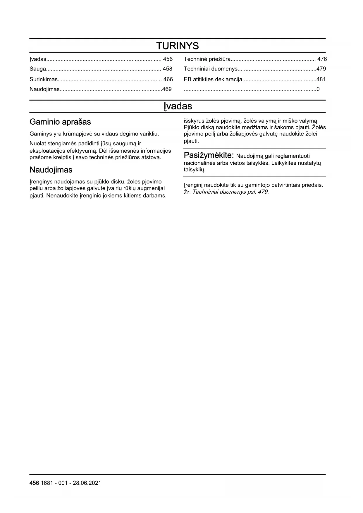 Simboliai ant gaminio ĮSPĖJIMAS! Šis įrenginys pavojingas. Nerūpestingai arba netinkamai naudojant įrenginį gali būti sužeistas ar netgi žūti operatorius arba pašaliniai asmenys. Kad nebūtų sužeistas operatorius arba pašaliniai asmenys, perskaitykite ir laikykitės visų naudojimo instrukcijoje pateiktų saugumo nurodymų. 1681 - 001 - 28.06.2021 457Prieš naudodami, atidžiai perskaitykite naudojimo instrukciją ir įsitikinkite, kad viską gerai supratote. Vietose, kur ant jūsų gali užkristi daiktų, dėvėkite apsauginį šalmą. Naudokite patvirtintas apsaugines ausines. Naudokite patvirtintas akių apsaugos priemones. Naudokite patvirtintas apsaugines pirštines. Avėkite patvarius, neslystančius batus. Iš įrenginio gali išskrieti pašaliniai objektai, kurie gali sužeisti. Didžiausiasis galios atidavimo veleno greitis.